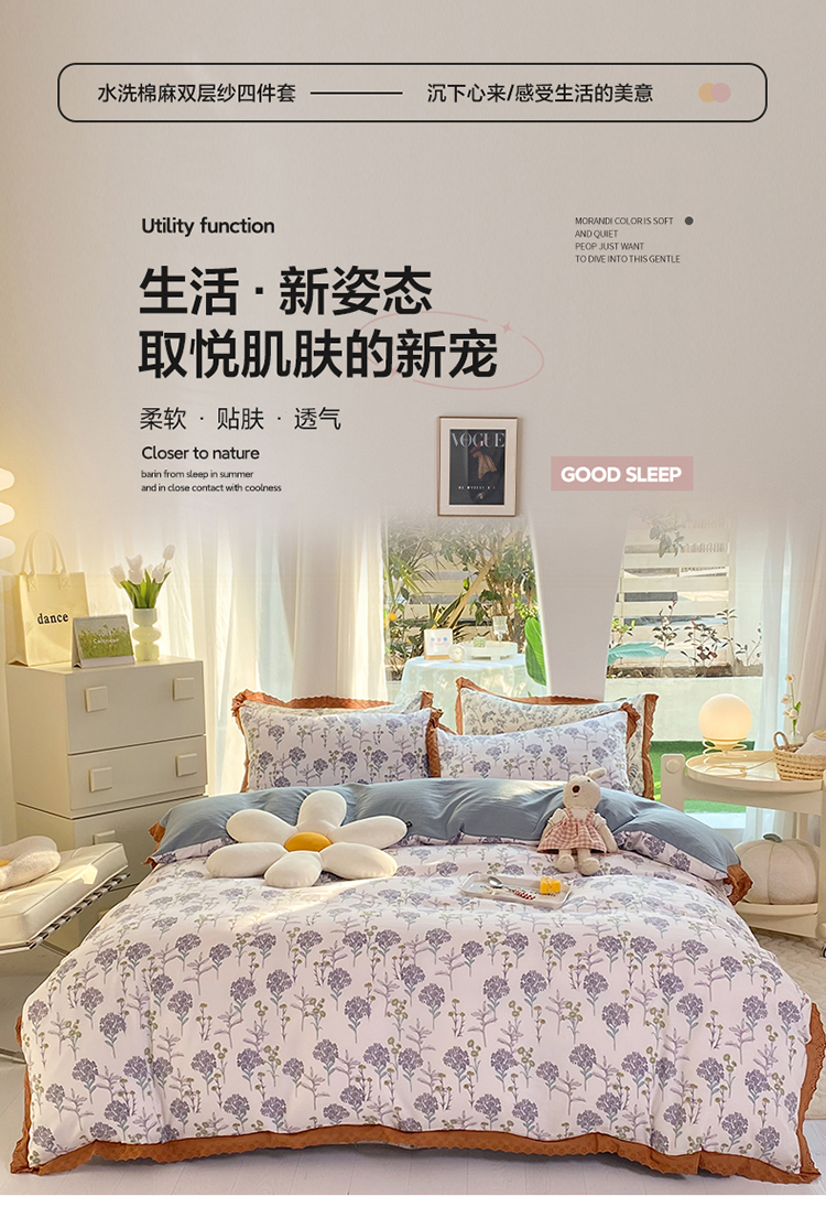(总)艾米 2023新款水洗棉麻双层纱系列四件套,暗香,饼干熊,菠萝兔,沉香,繁花,芳华,花海,花满夫橘色,快乐熊,流年,梦萝,千寻,牵牛花豆沙,牵牛花蓝,水墨,四叶草,童趣乐园,薰衣草豆沙,薰衣草紫,月野