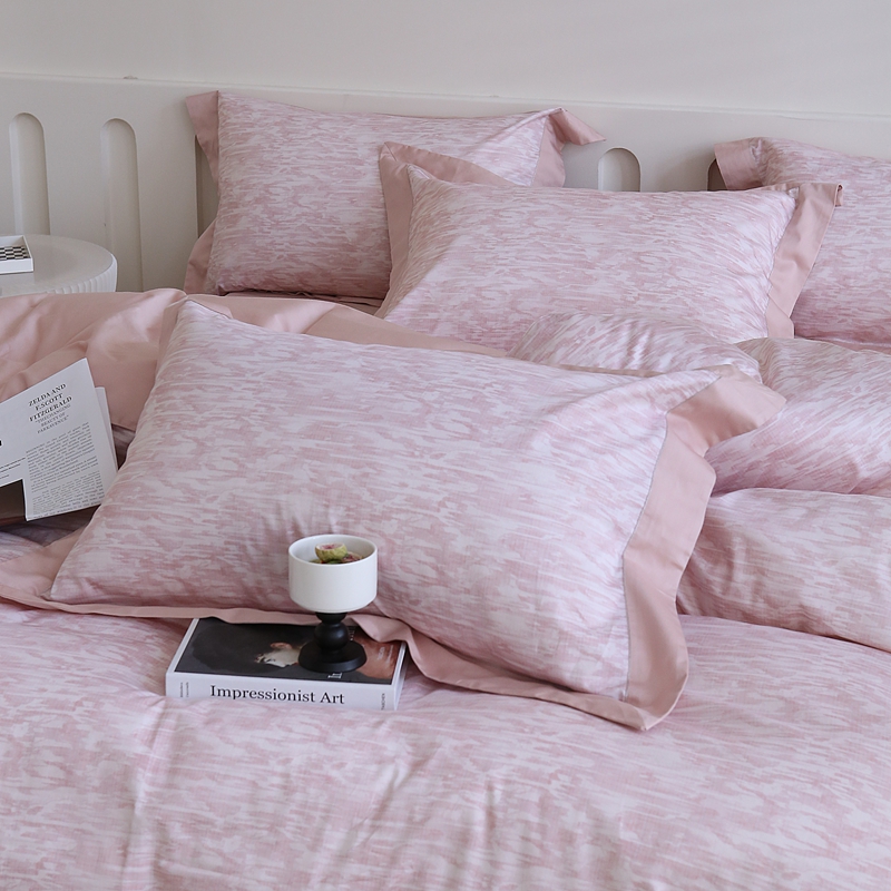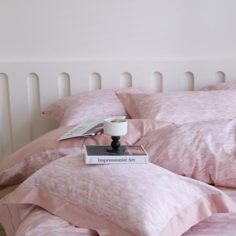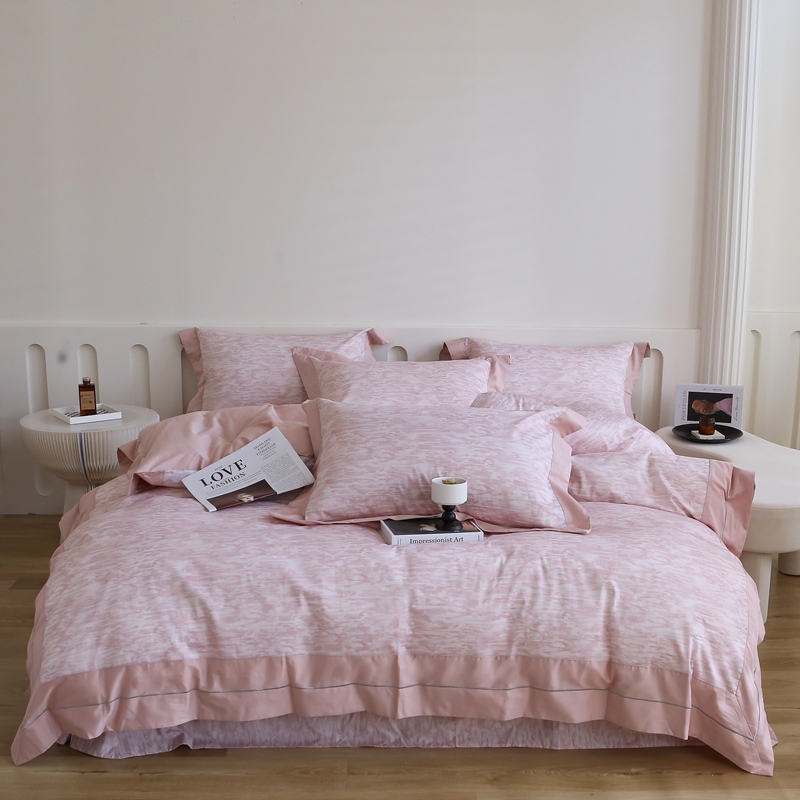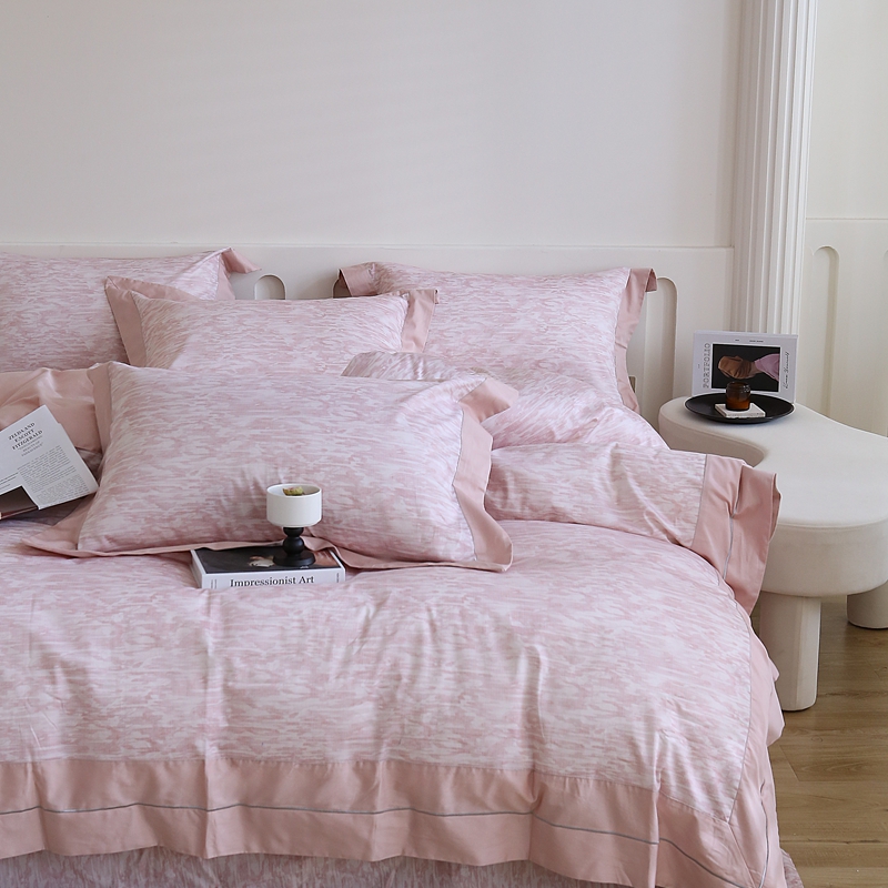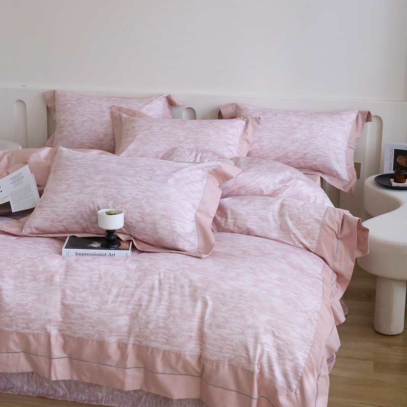 榻尚家居 2023新款数码印花纯棉贡缎长绒棉拼接款工艺四件套 雅静粉