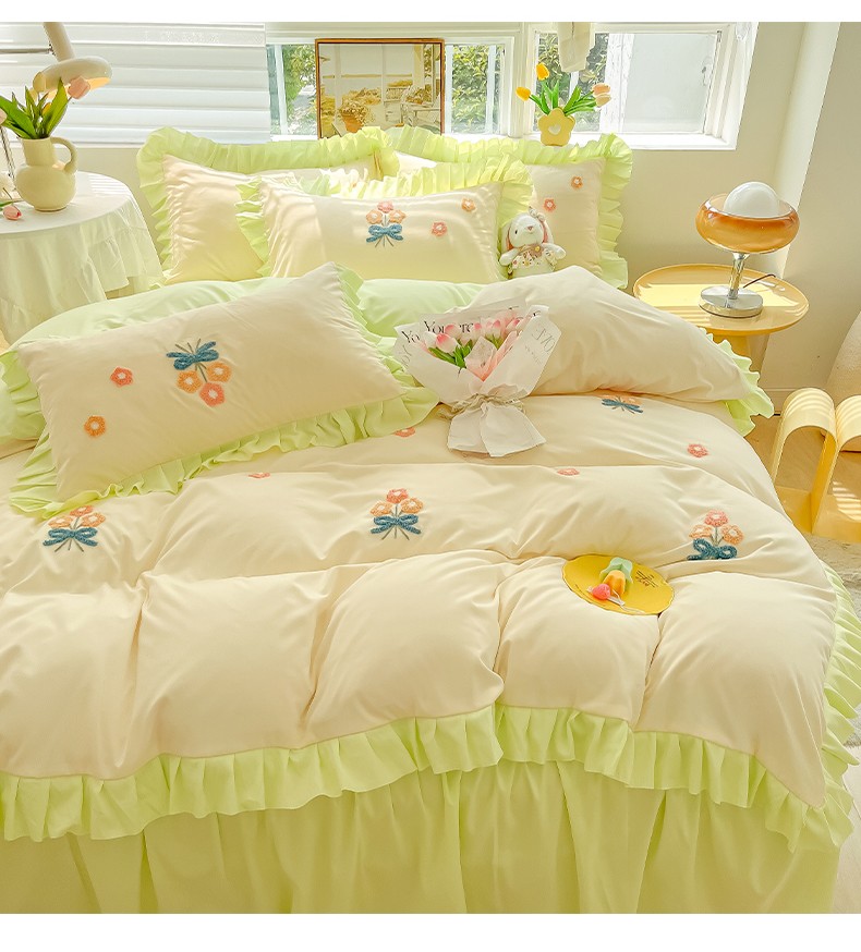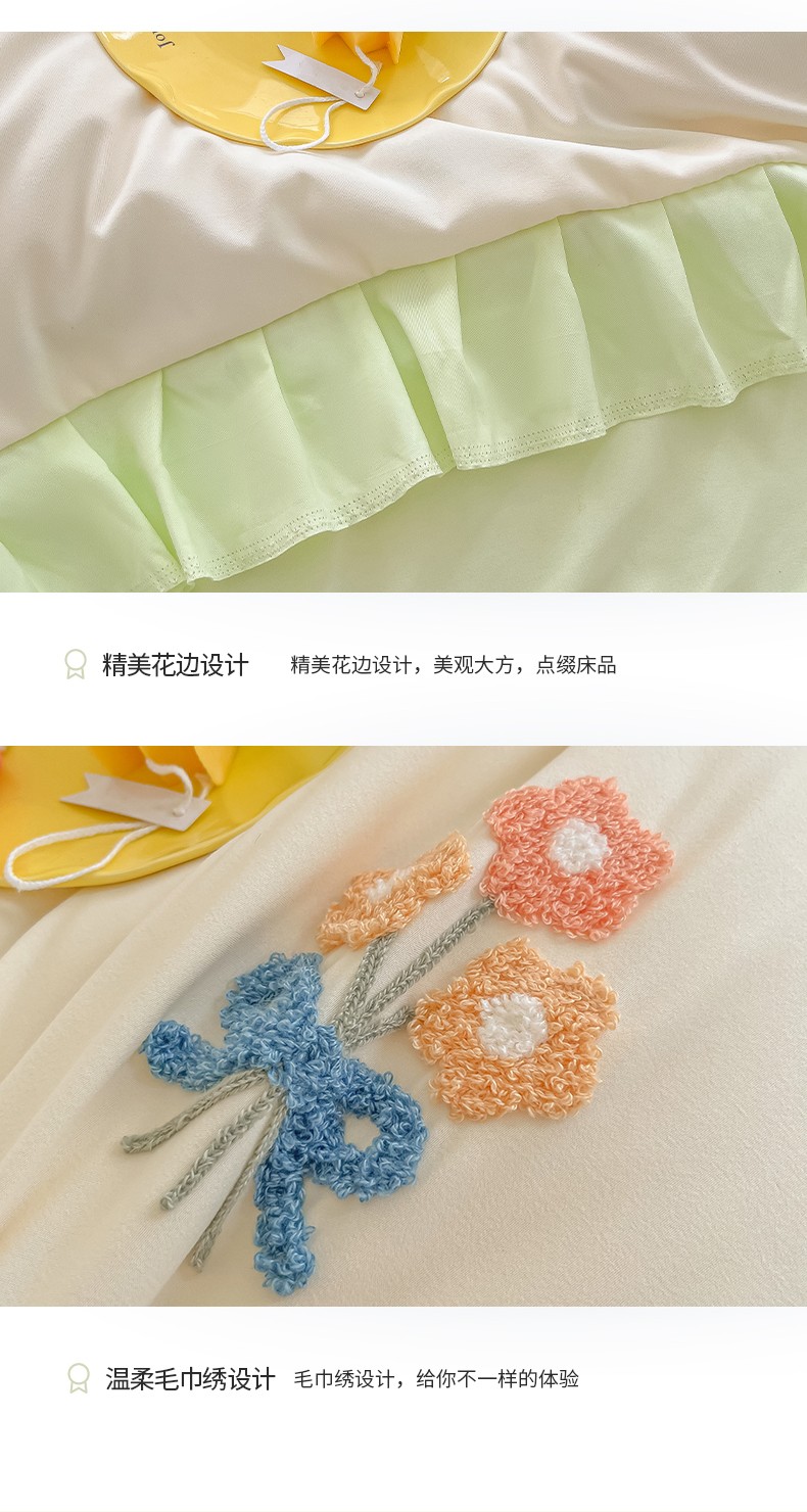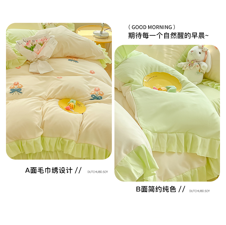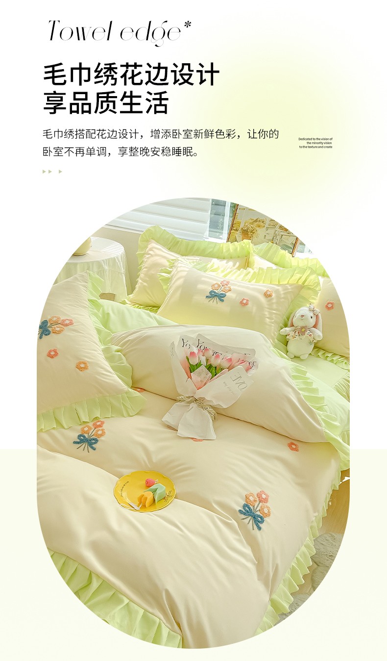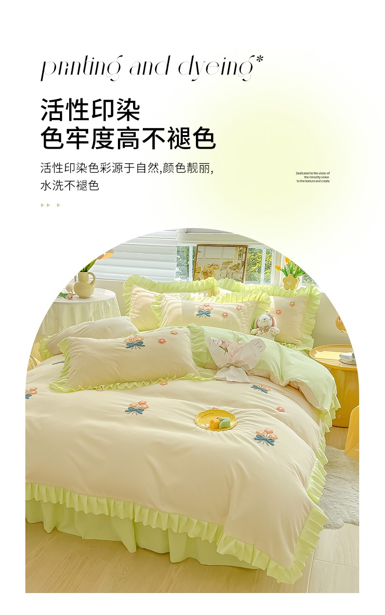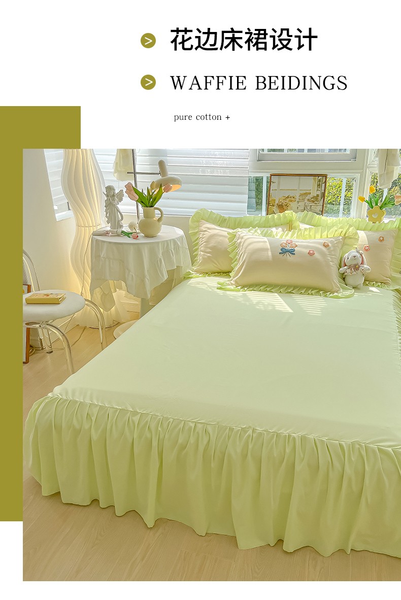 当前位置: 91家纺网 > 商品网购 > 床品套件 > 四件套 > 毛巾绣四件套 > 韩都 2023直播韩版绣花床单床裙四件套-思语 思语-青草绿