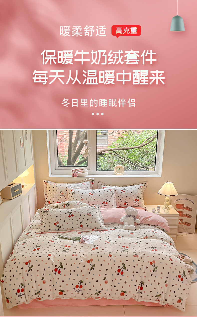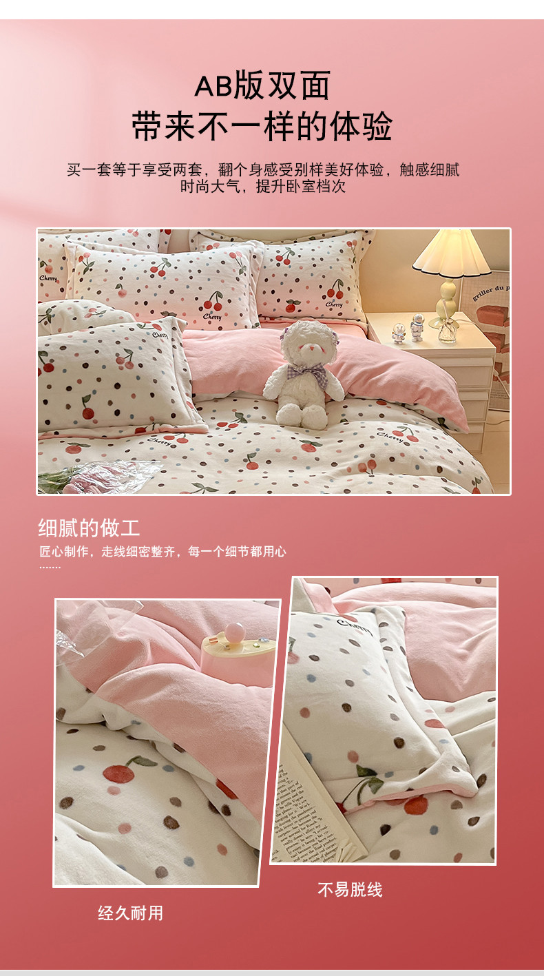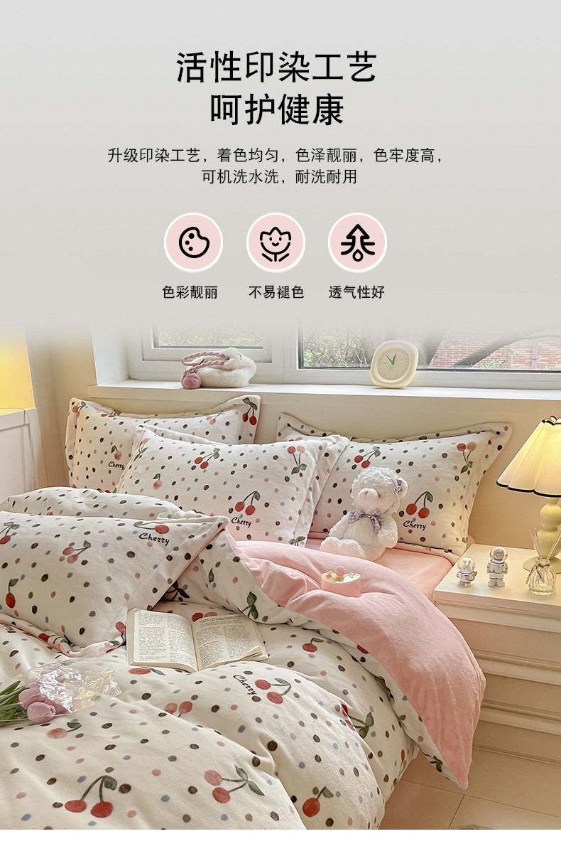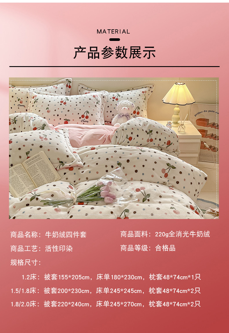 商品名称:金丝鸟家纺 2023新款220g全消光印花款牛奶绒四件套 樱桃点点
