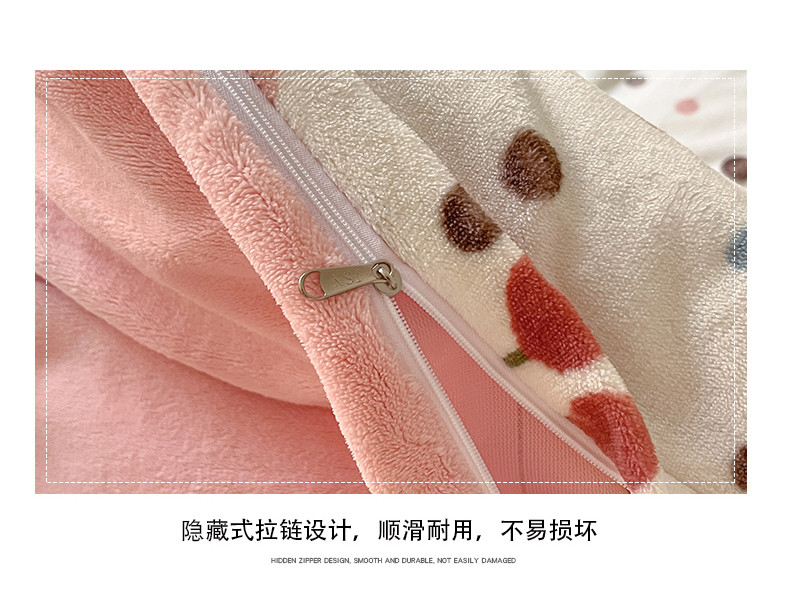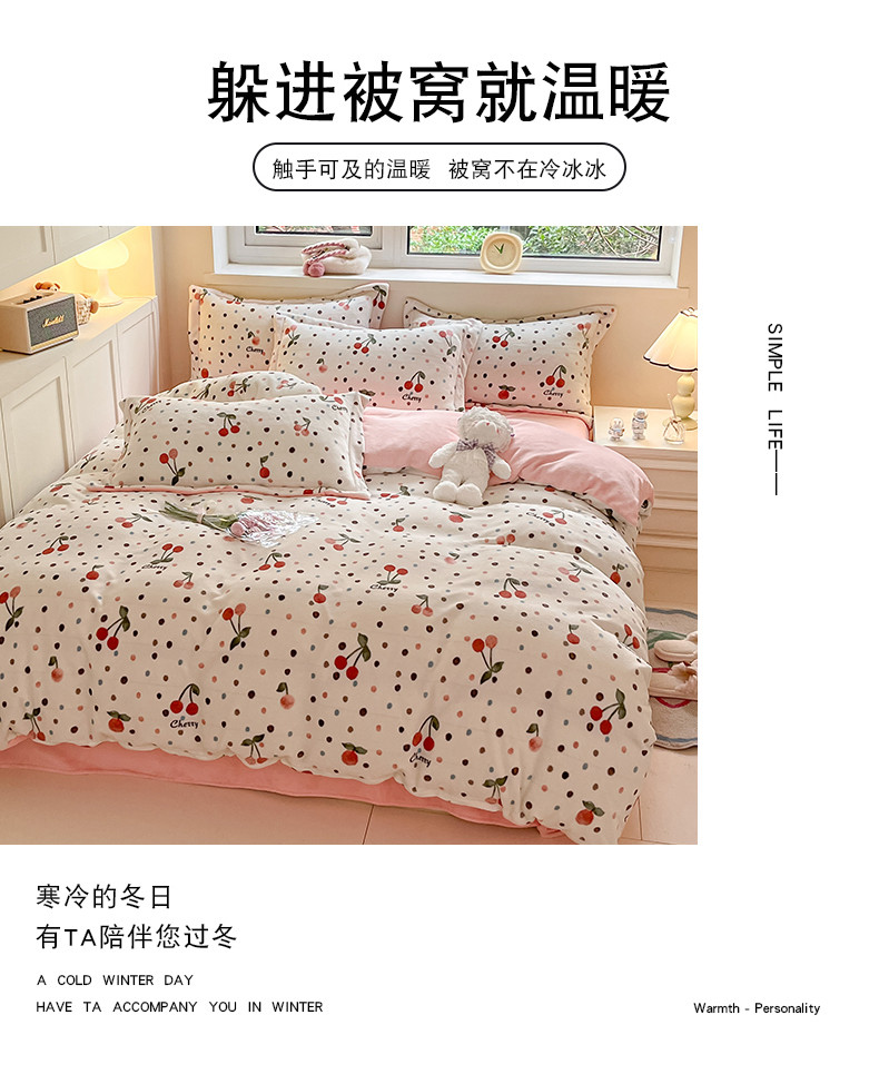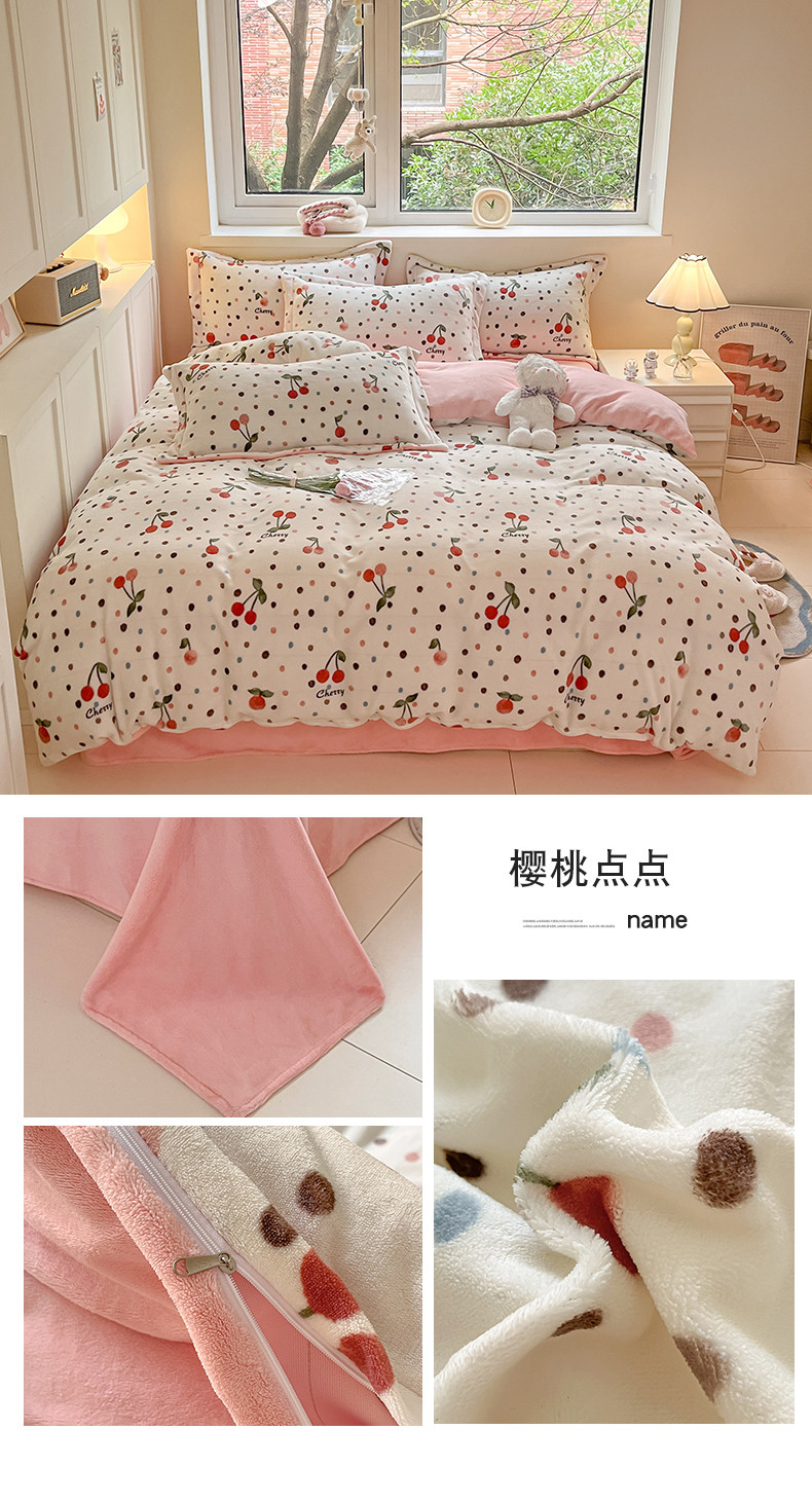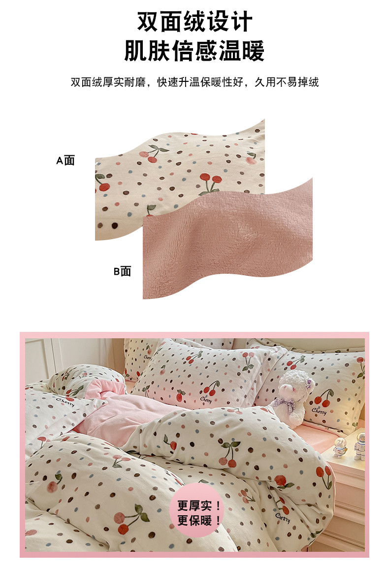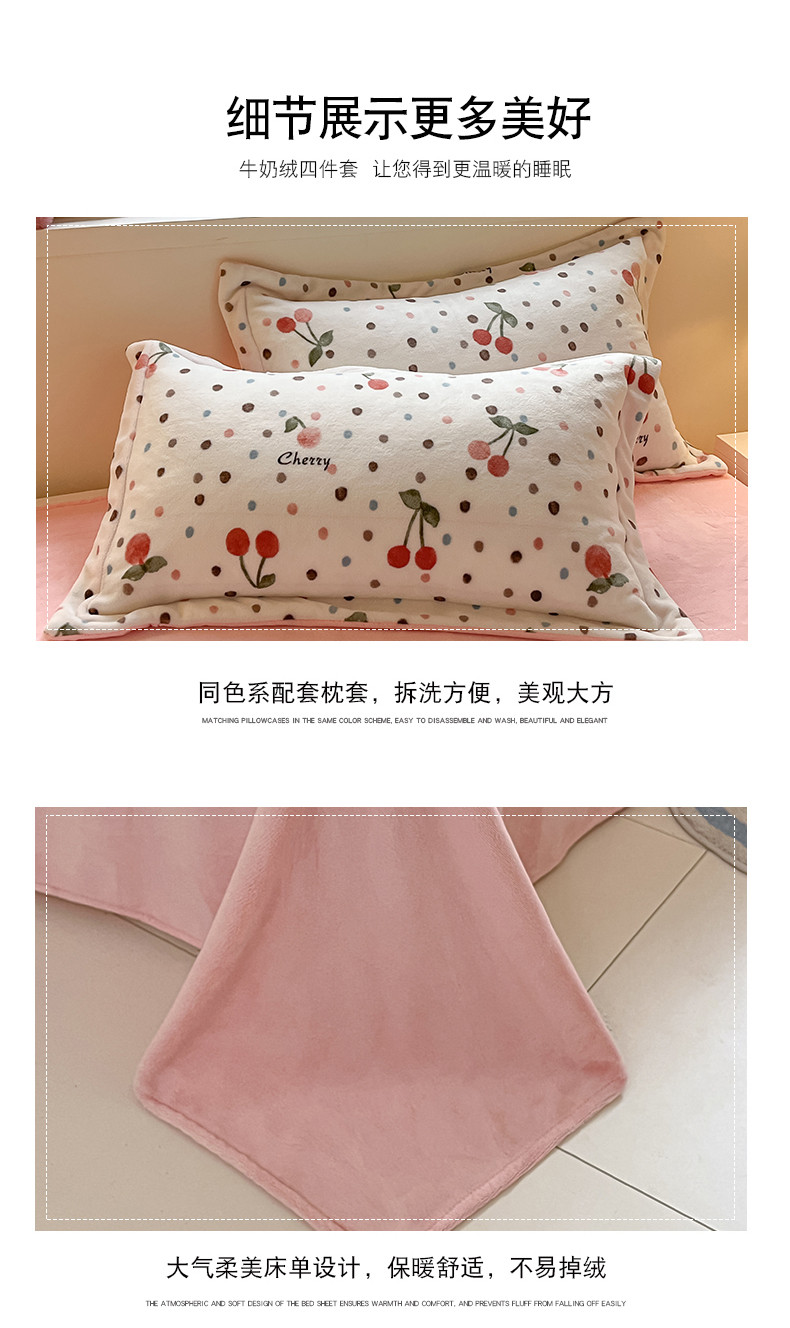 商品名称:金丝鸟家纺 2023新款220g全消光印花款牛奶绒四件套 樱桃点点