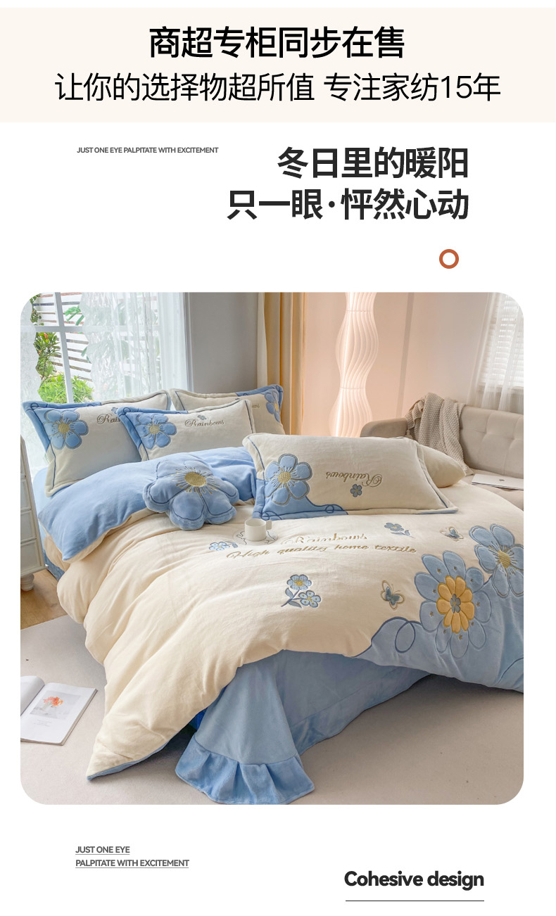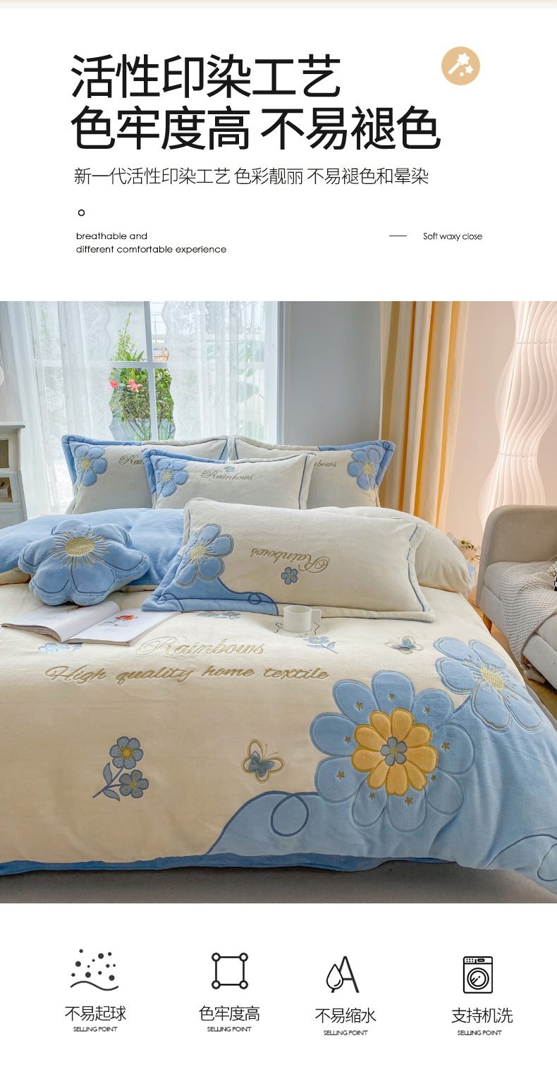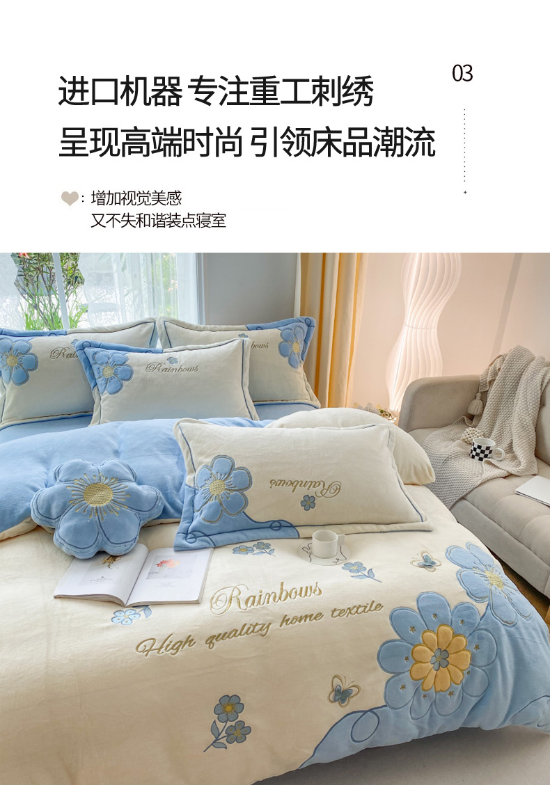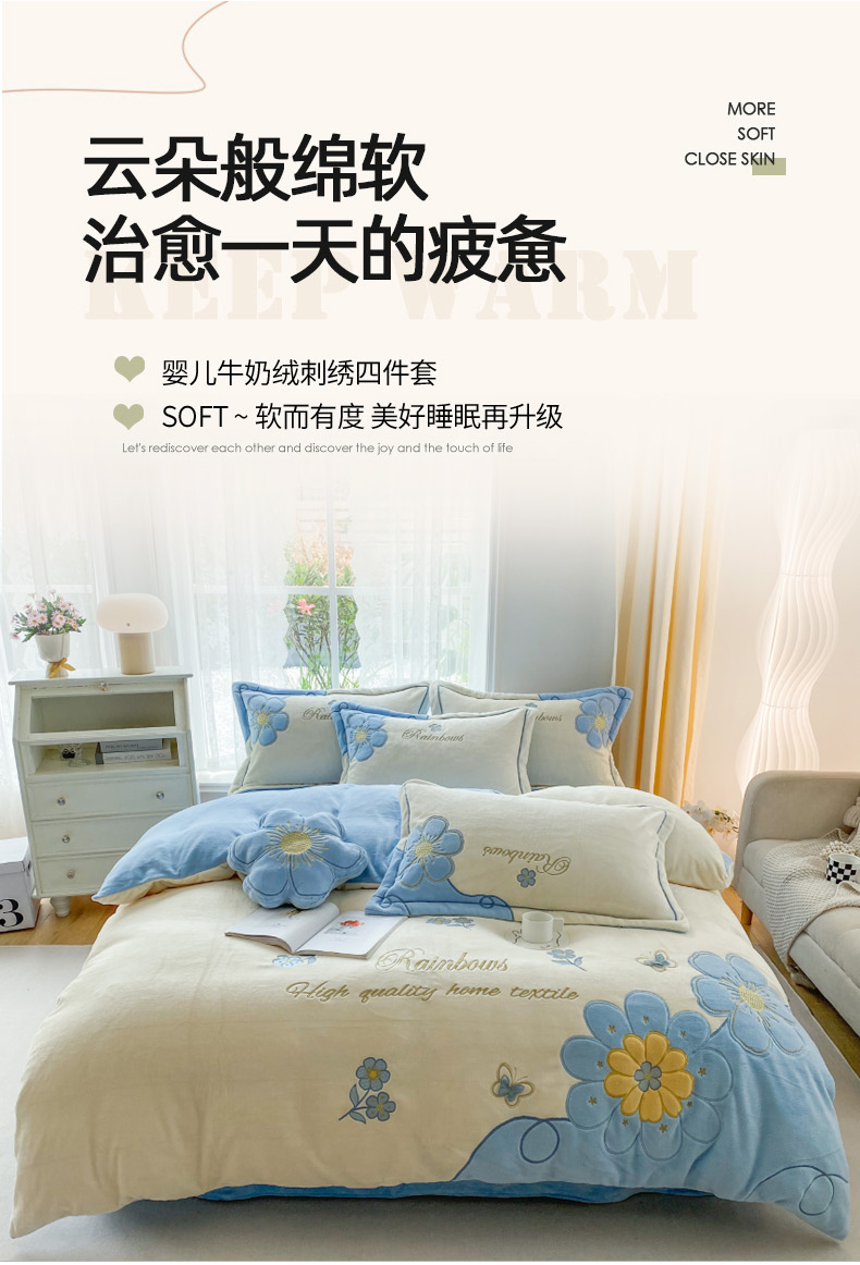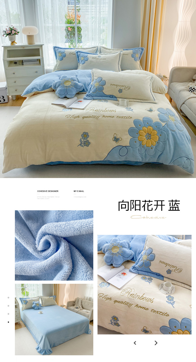 商品名称:金窝窝家纺 2024新款重工刺绣280克A类婴儿牛奶绒刺绣四件套系列-向阳花开 向阳花开—蓝