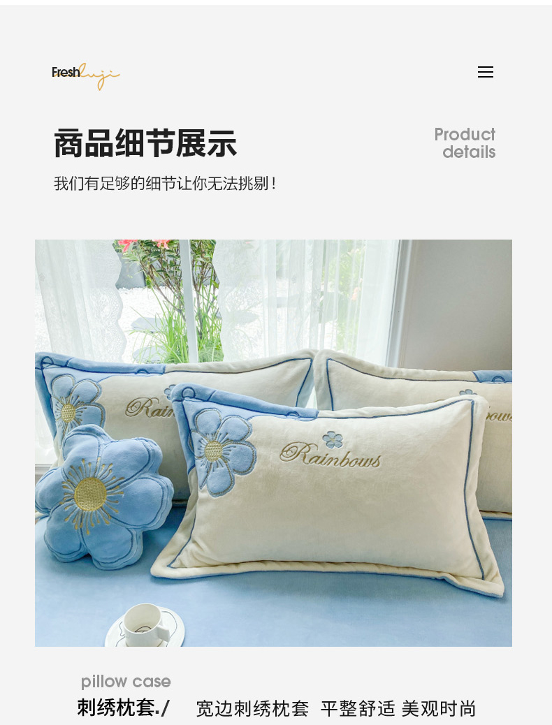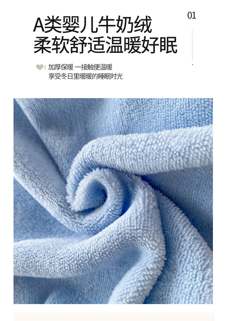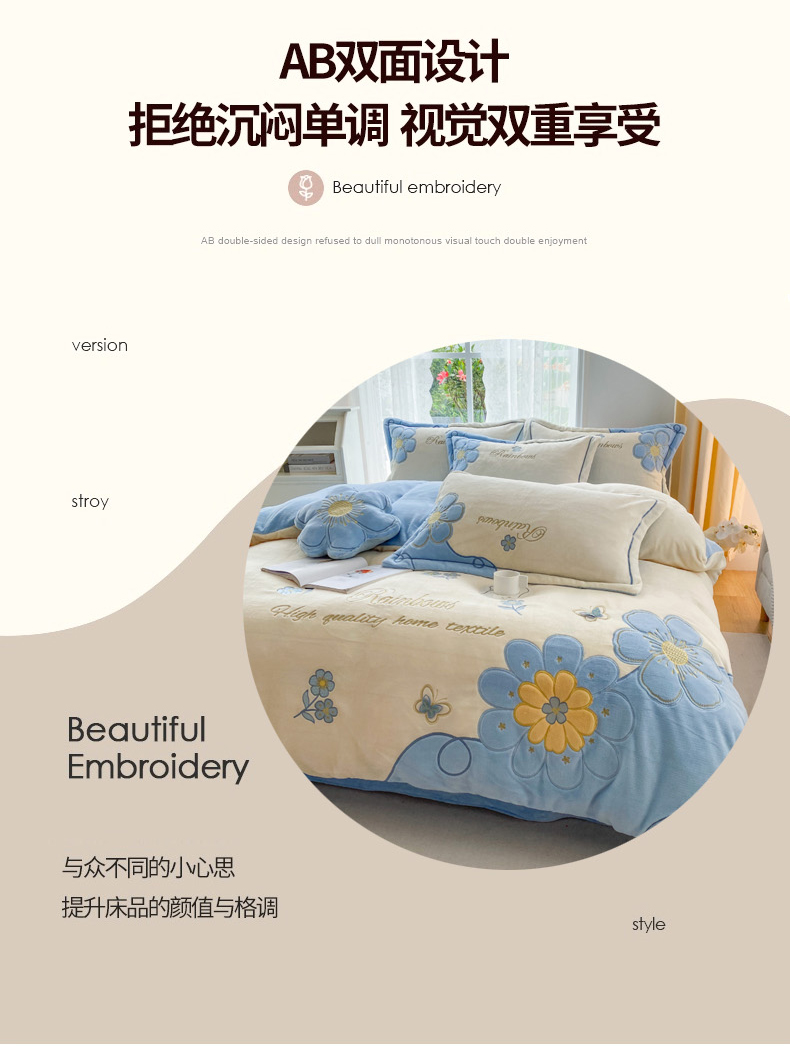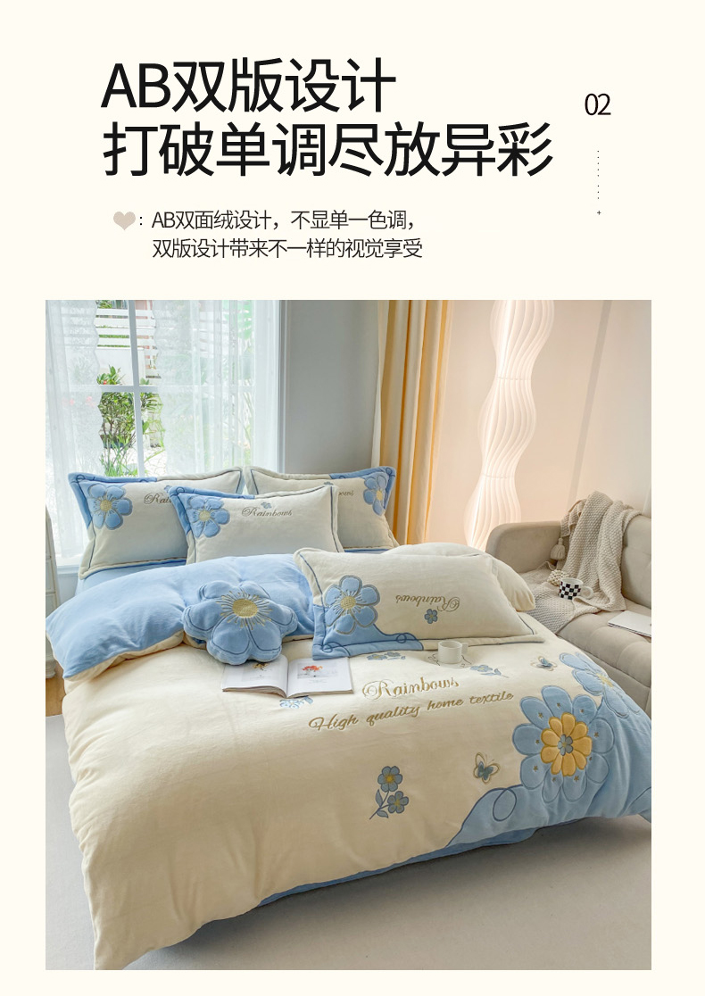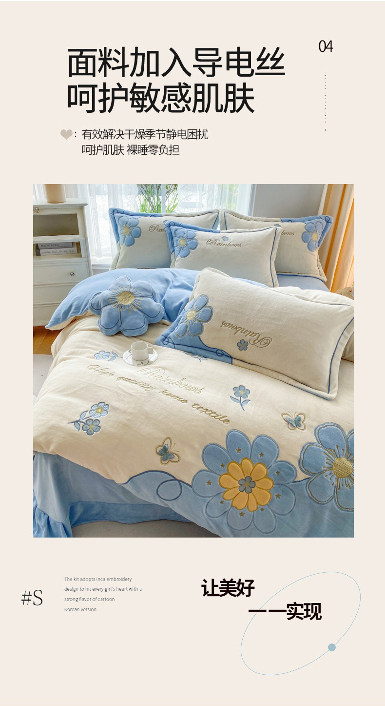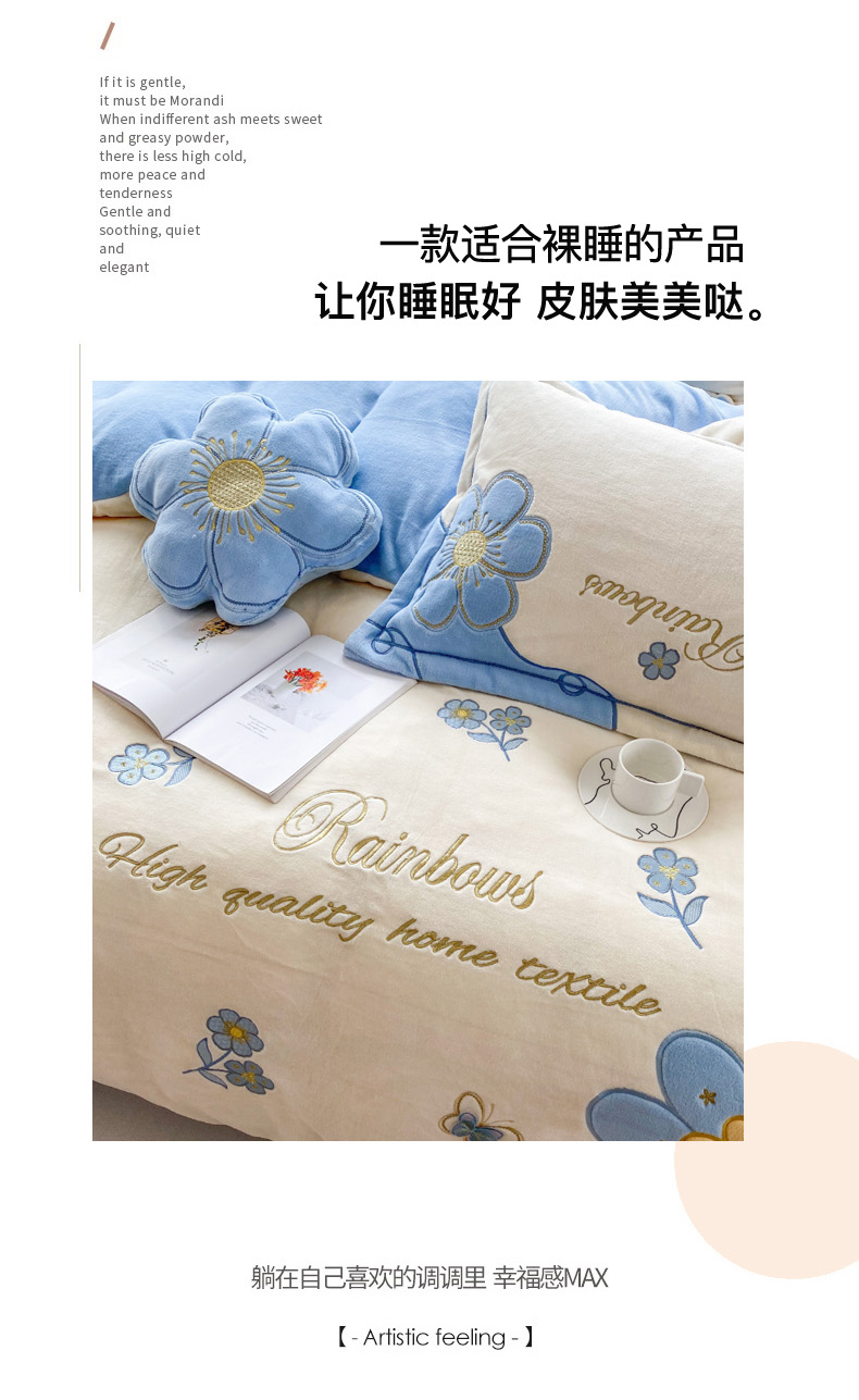 商品名称:金窝窝家纺 2024新款重工刺绣280克A类婴儿牛奶绒刺绣四件套系列-向阳花开 向阳花开—蓝