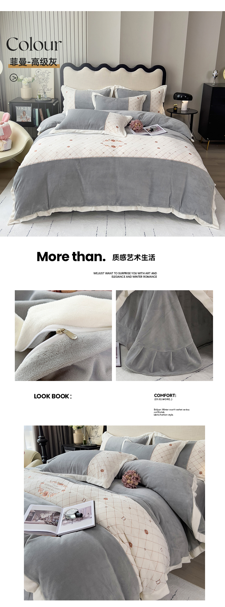 绒世界 2024秋冬高端刺绣菲曼牛奶绒四件套 菲曼-高级灰