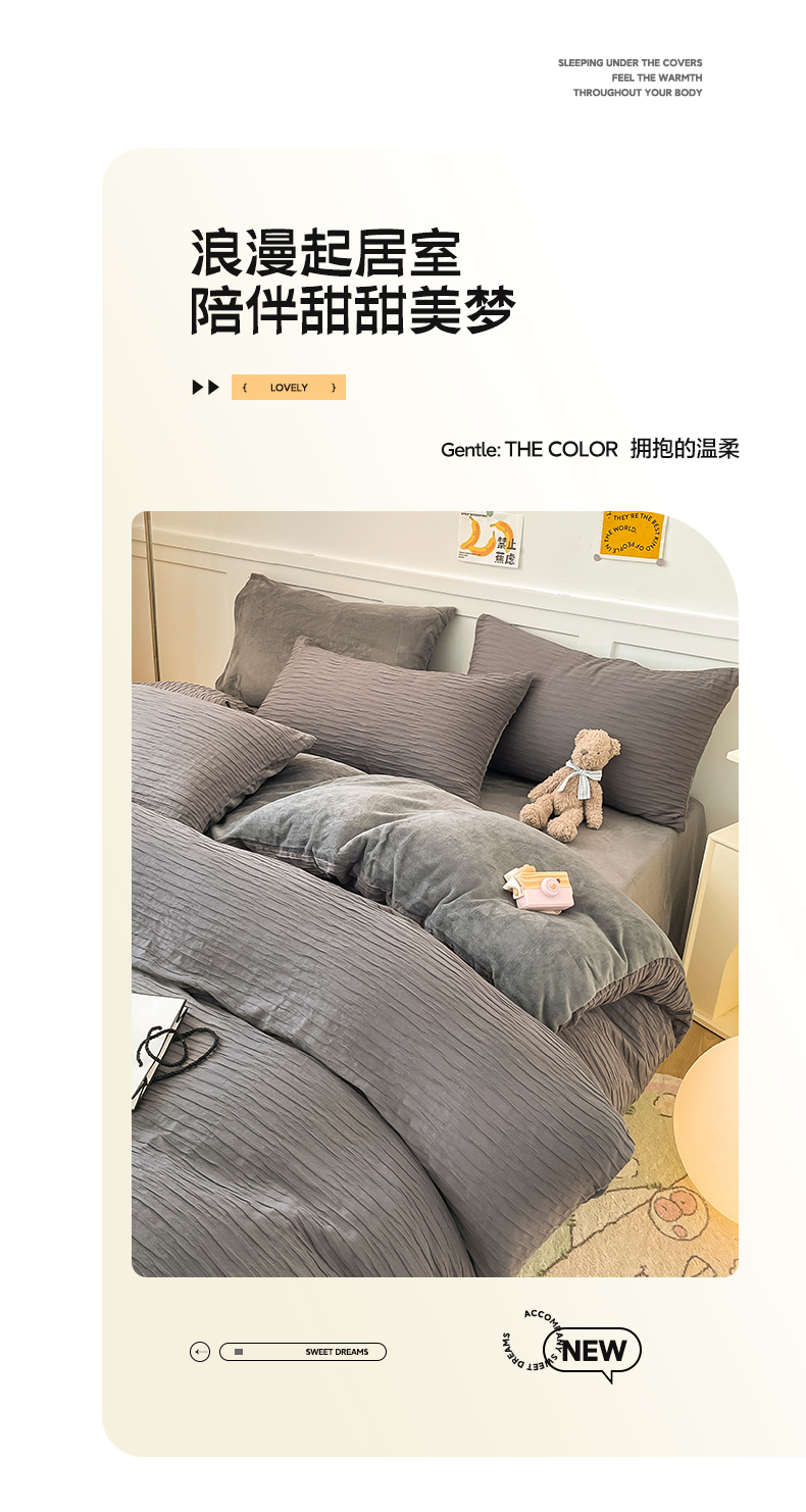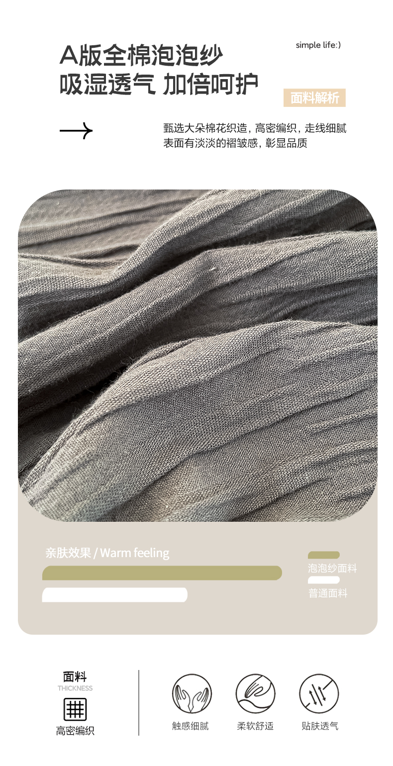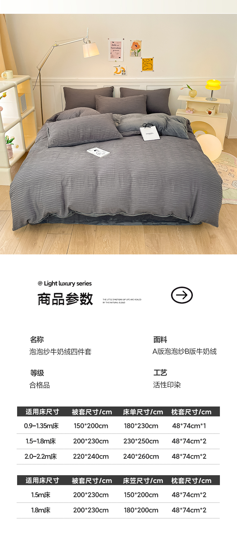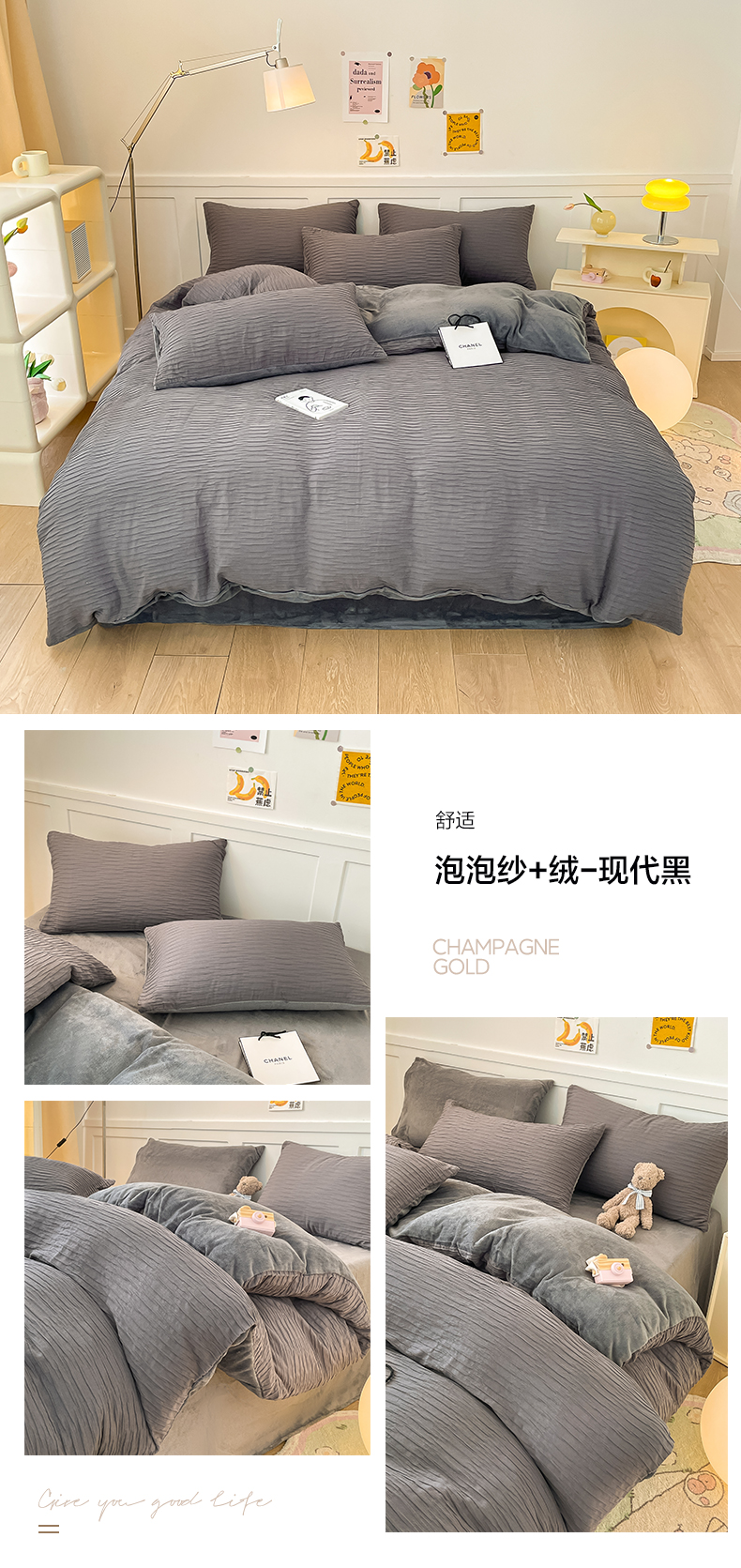 商品名称:雅居纺家纺 2023新款全棉泡泡纱牛奶绒四件套 泡泡纱+绒-现代黑