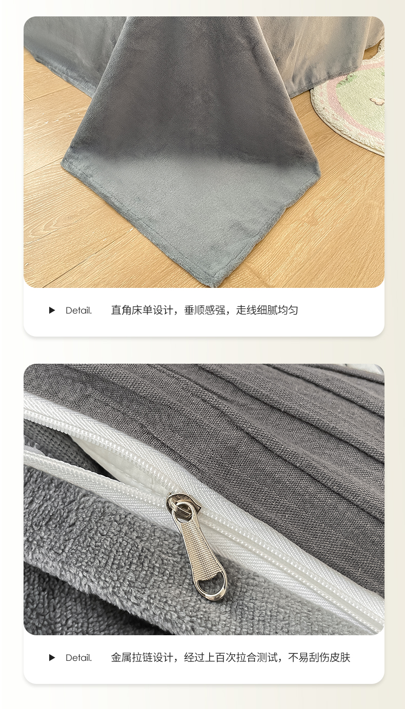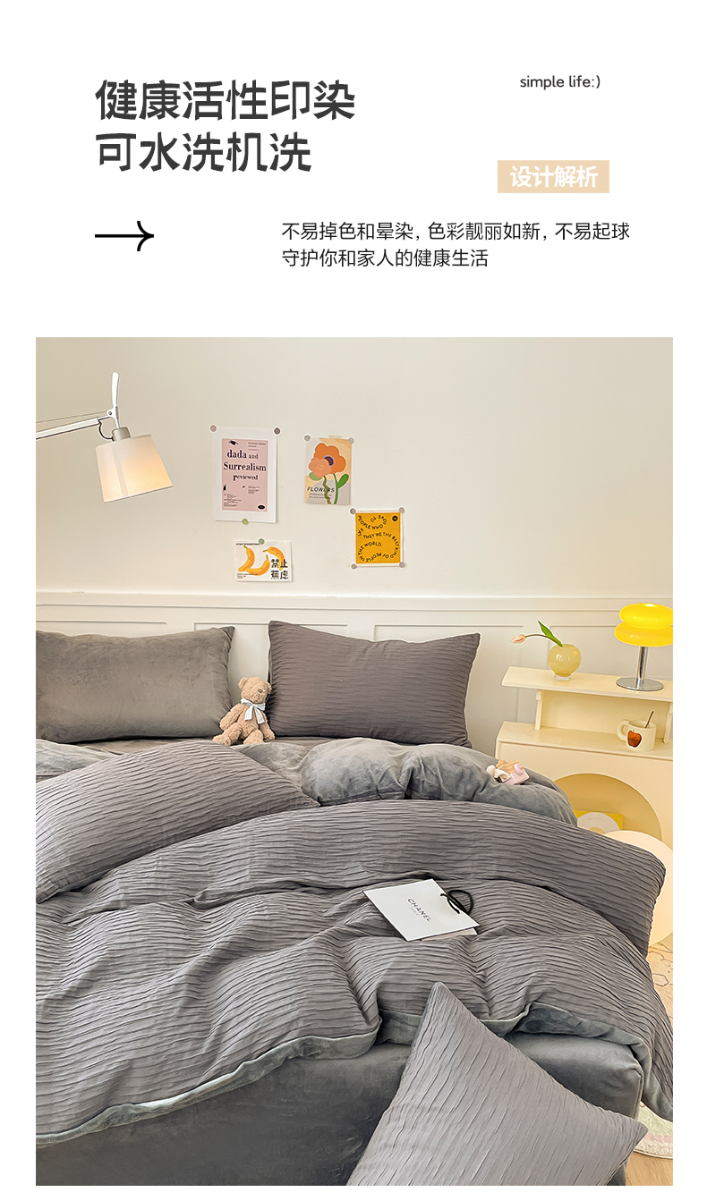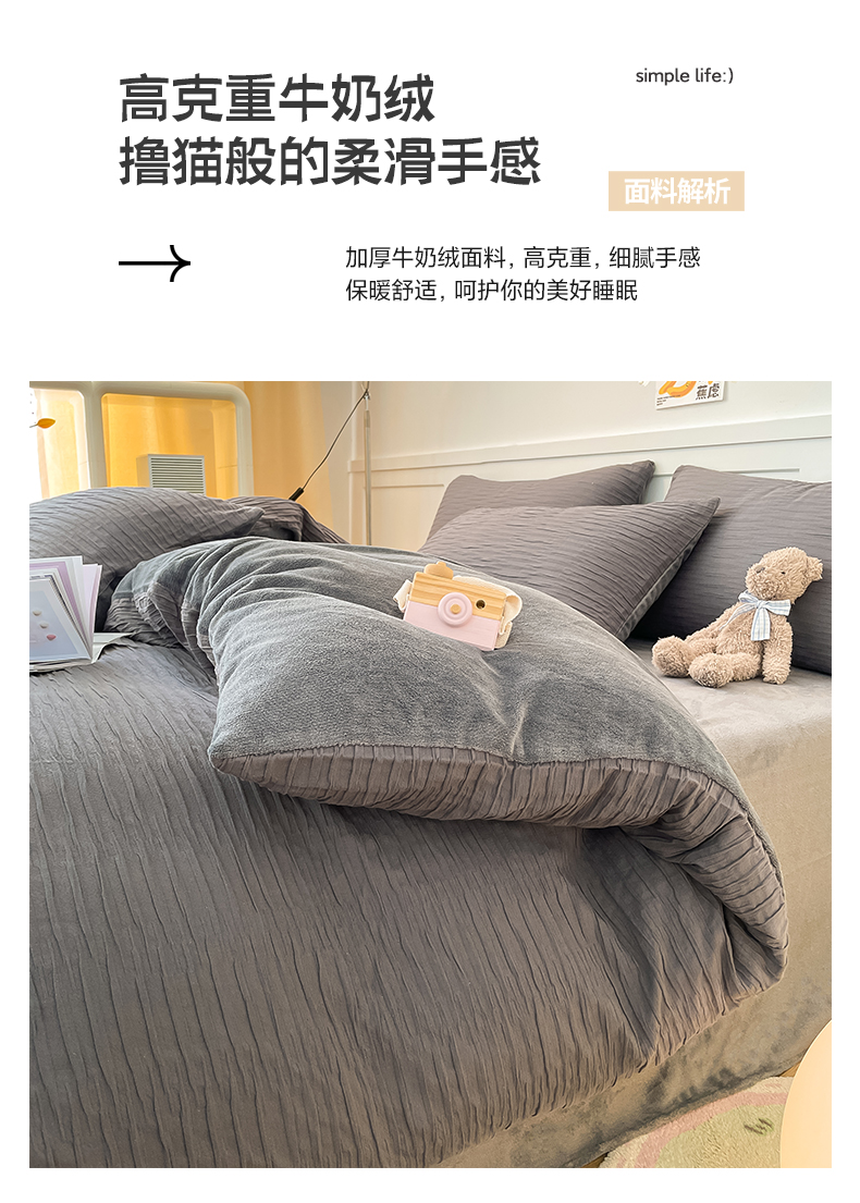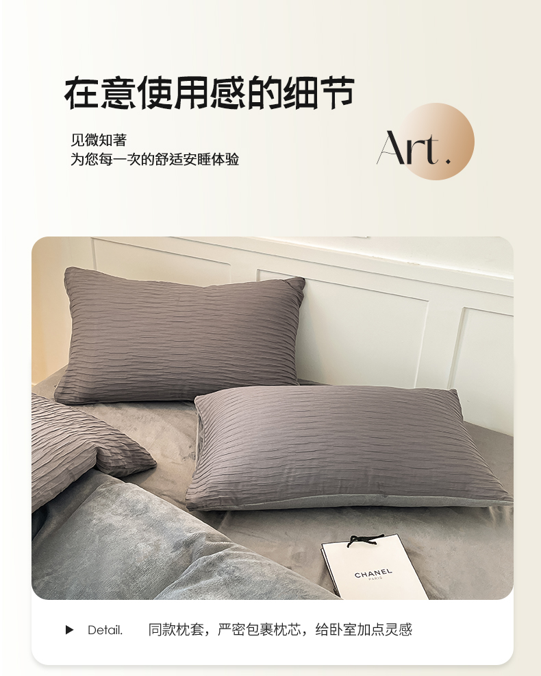 商品名称:雅居纺家纺 2023新款全棉泡泡纱牛奶绒四件套 泡泡纱+绒-现代黑