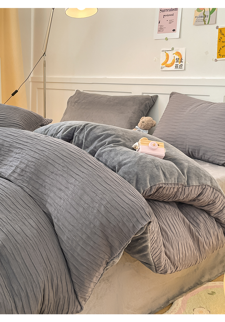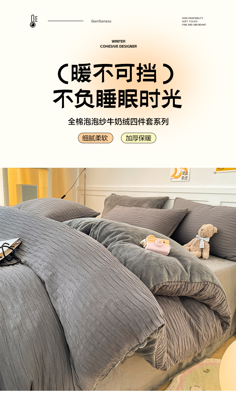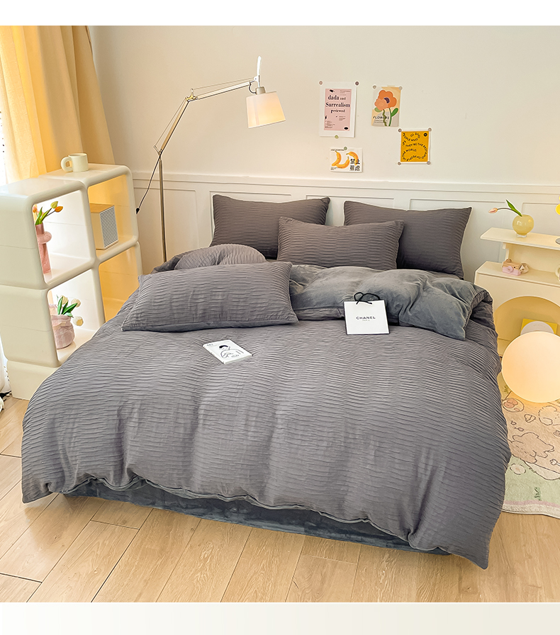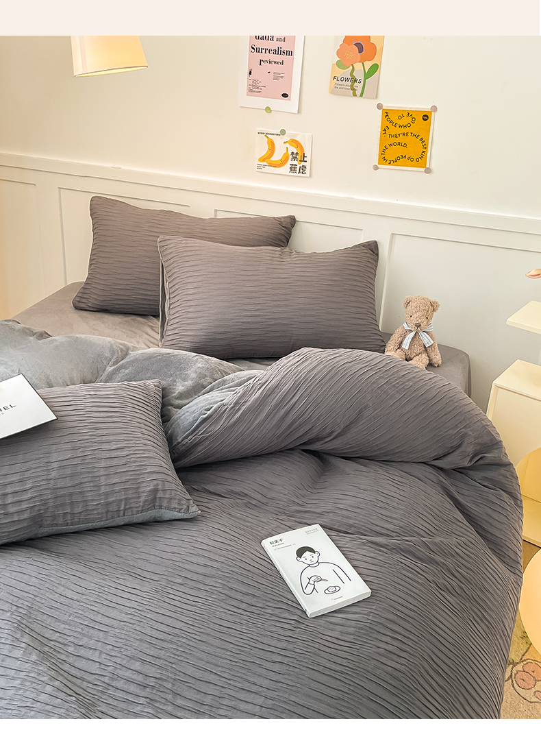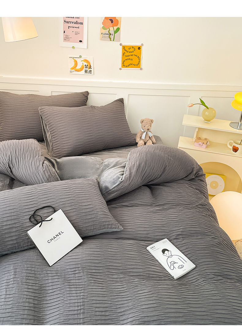雅居纺家纺 2023新款全棉泡泡纱牛奶绒四件套 泡泡纱+绒-现代黑