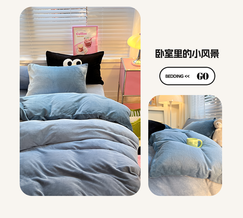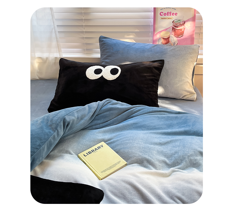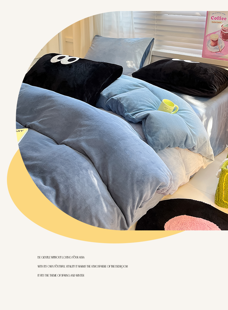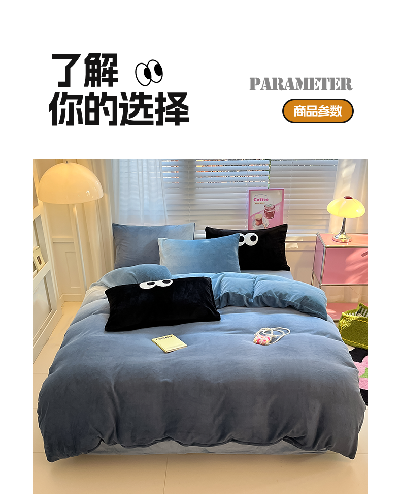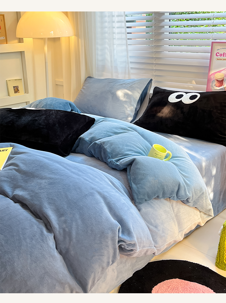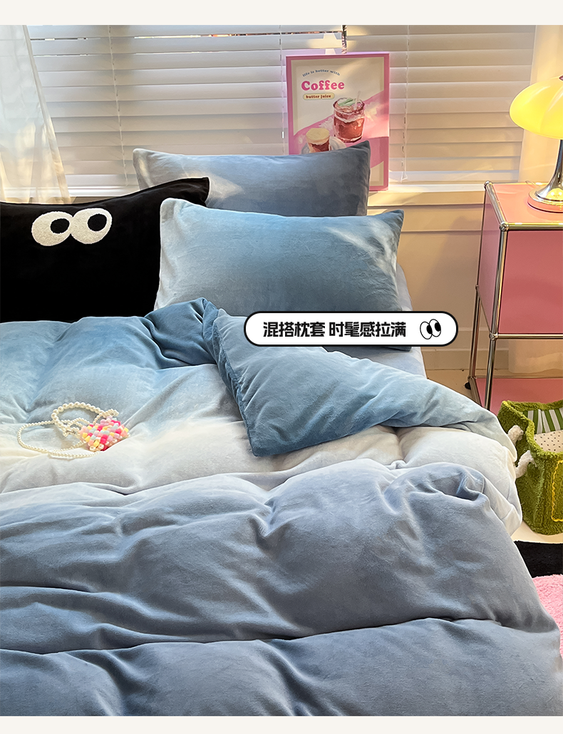 商品名称:雅居纺家纺 2023新款毛巾绣混搭牛奶绒四件套 渐变混搭蓝