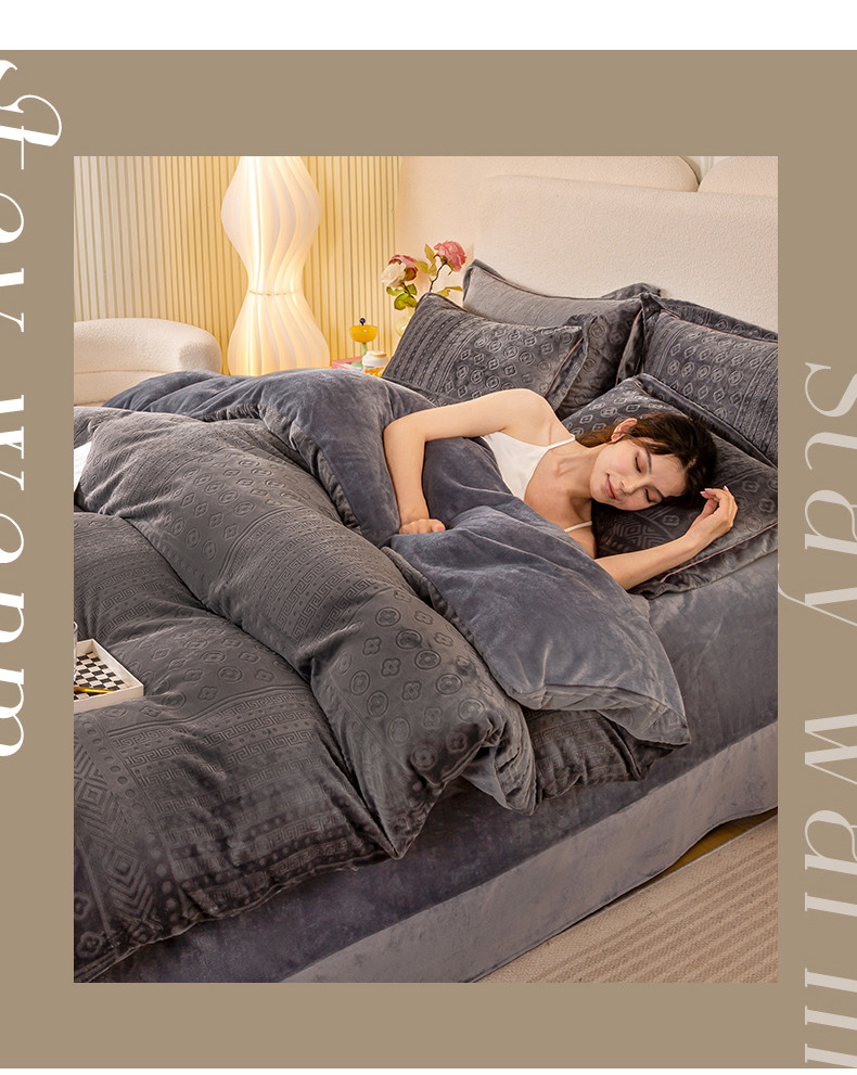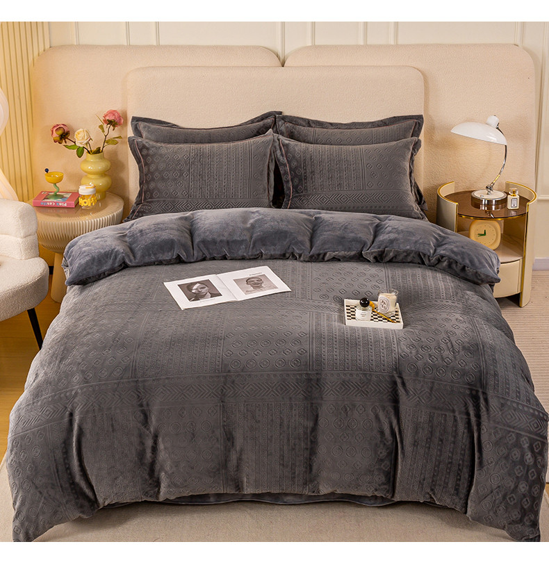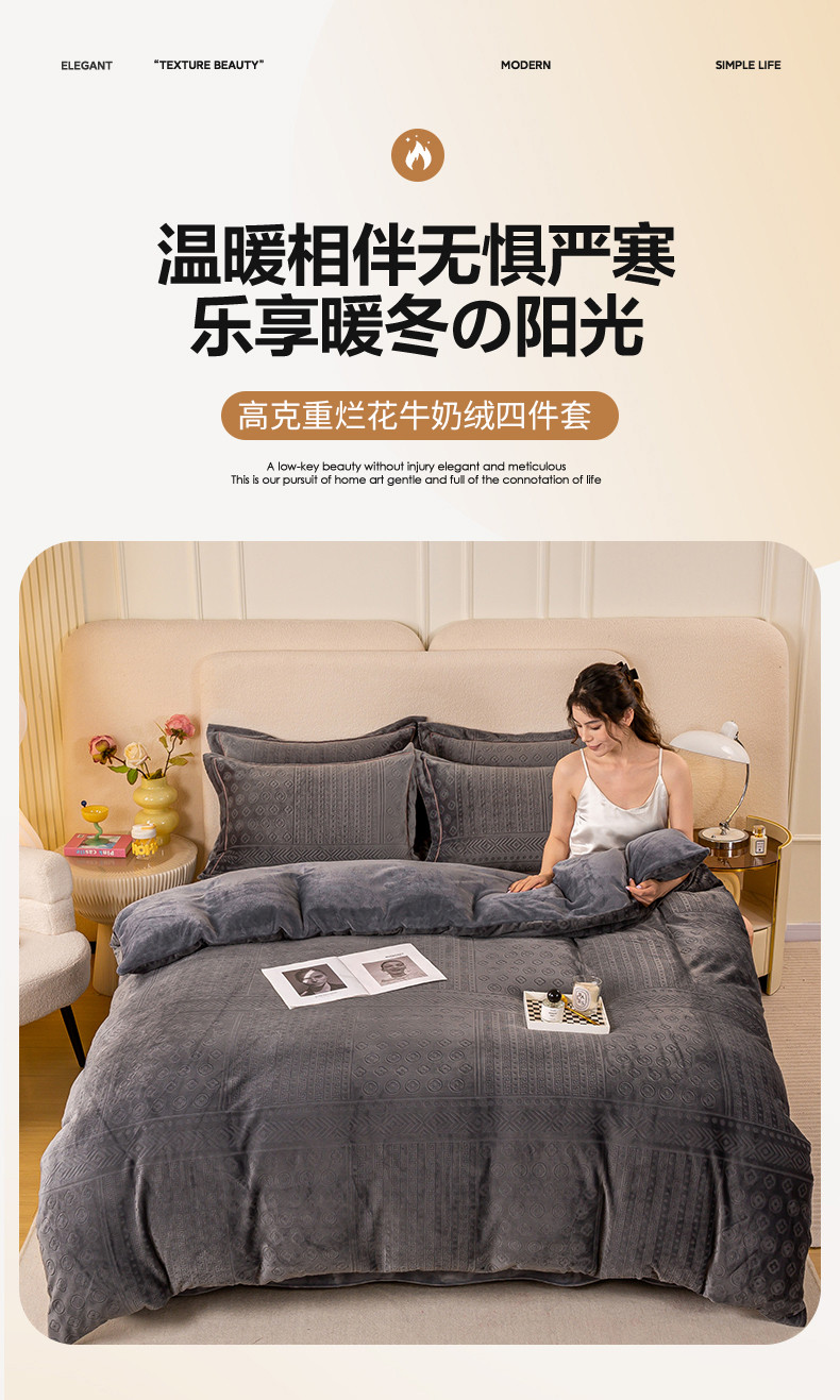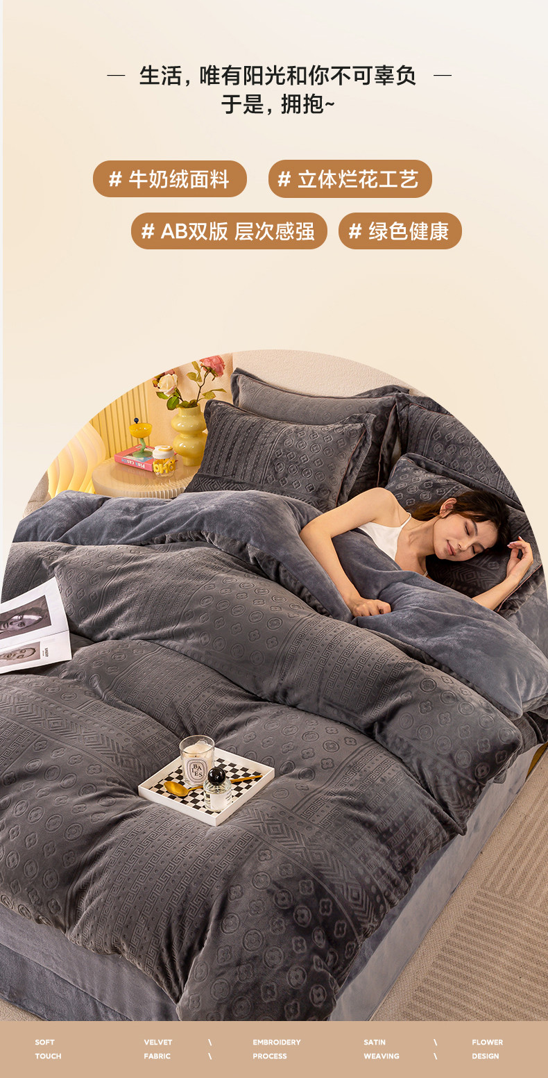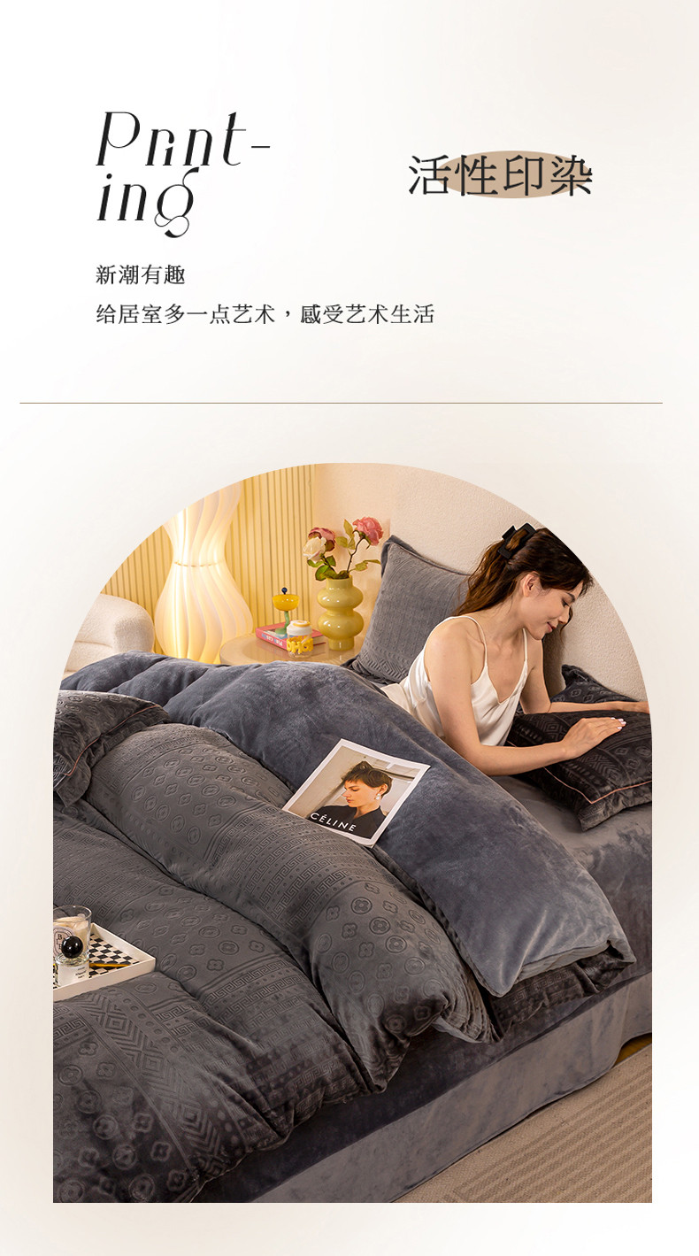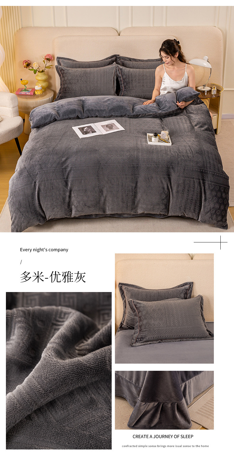 博兰蒂 2023新款时尚烂花牛奶绒四件套-多米系列 优雅灰
