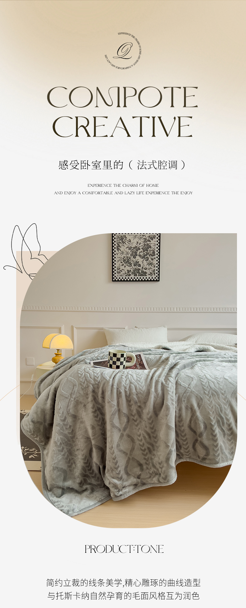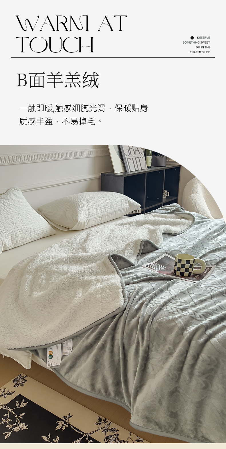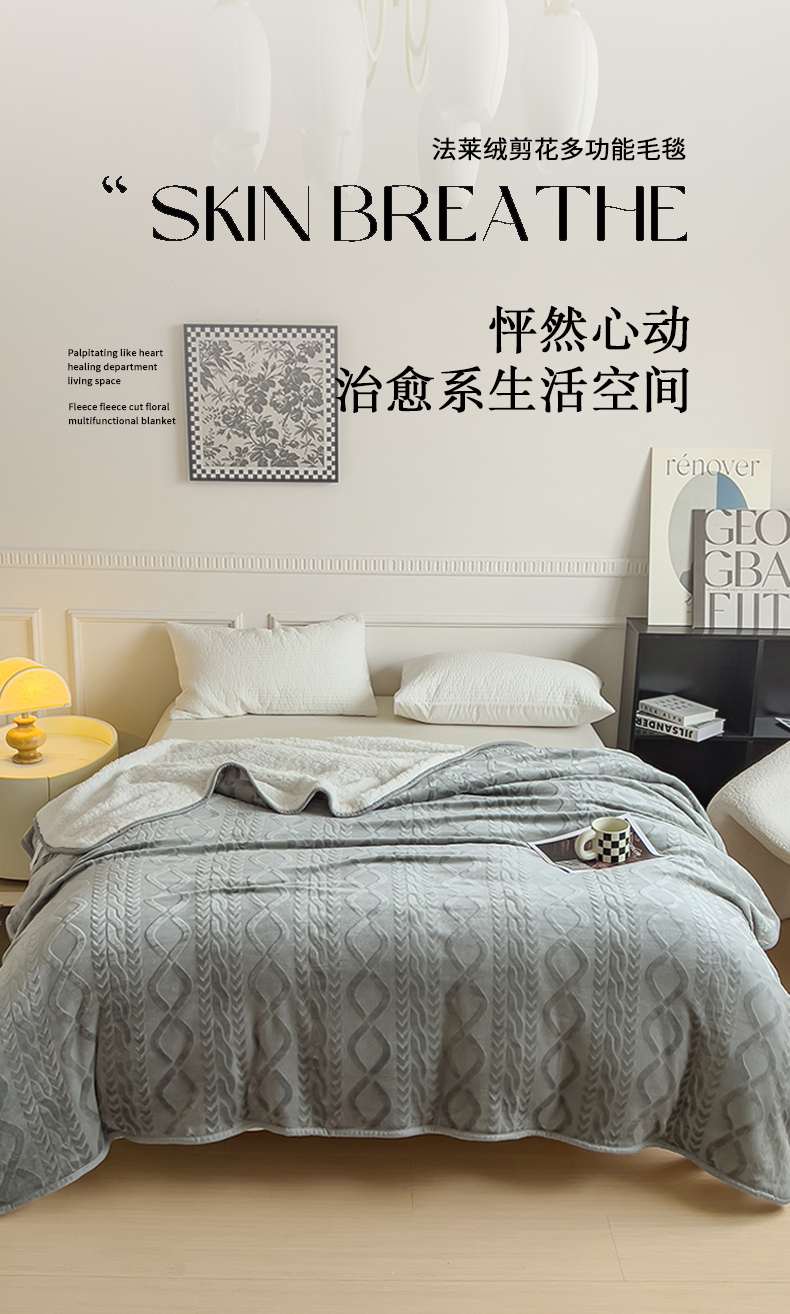 (总)宜家坊 2023新款秋冬高克重法莱绒羊羔绒立体剪花纯色多功能毛毯,奶油白,浅奶咖,绅士灰,胭脂粉,烟灰蓝,优雅棕