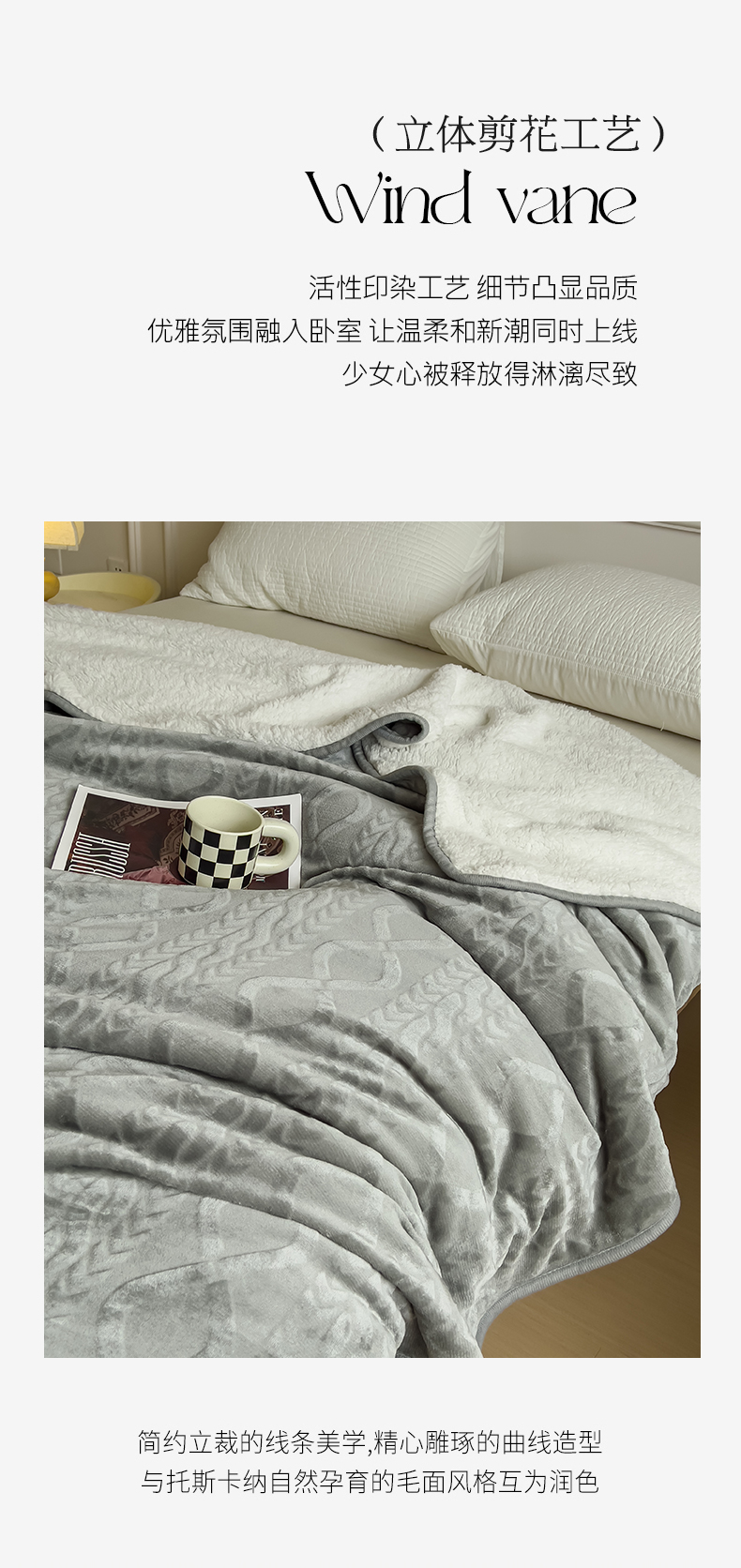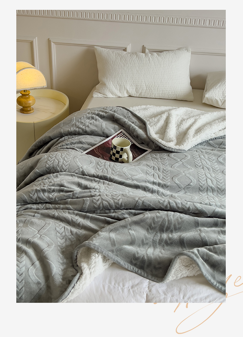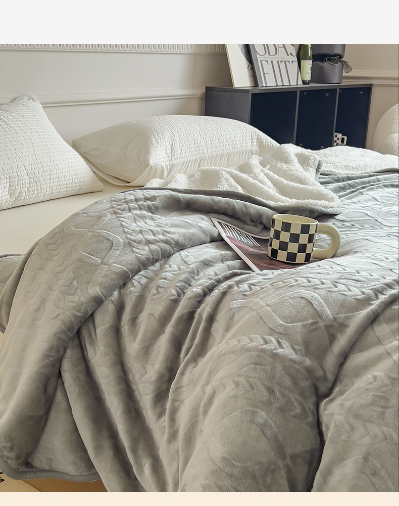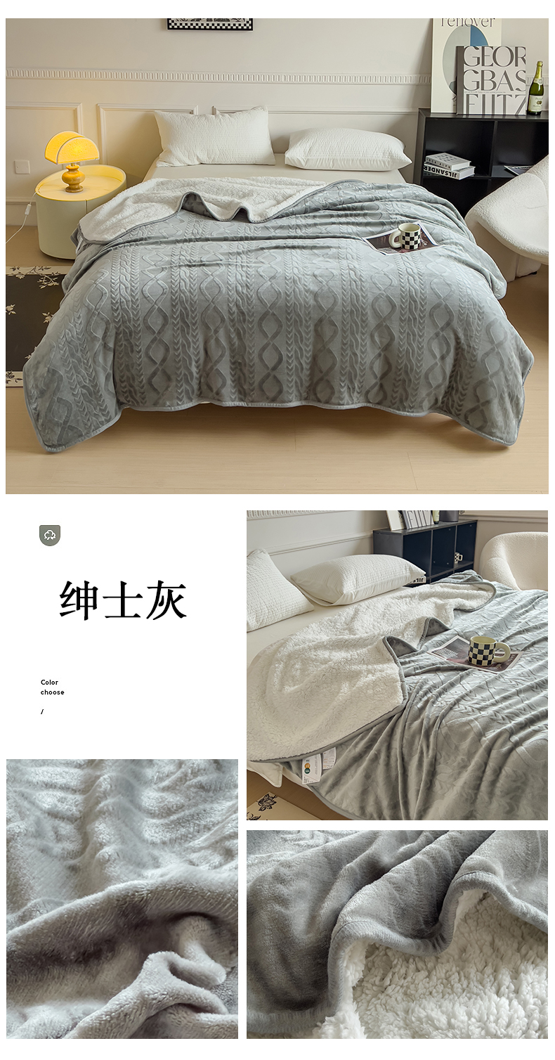 商品名称:宜家坊新款秋冬高克重法莱绒羊羔绒立体剪花纯色多功能毛毯 绅士灰