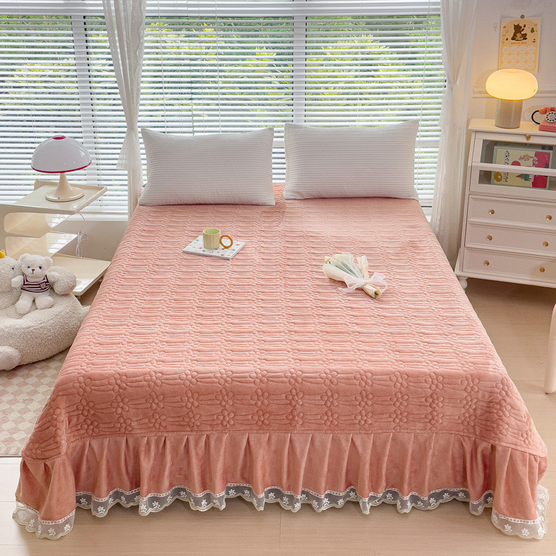 雅眠居 2023直播爆款纯色牛奶绒床裙款床盖肌理纹夹棉床单 花朵-桔粉