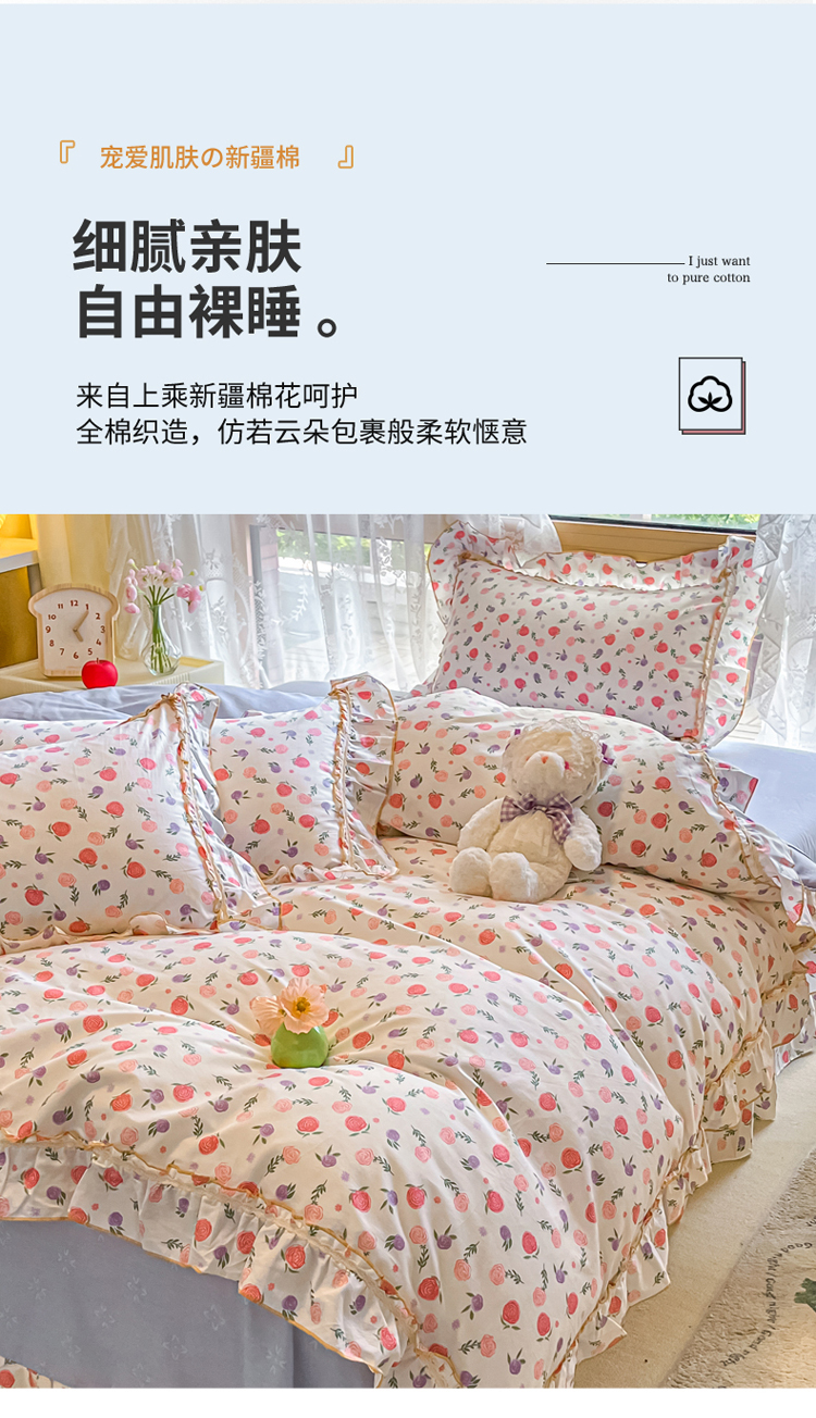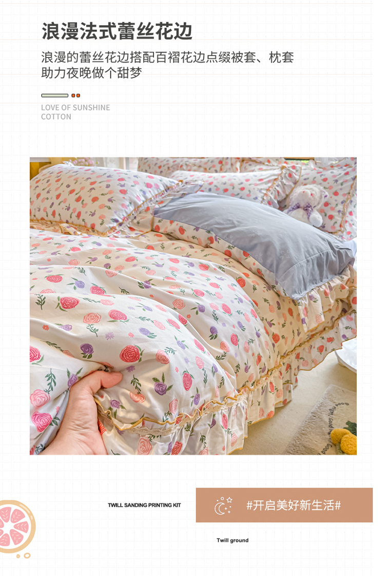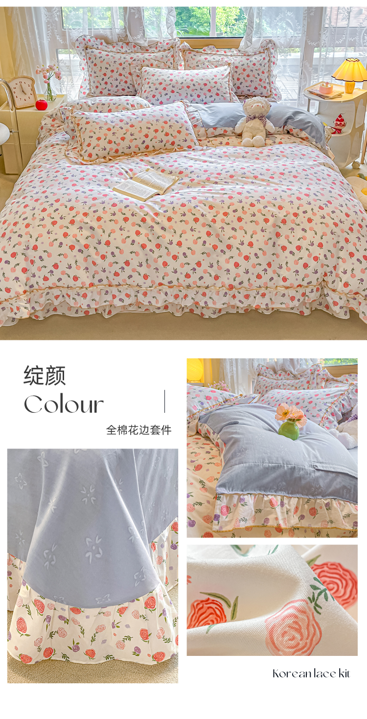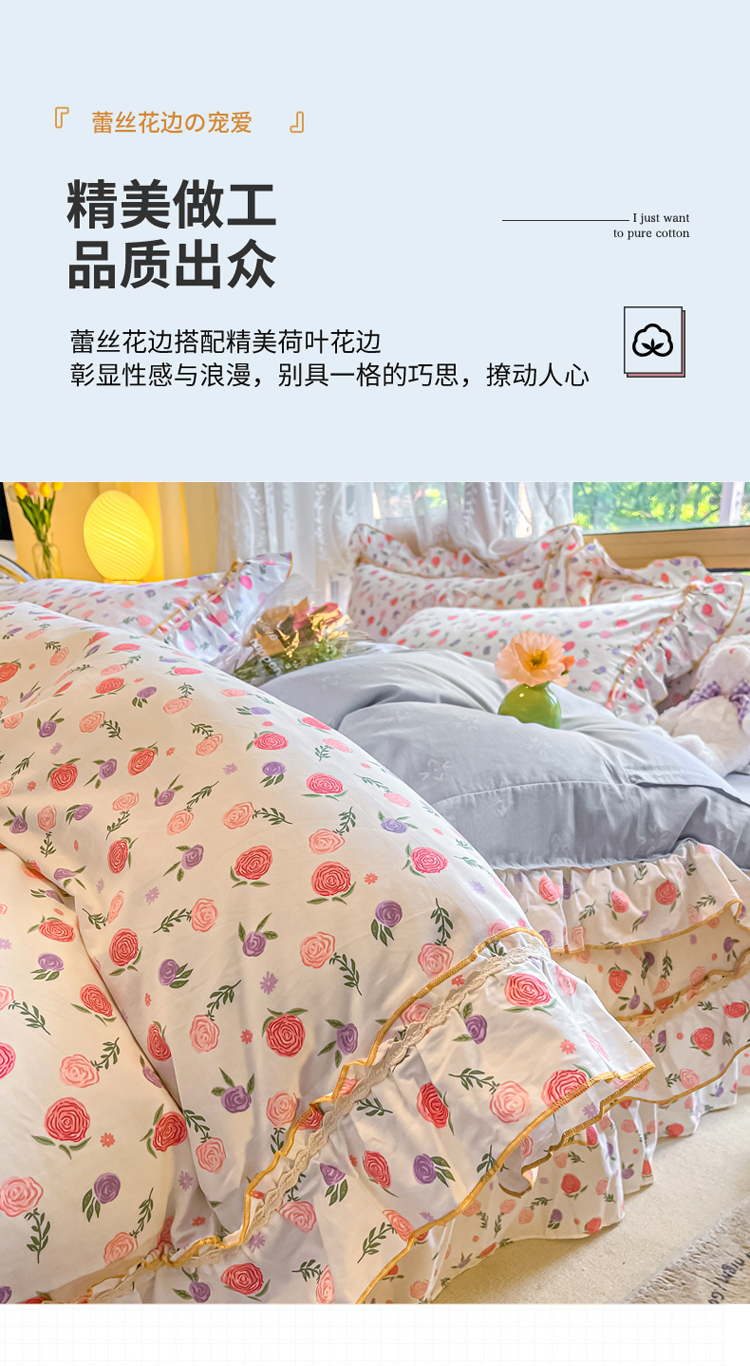 商品名称:艾唯希家纺 2024新款全棉韩式花边四件套纯棉公主风田园系列 绽颜