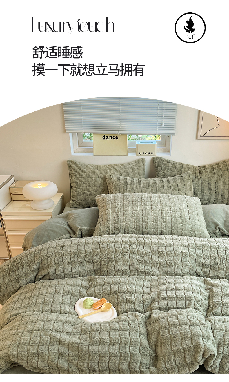 商品名称:妖妖家纺 2023兔毛四件套-小玫瑰小格子 豆绿