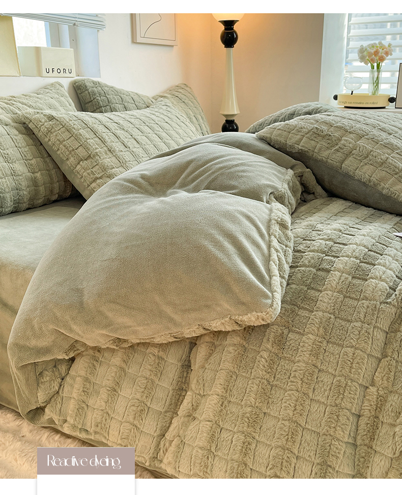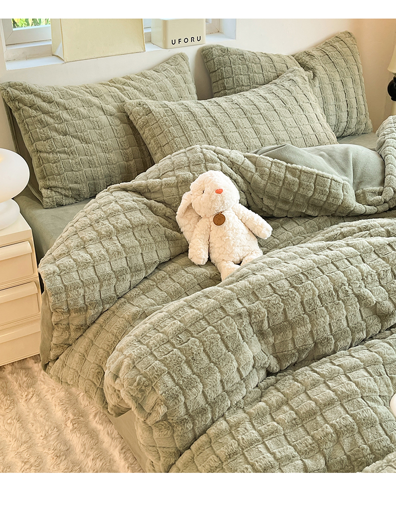 妖妖家纺 2023兔毛四件套-小玫瑰小格子 豆绿