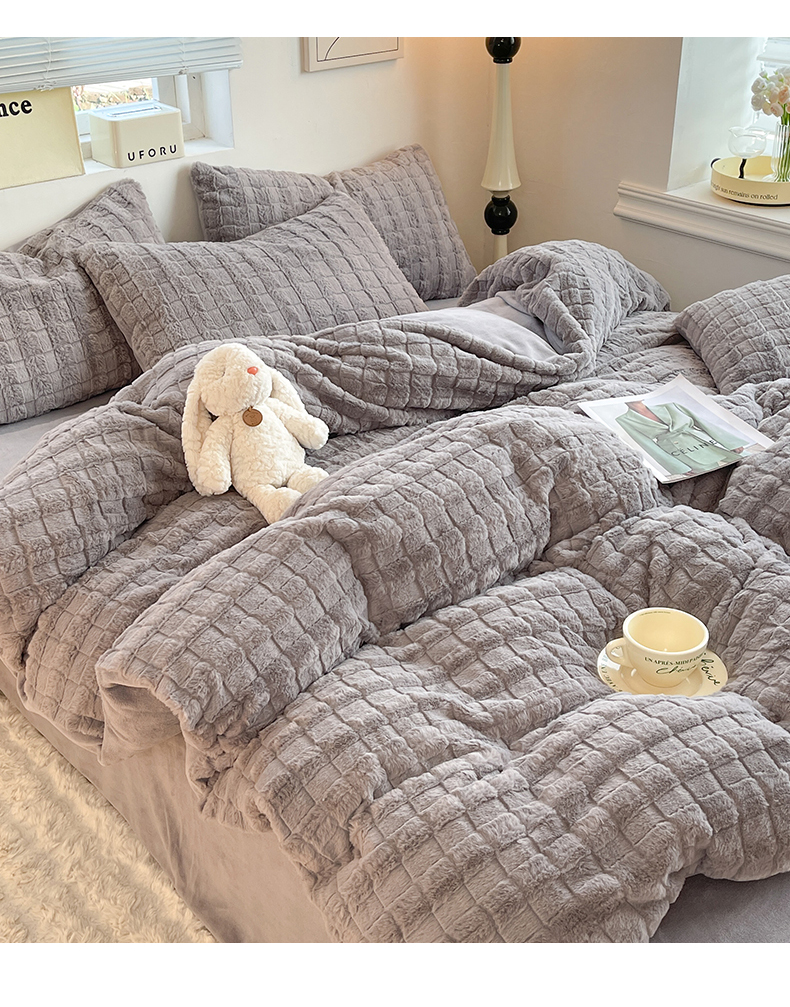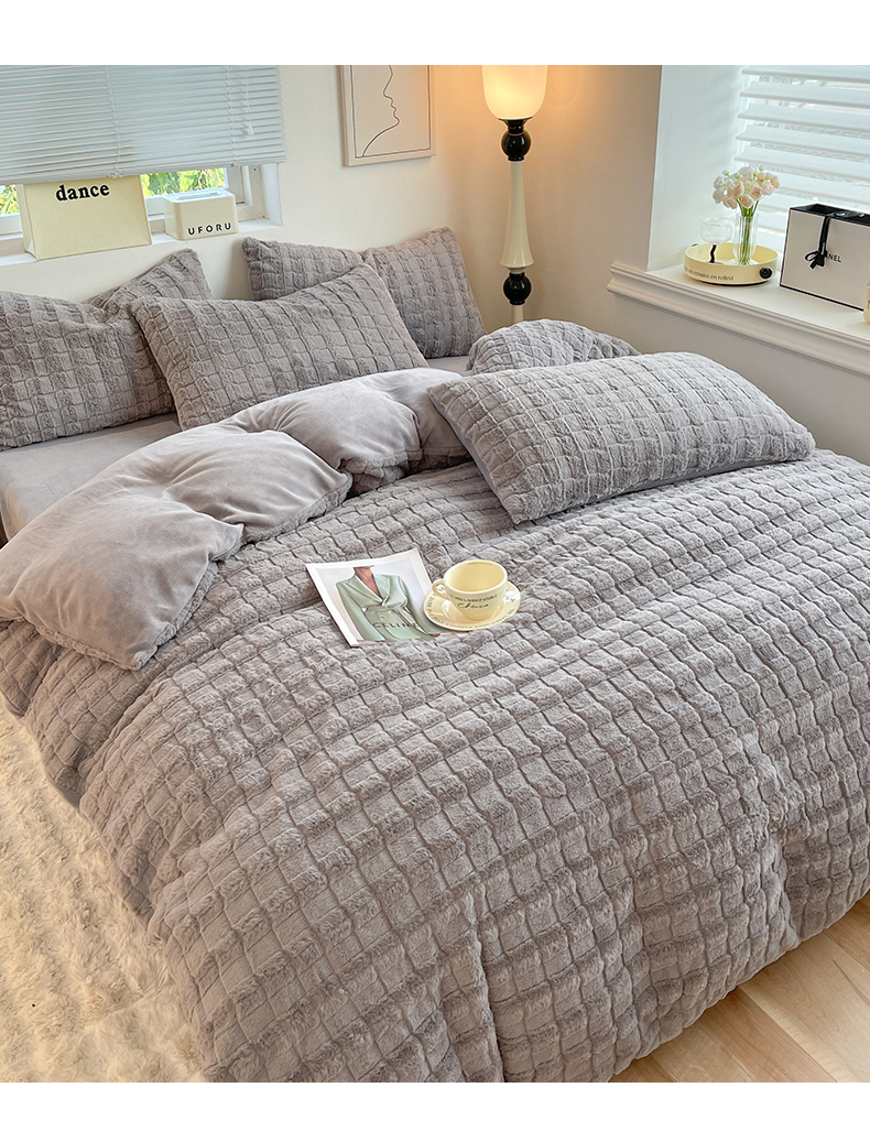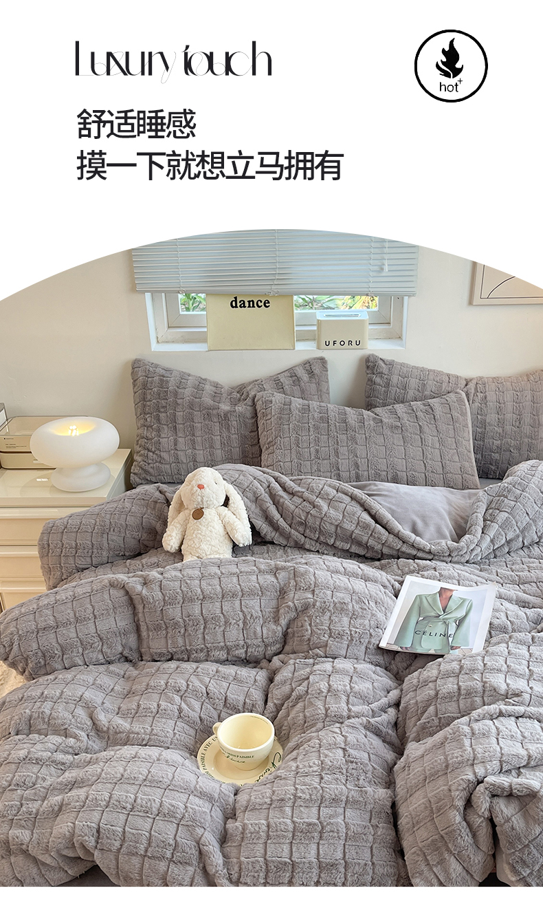 妖妖家纺 2023兔毛四件套-小玫瑰小格子 浅灰