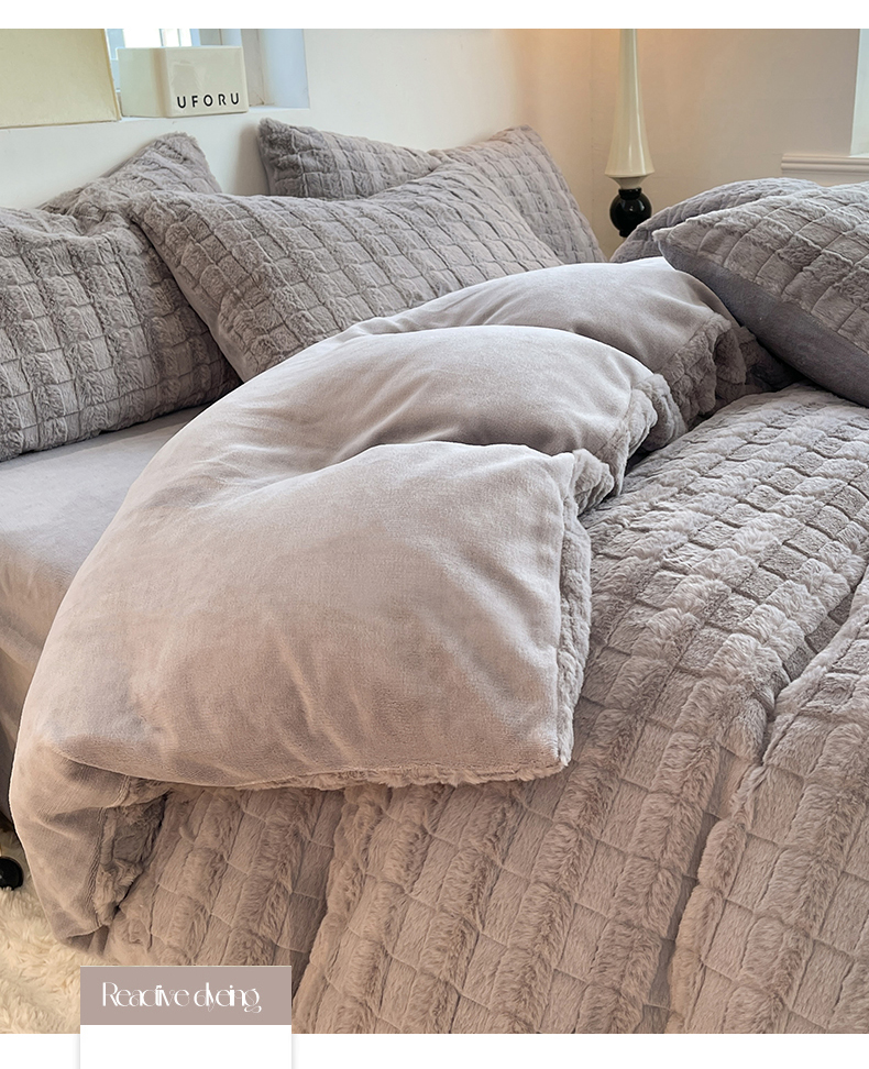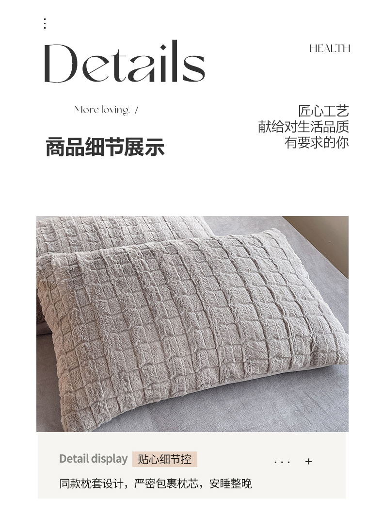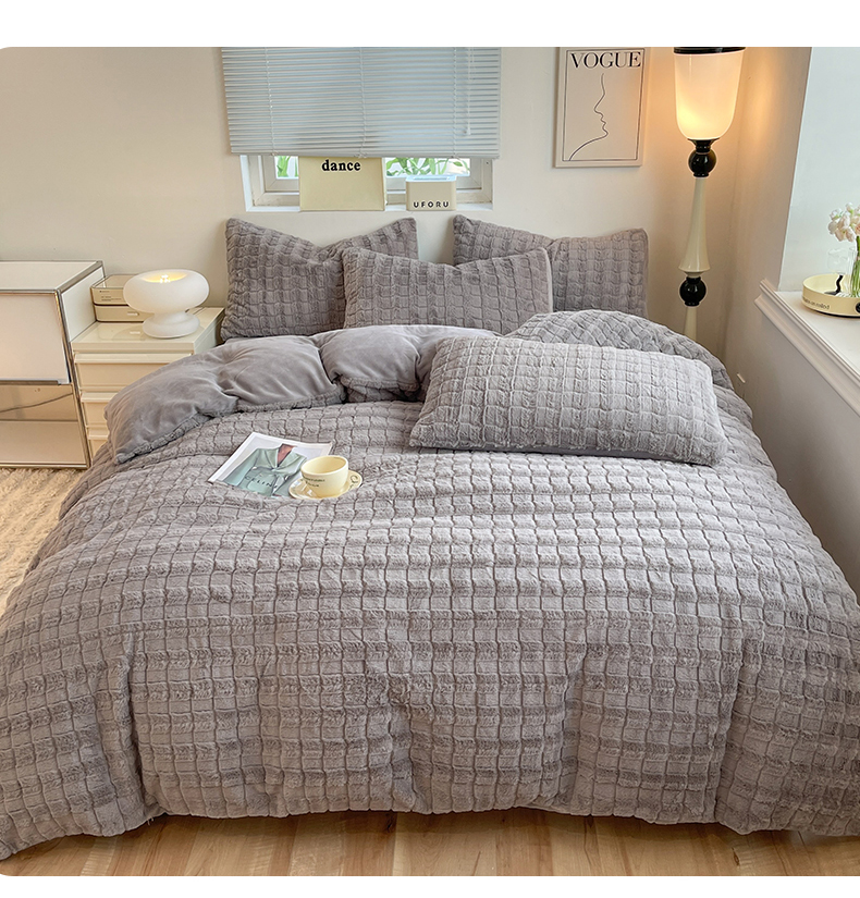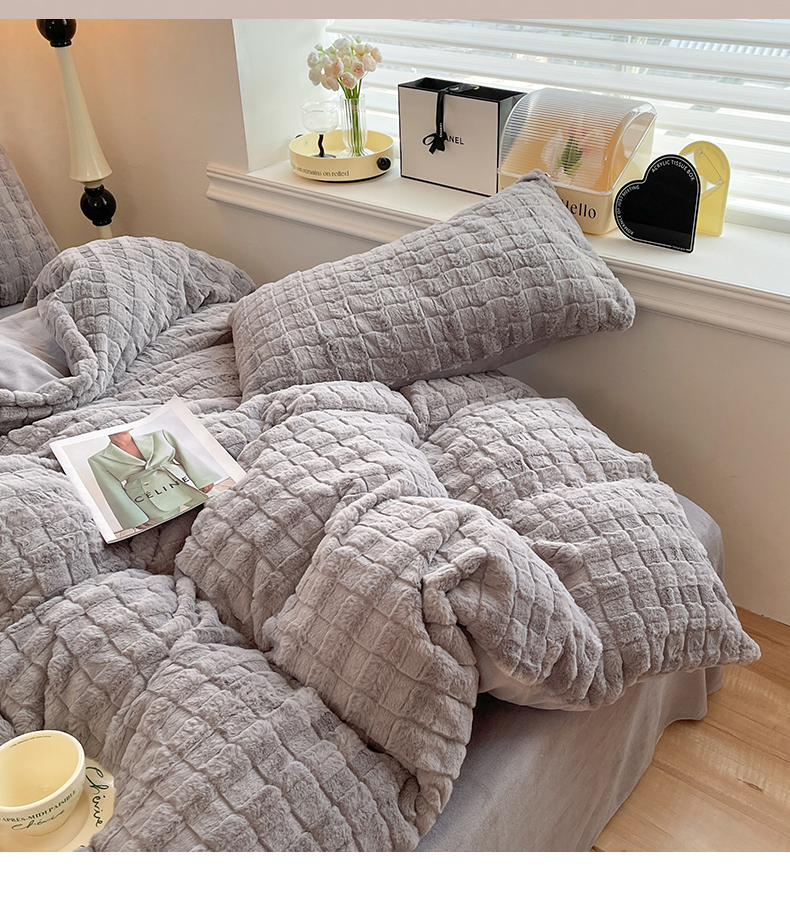 商品名称:妖妖家纺 2023兔毛四件套-小玫瑰小格子 浅灰