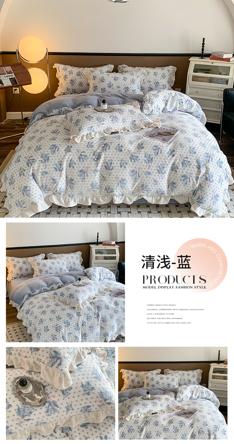 商品名称:潘朵拉 2023新款高克重法式花边着色雕花牛奶绒四件套 清浅(蓝)