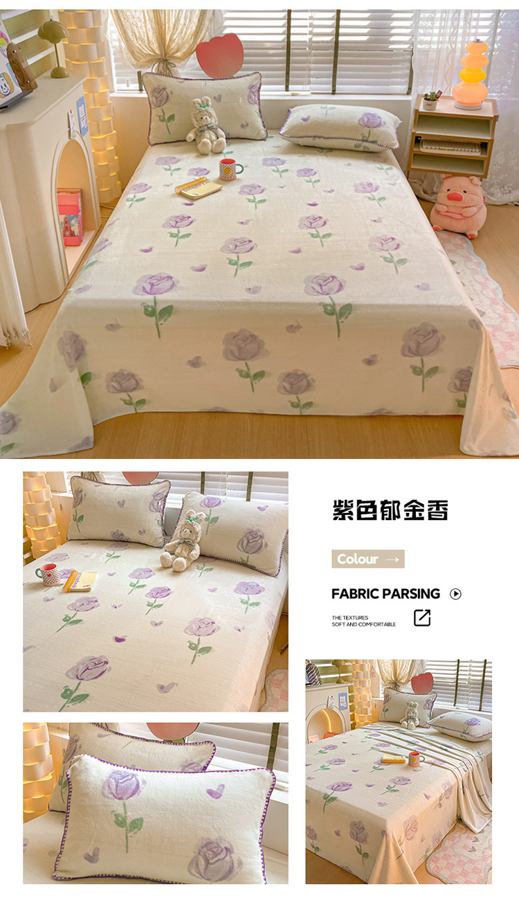 安哆啦 2024新款高克重小清新牛奶绒单床单 紫色郁金香
