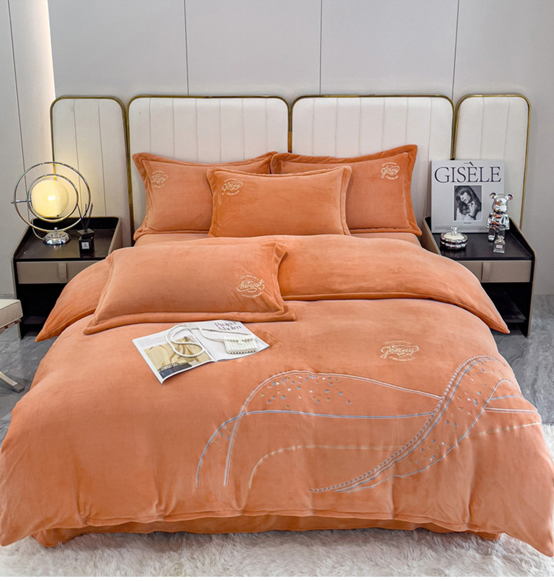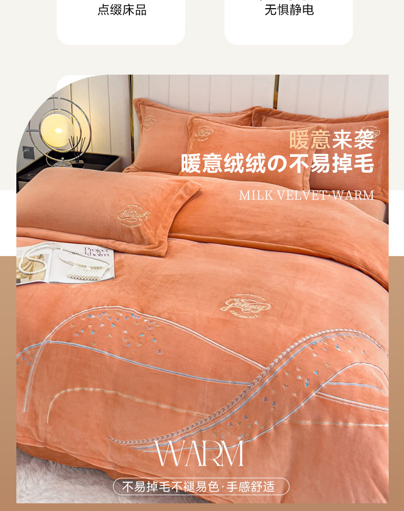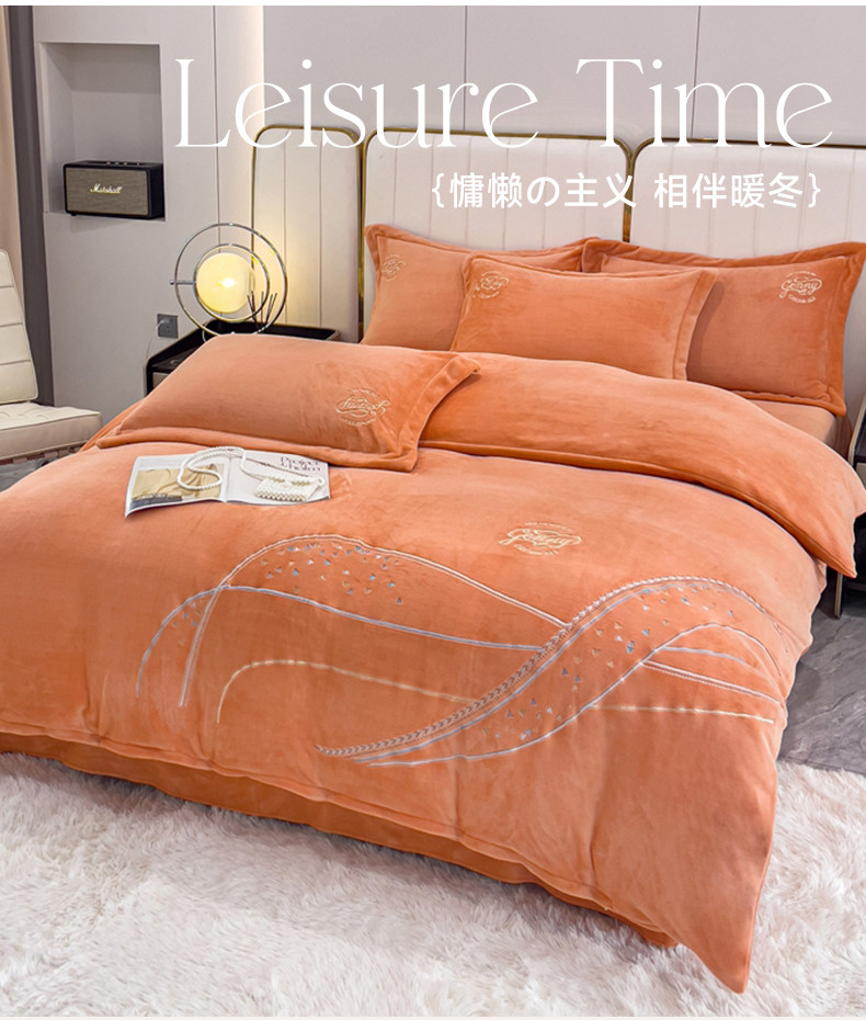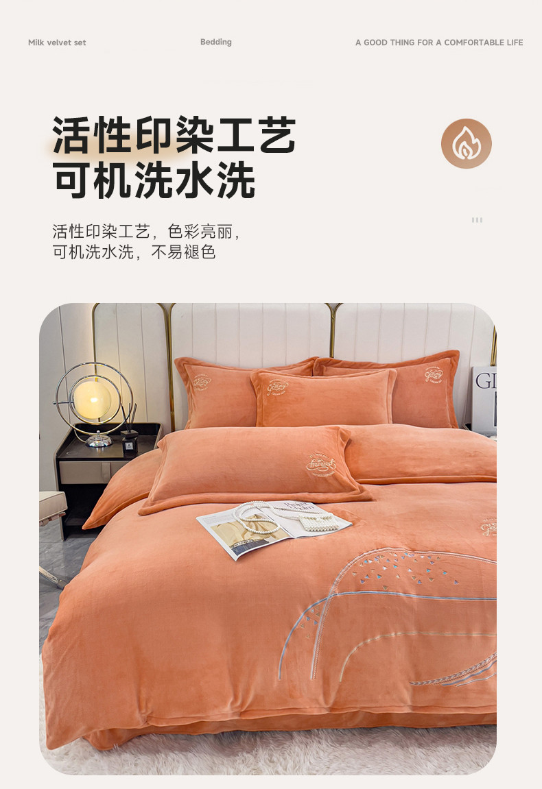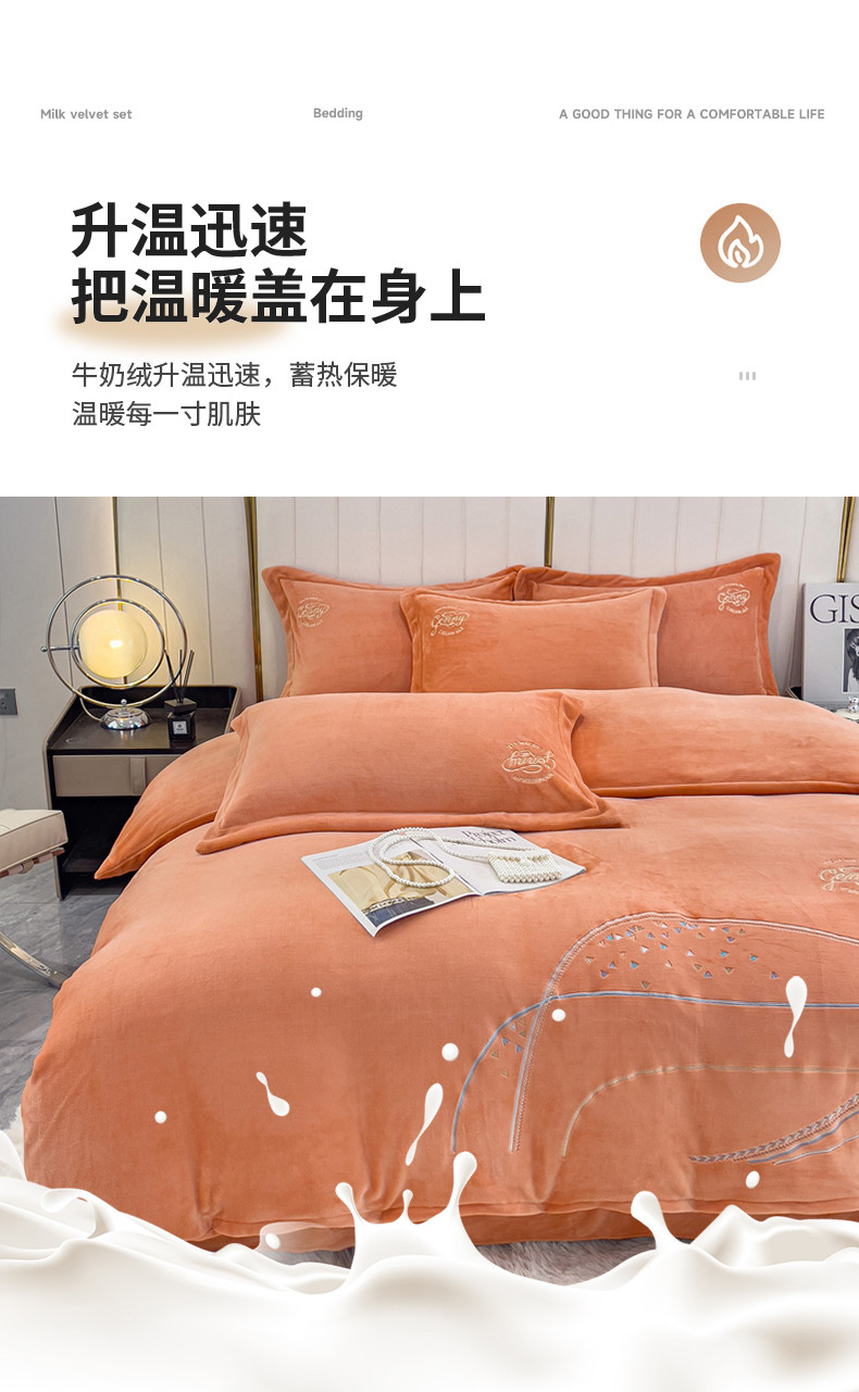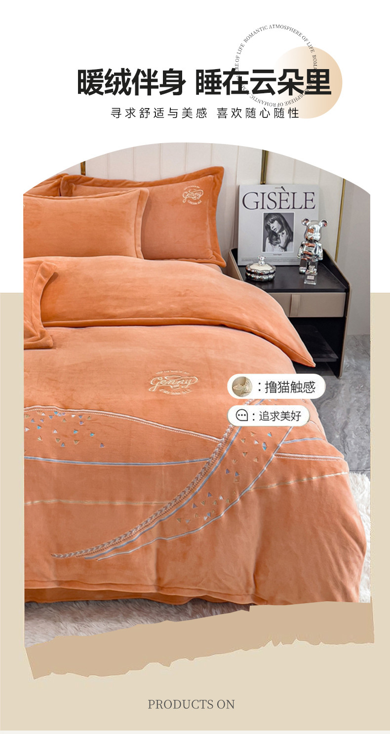 慕克斯 2025直播新款高克重8.5斤纯色刺绣牛奶绒四件套 朝花夕拾-浅橘,朝花夕拾-浅橘