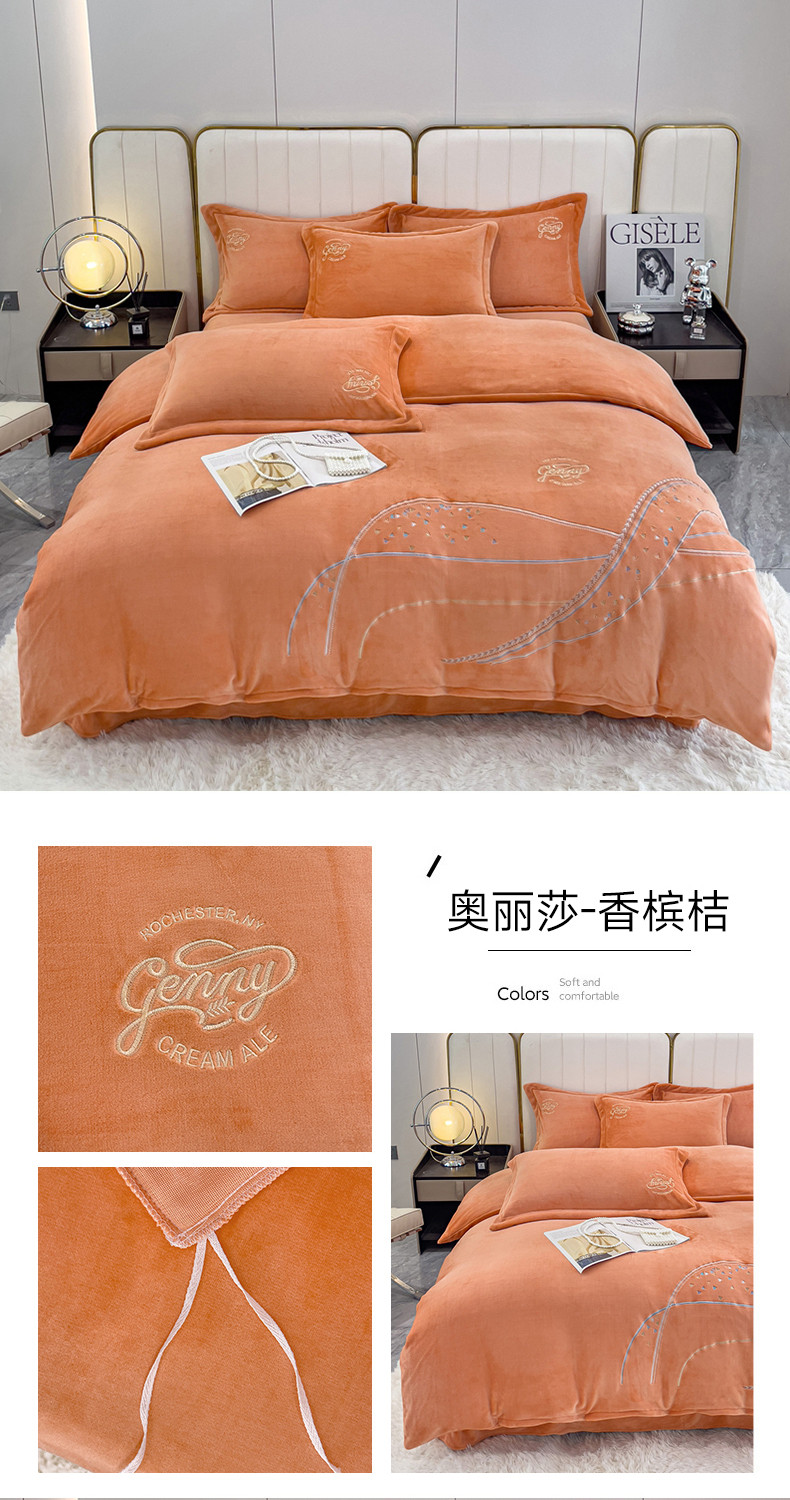 慕克斯 2023新款全消光高克重刺绣牛奶绒四件套-奥丽莎 奥丽莎-香槟桔