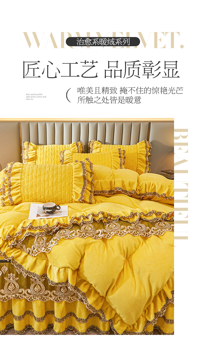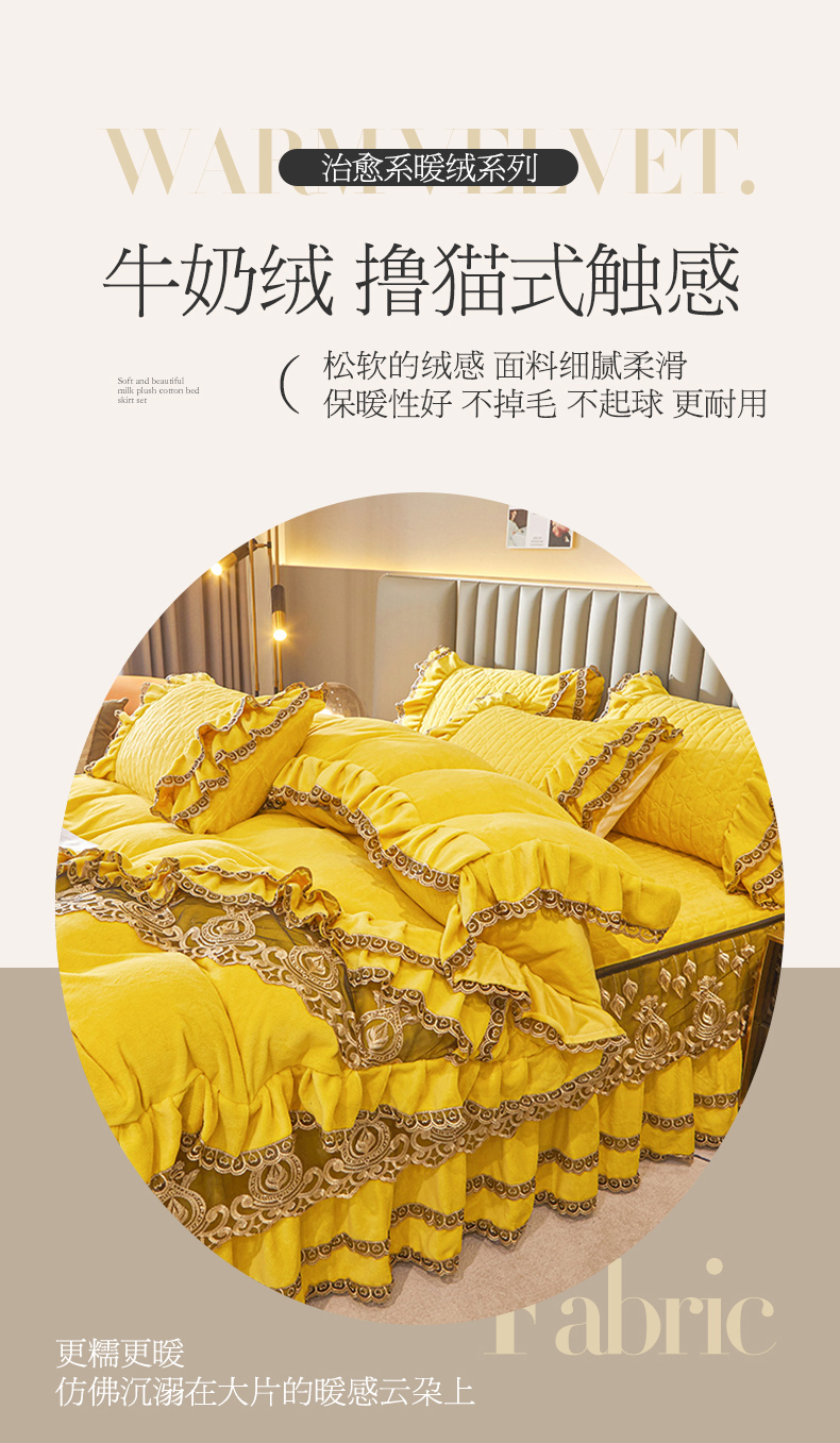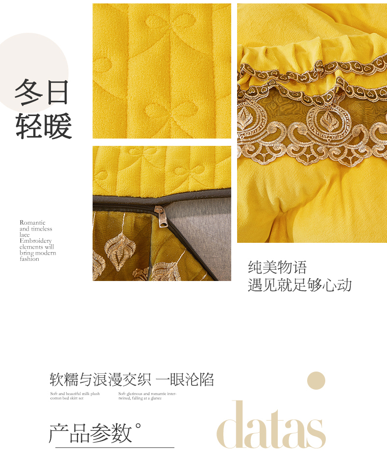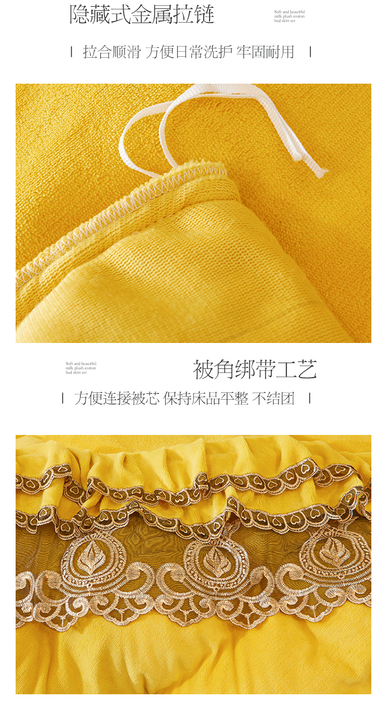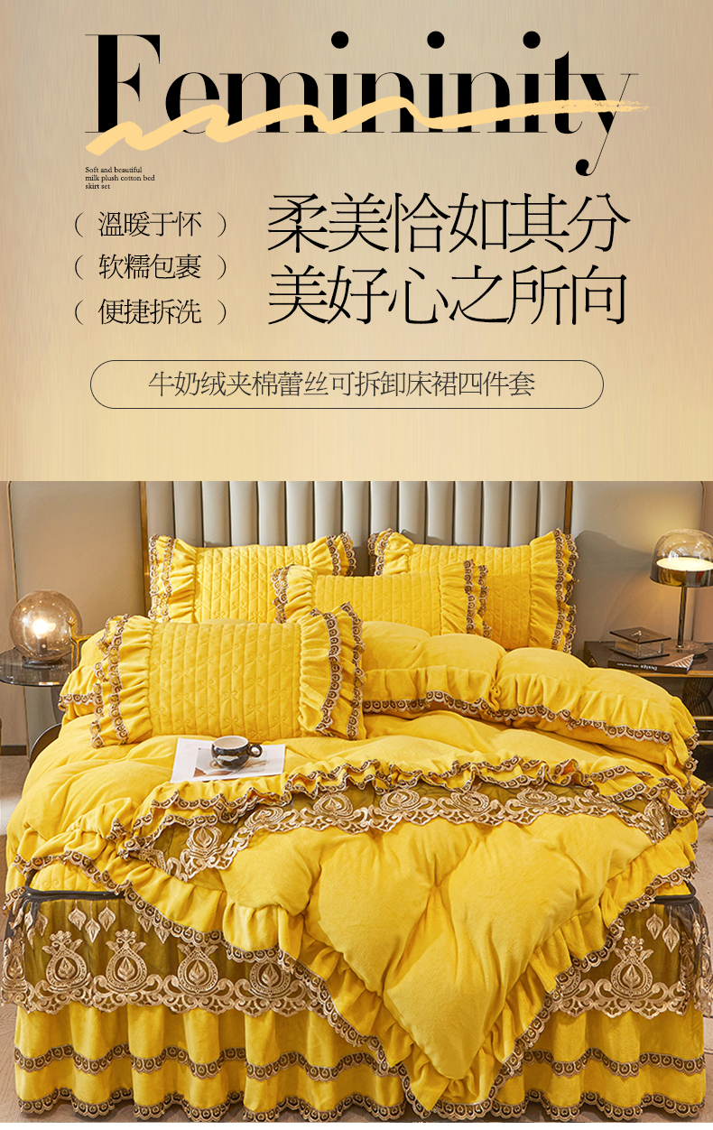 • 91家纺网 家纺一手货源 找家纺 虹星家纺 2023新款牛奶绒夹棉蕾丝可拆卸床裙系列四件套 梦幻巴黎 柠檬黄
