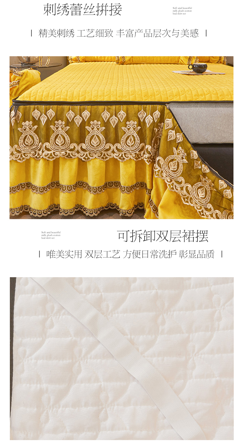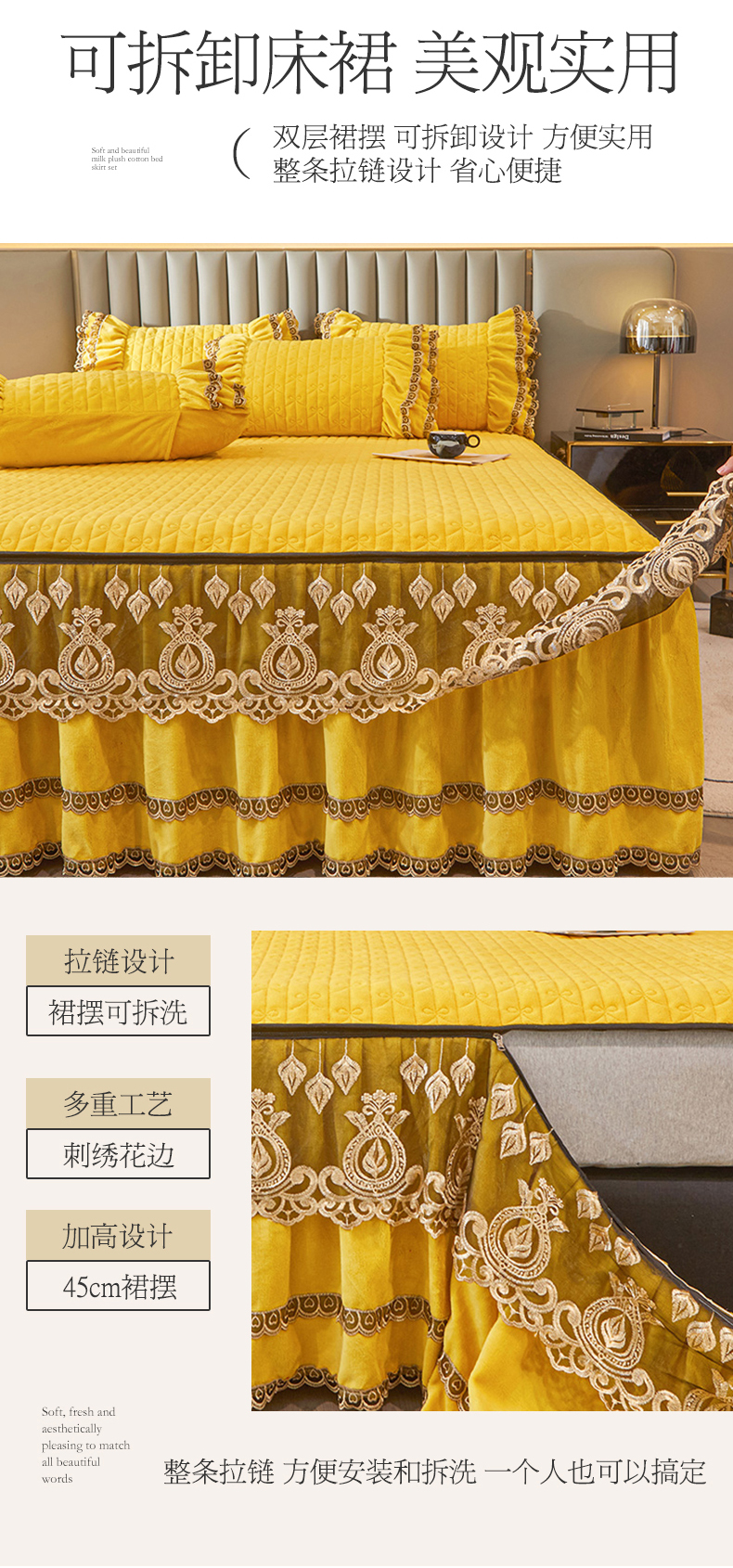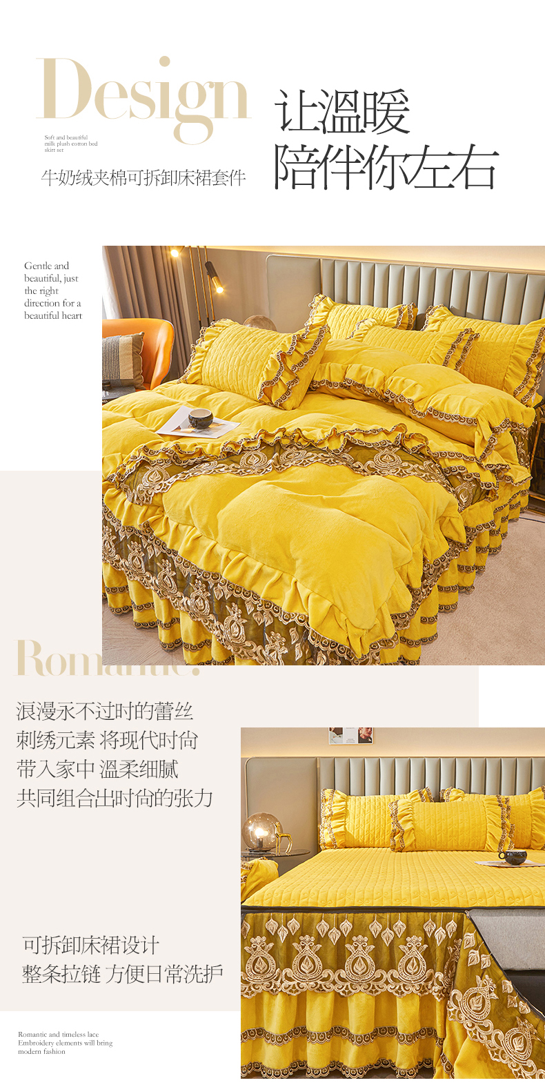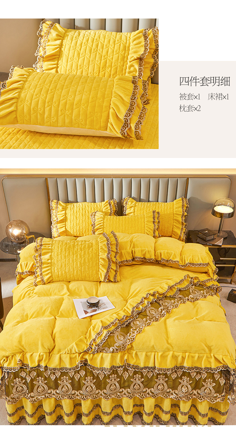 虹星家纺 2023新款牛奶绒夹棉蕾丝可拆卸床裙系列四件套 梦幻巴黎 柠檬黄