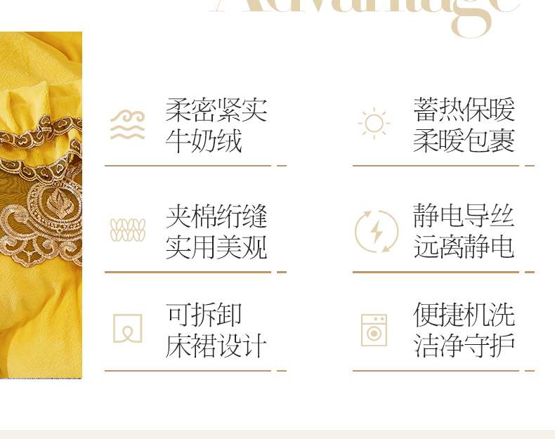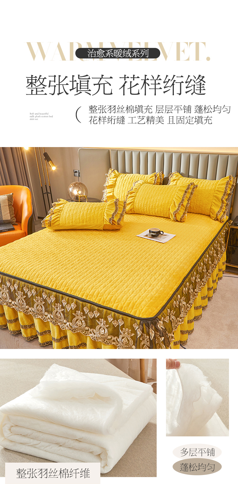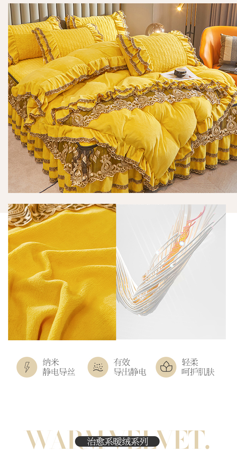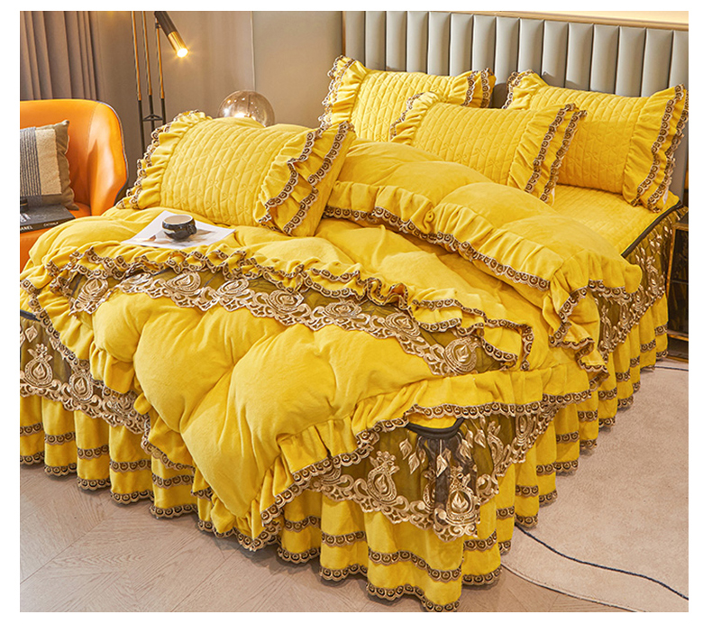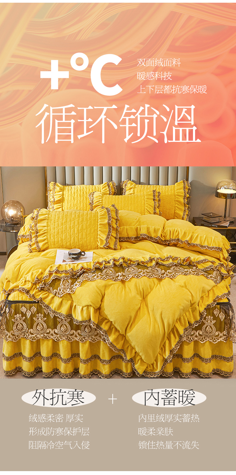 虹星家纺 2023新款牛奶绒夹棉蕾丝可拆卸床裙系列四件套 梦幻巴黎 柠檬黄