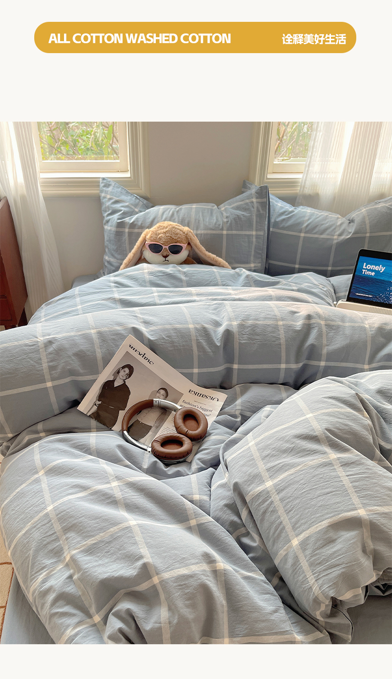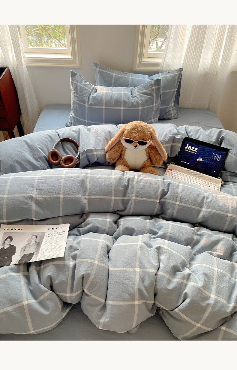 雅居纺家纺 2024新款色织水洗棉四件套 柏林蓝格