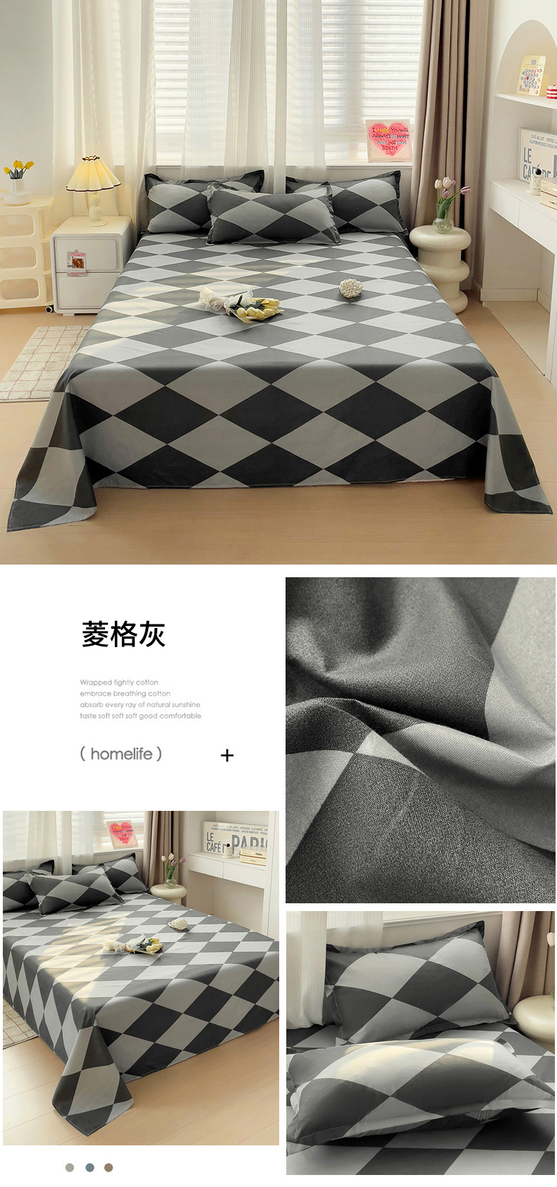 • 91家纺网 家纺一手货源 找家纺 楠沐家纺  2025年新款亲肤水洗棉芦荟棉印花床单系列 菱格灰
