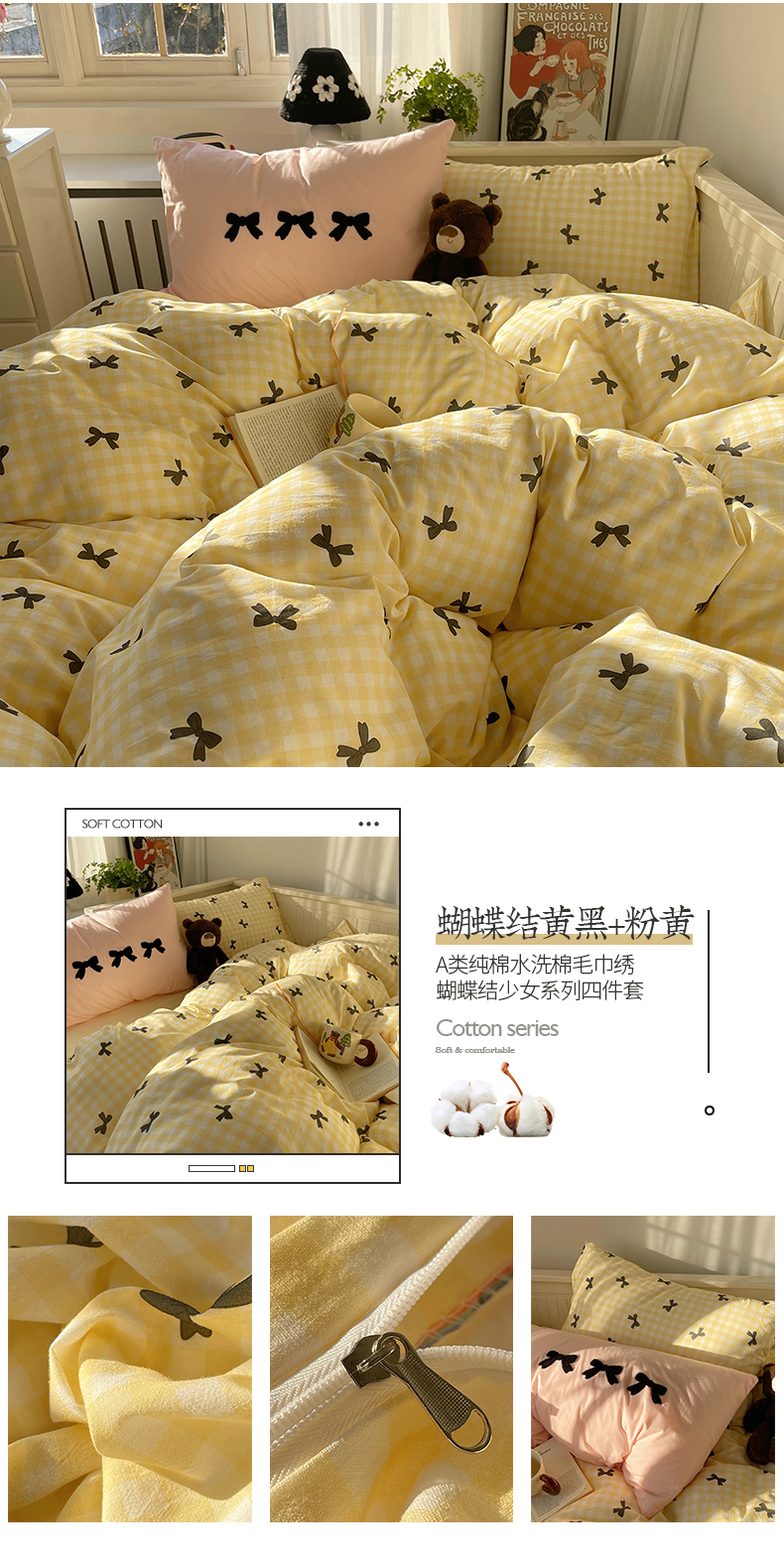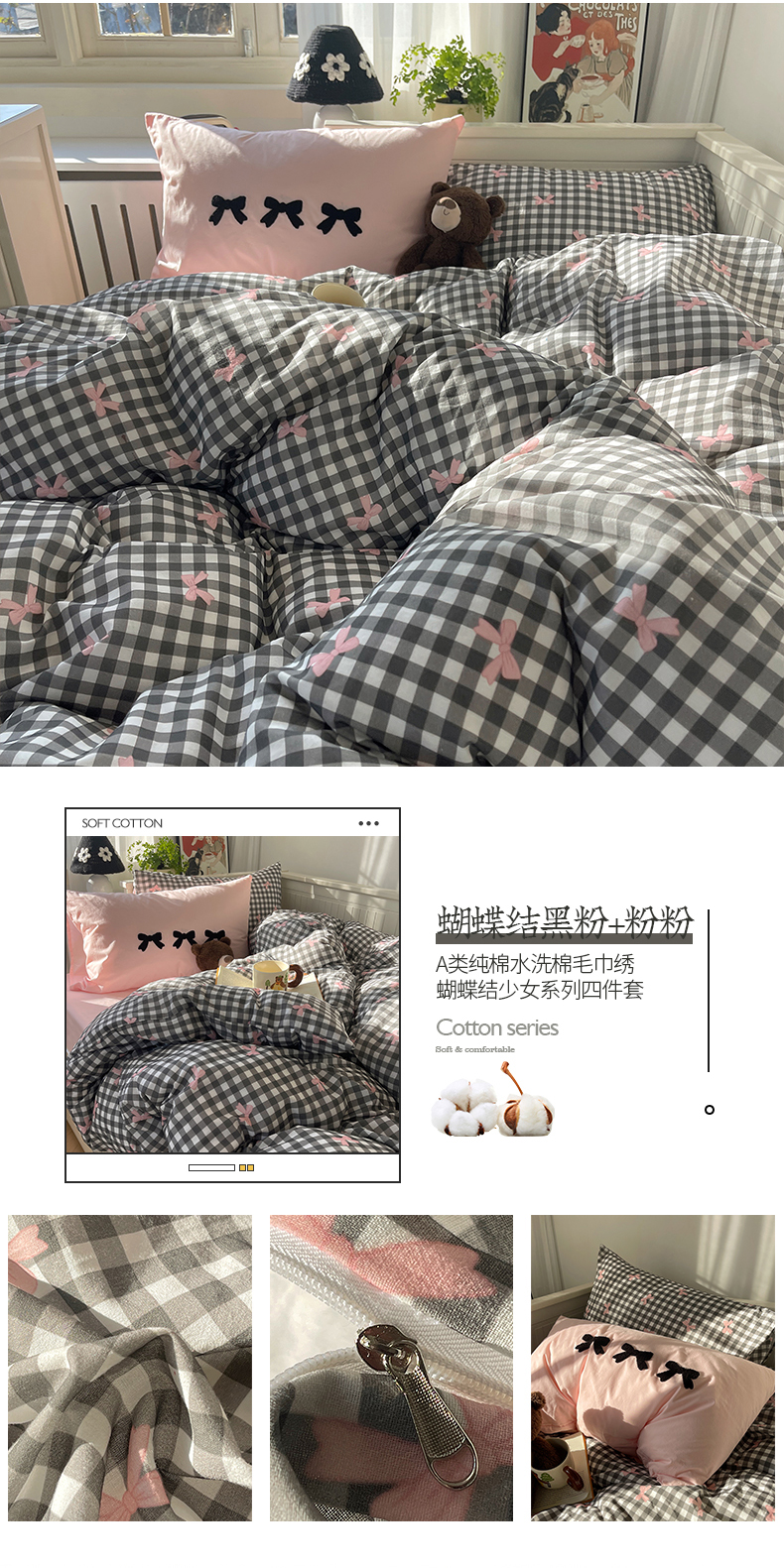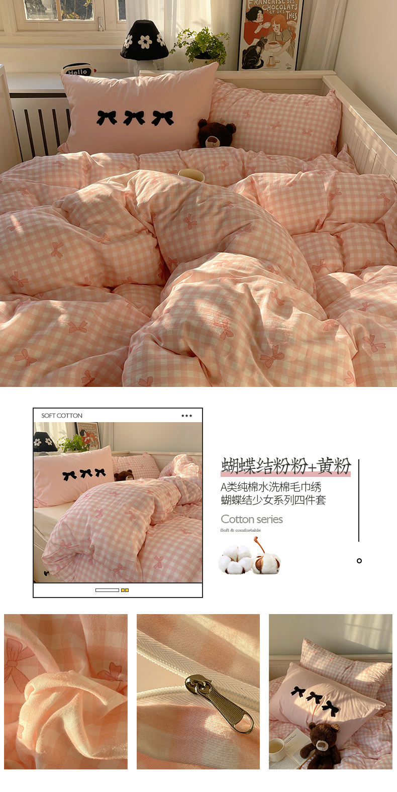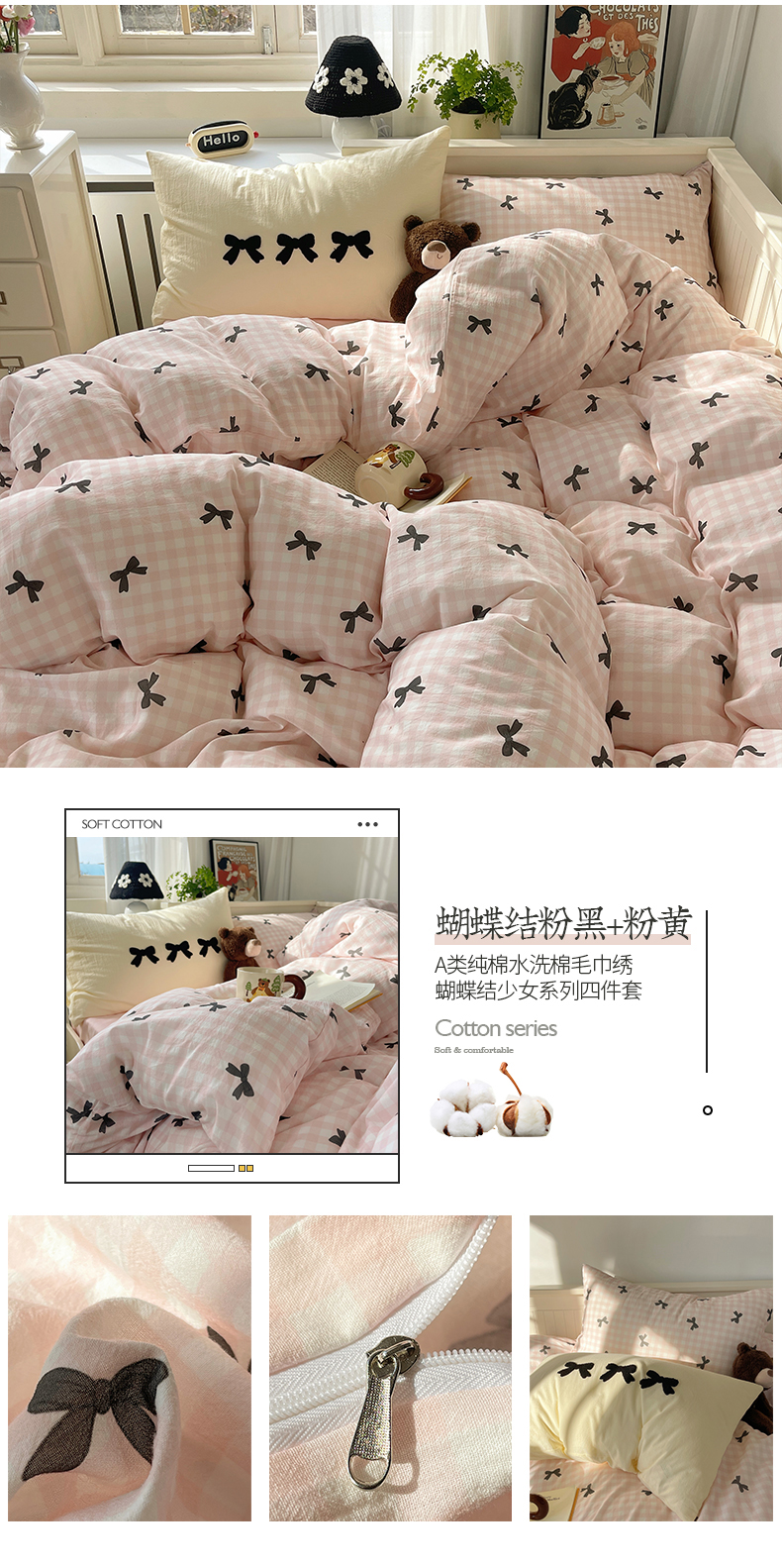 商品名称:(总)桃子家居 2024新款A类纯棉水洗棉毛巾绣蝴蝶结少女系列四件套