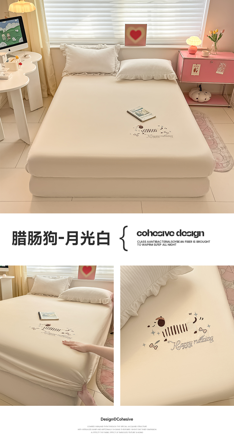 商品名称:2024新款A类全棉水洗棉绣花单床笠 腊肠狗-月光白