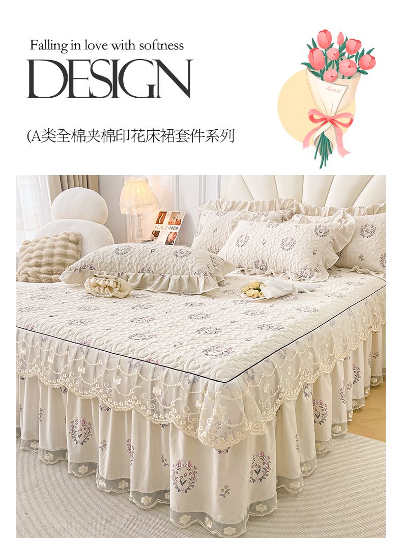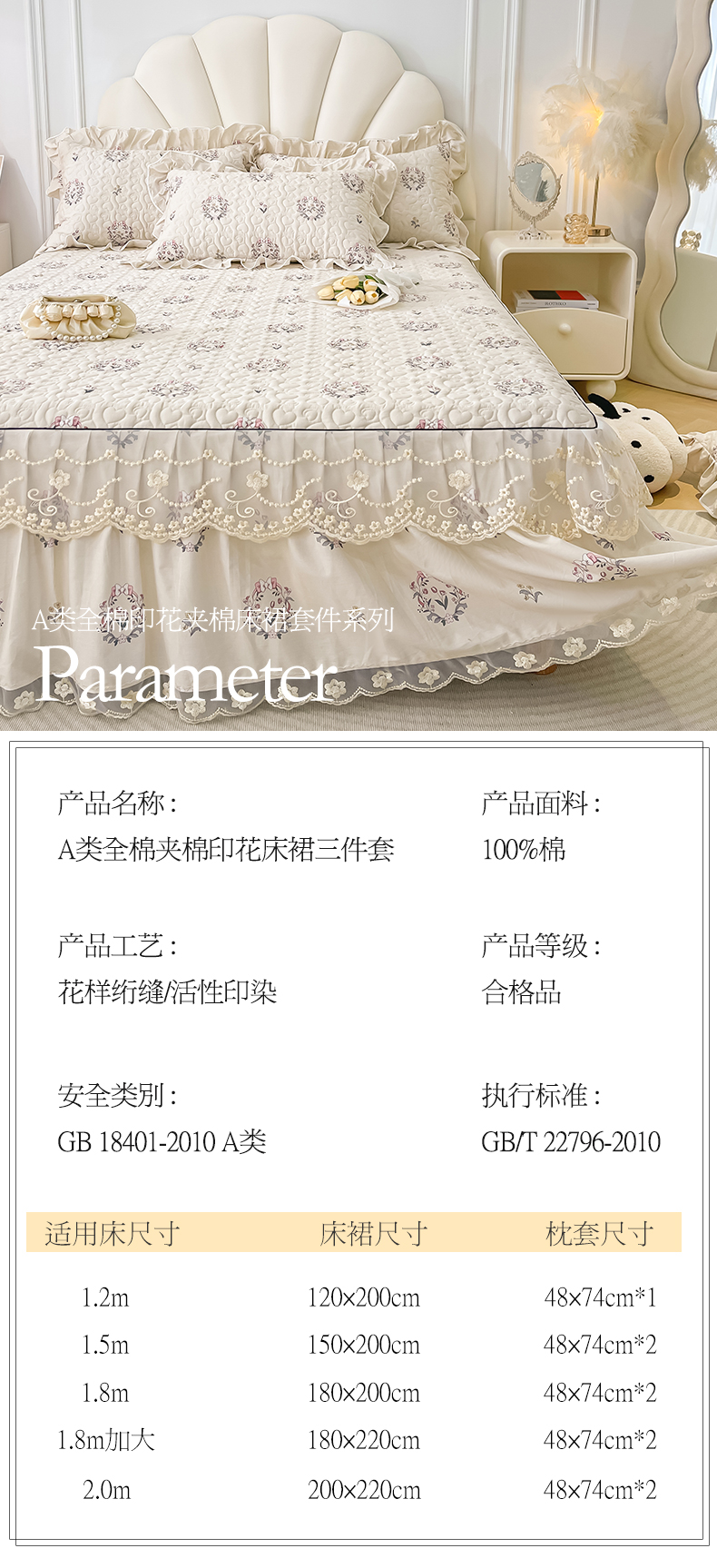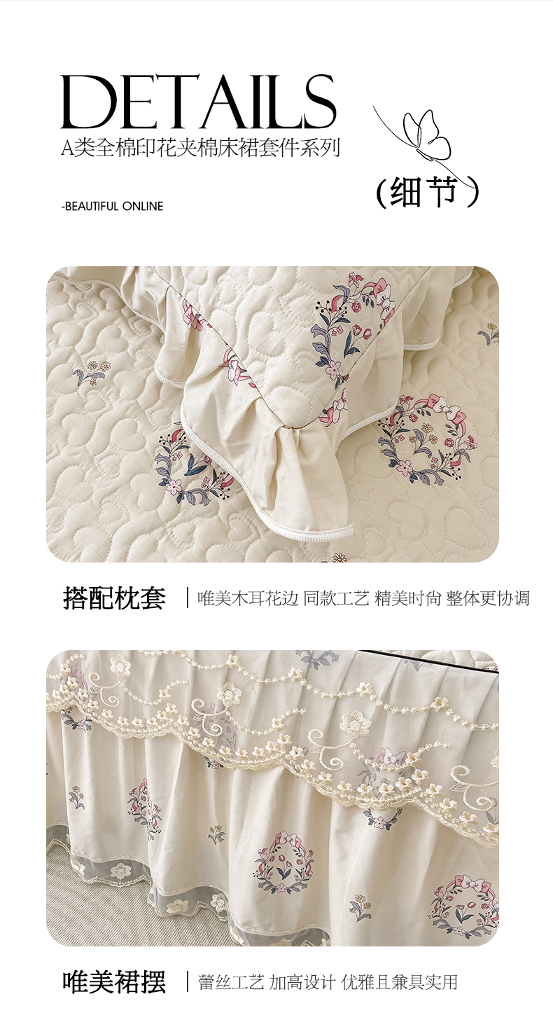 • 91家纺网 家纺一手货源 找家纺 宜凡家纺 2024新款全棉夹棉印花床裙系列三件套 童梦爱丽丝