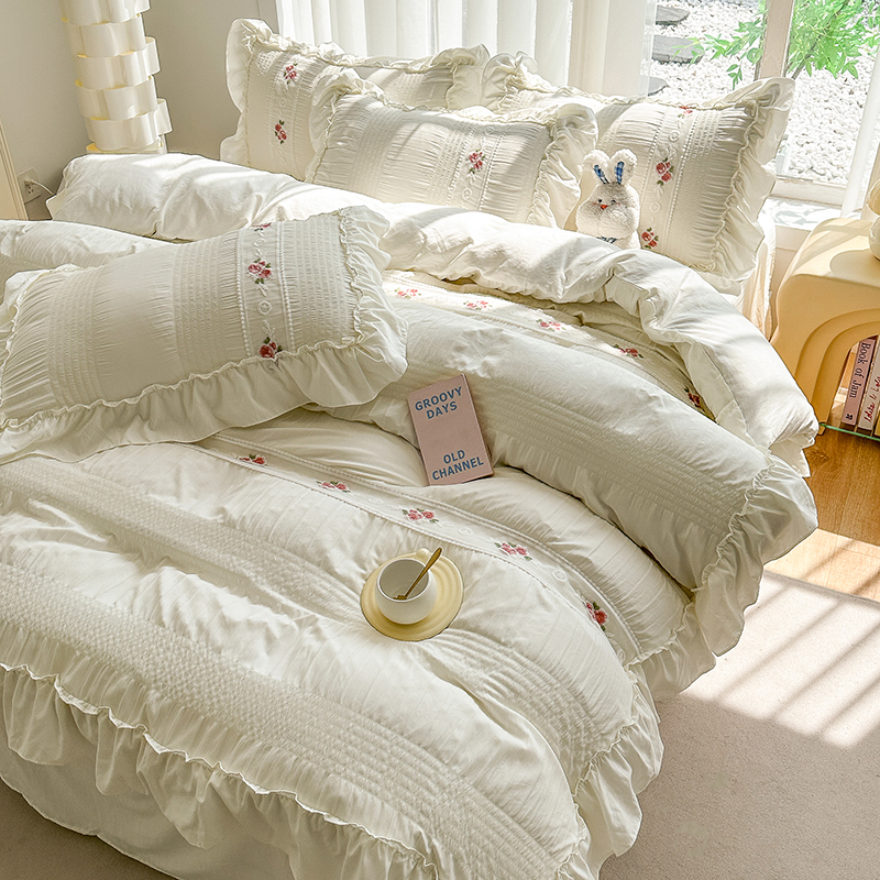 当前位置: 91家纺网 > 商品网购 > 床品套件 > 四件套 > 水洗棉四件套 > 小主驾到 2024新款公主风水洗棉泡泡纱刺绣蕾丝荷叶边韩版四件套 泡泡纱米白