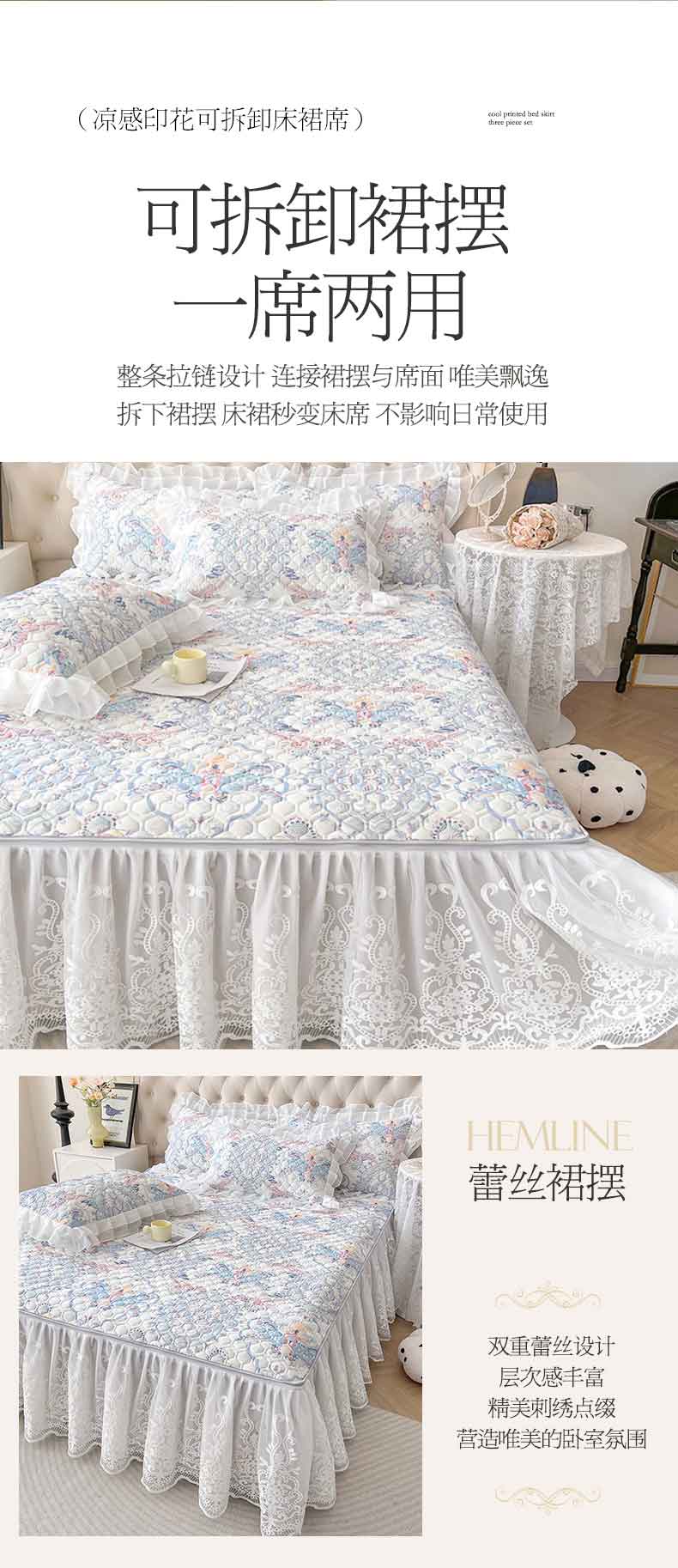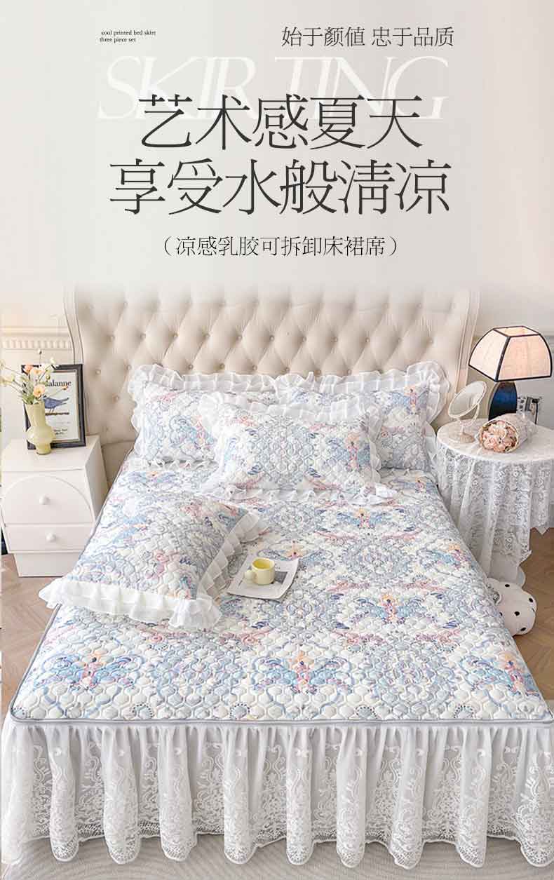 (总)虹星家纺 2024新款A类冰感凉豆豆可拆卸床裙席三件套,静谧灰,宝石蓝,冰川蓝,梦幻粉,青果绿,珍珠灰
