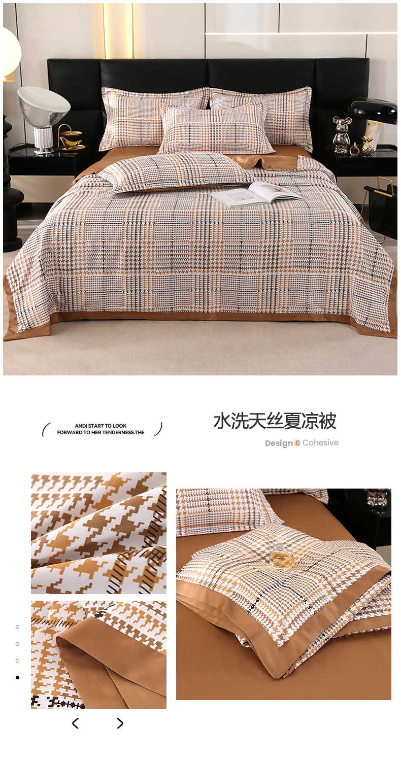 富之航家纺 2024新款拼角宽边水洗天丝夏被四件套 约克-可可棕