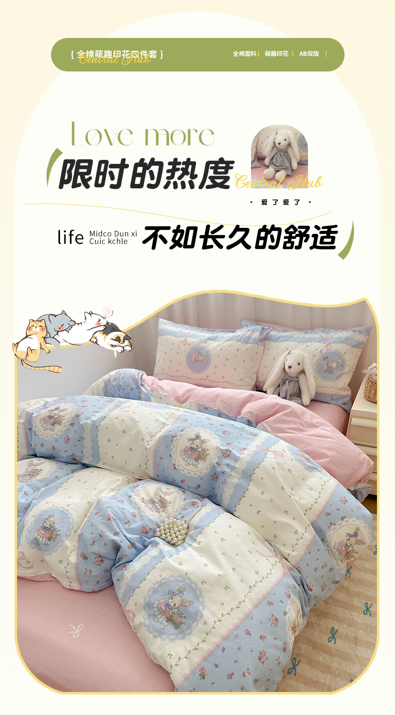 (总)瑞莱 2026春季新款全棉纯棉印花小清新萌趣系列四件套,小懒猫,KT猫,可爱猫咪,蓝花兔,路灯影院,莓果小萌,帕丁顿兔兔,企鹅家族,趣味涂鸦,甜梦日记,甜梦小精灵,甜心KT,小镇漫游记