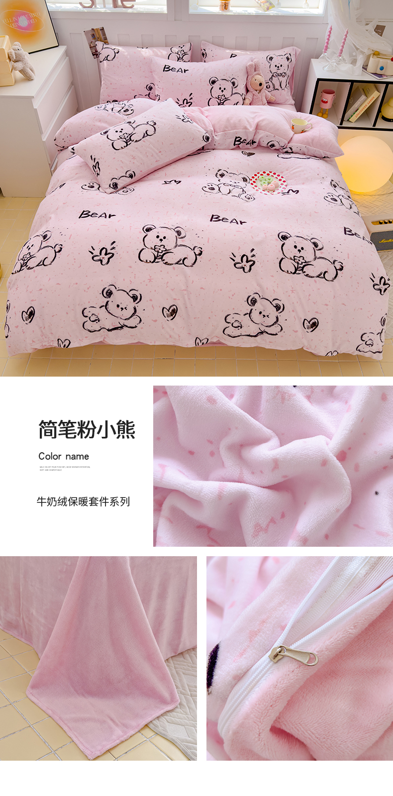 当前位置: 91家纺网 > 商品网购 > 床品套件 > 四件套 > 牛奶绒四件套 > 枋梢家纺 2024新款加厚牛奶绒印花四件套 简笔粉小熊