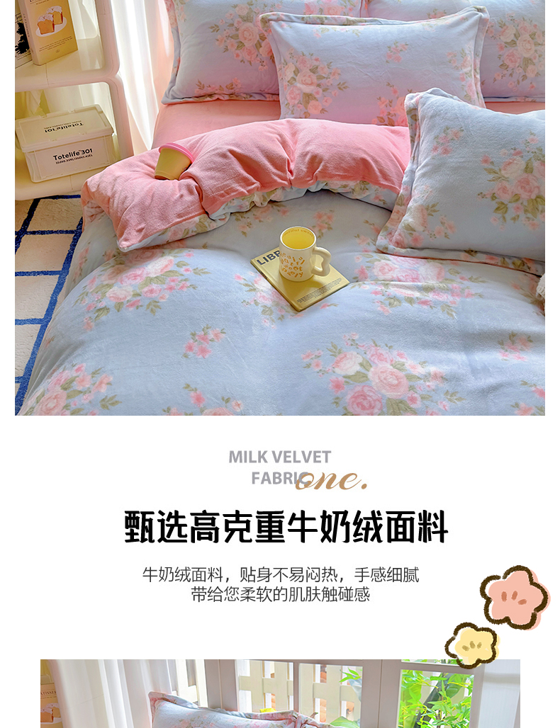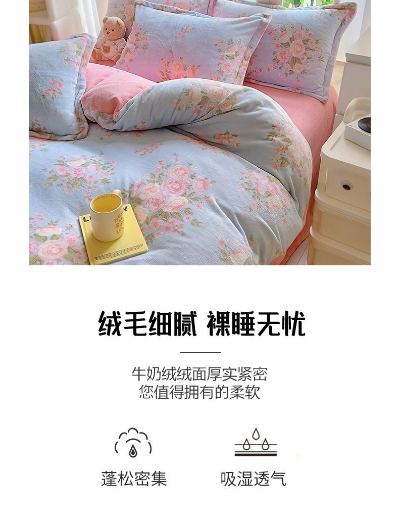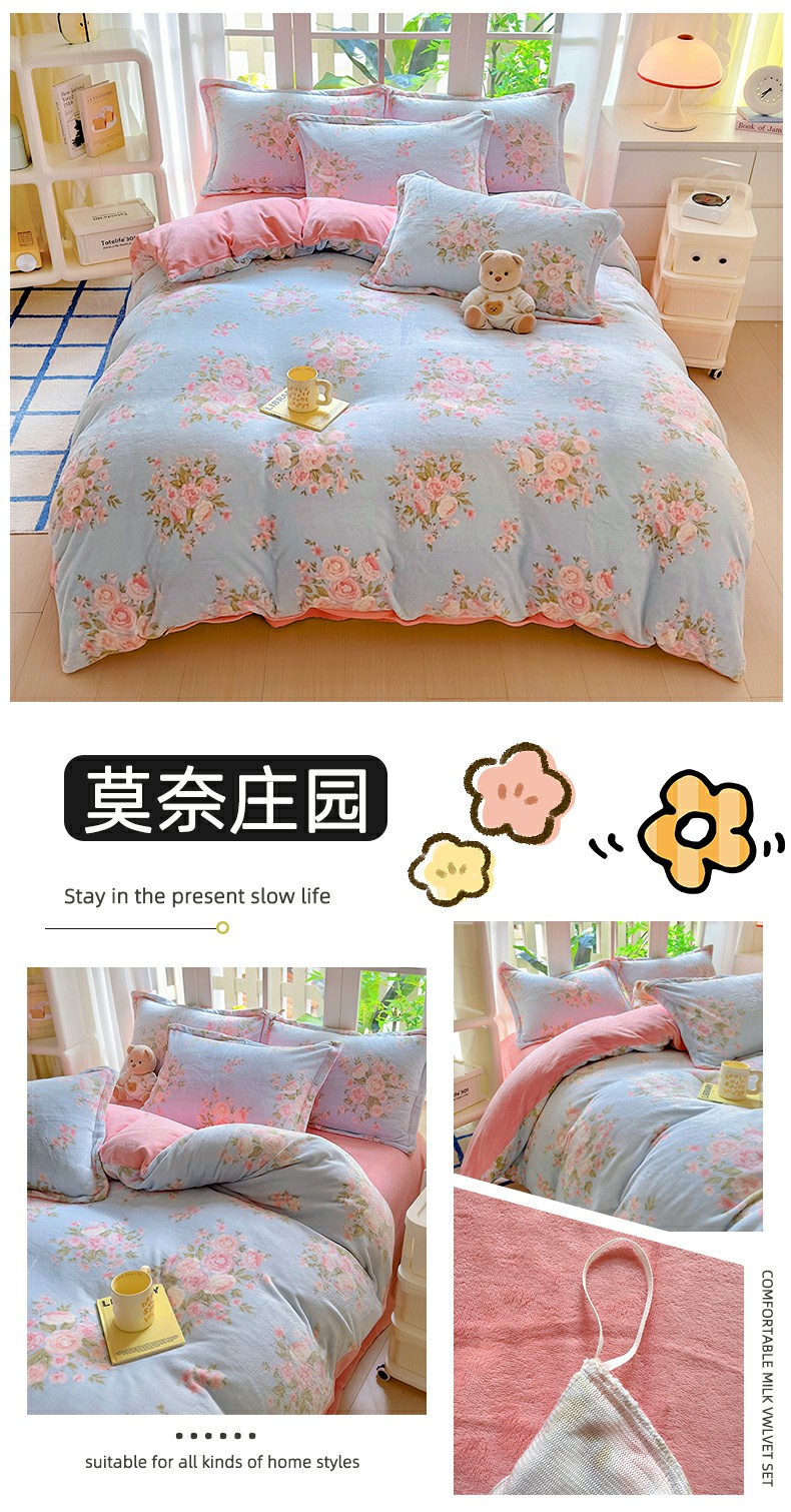 当前位置: 91家纺网 > 商品网购 > 床品套件 > 四件套 > 牛奶绒四件套 > 百寐 2024新款加厚A类牛奶绒印花卡通床单床笠四件套三件套 莫奈庄园