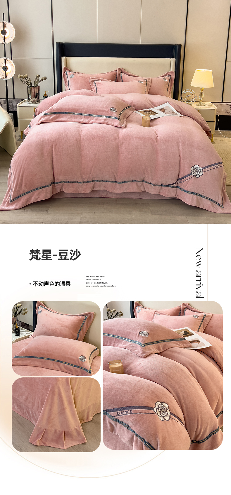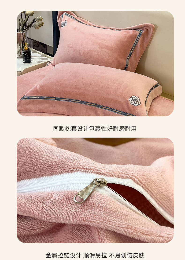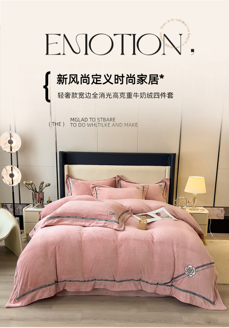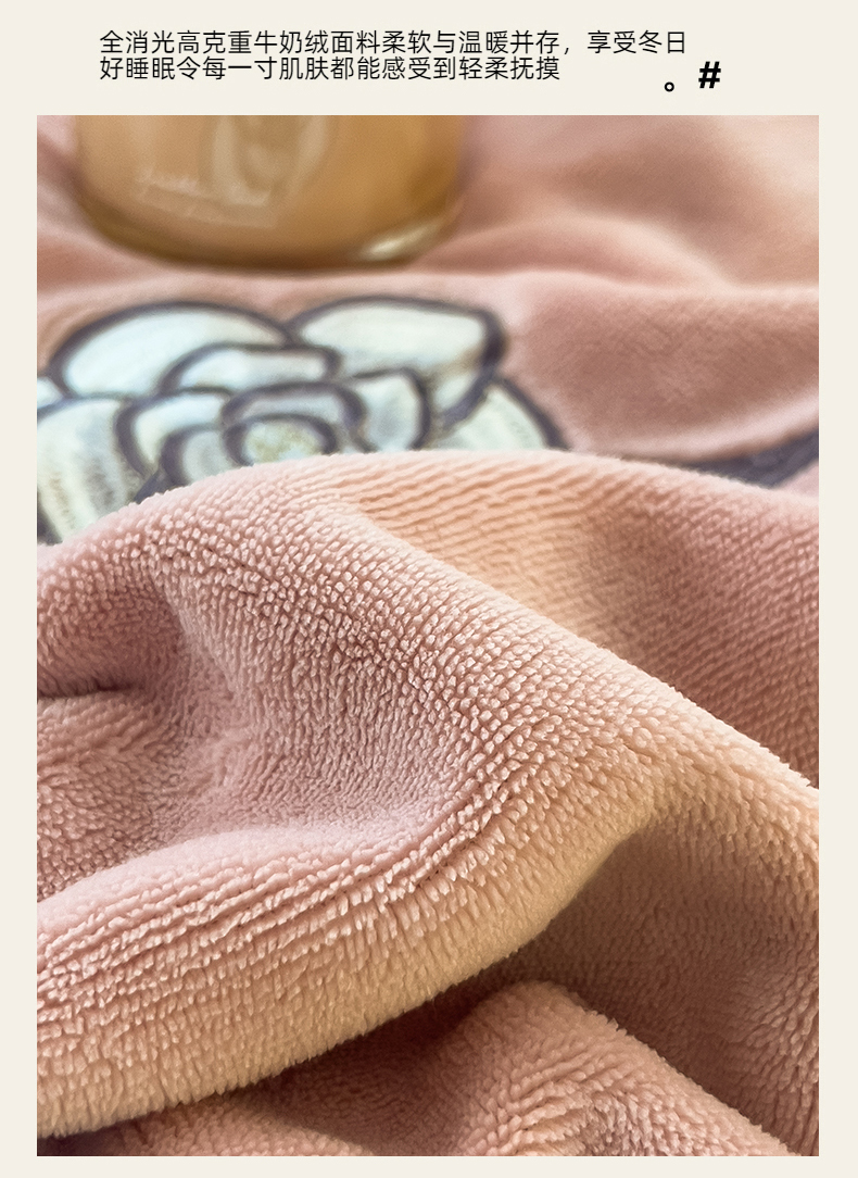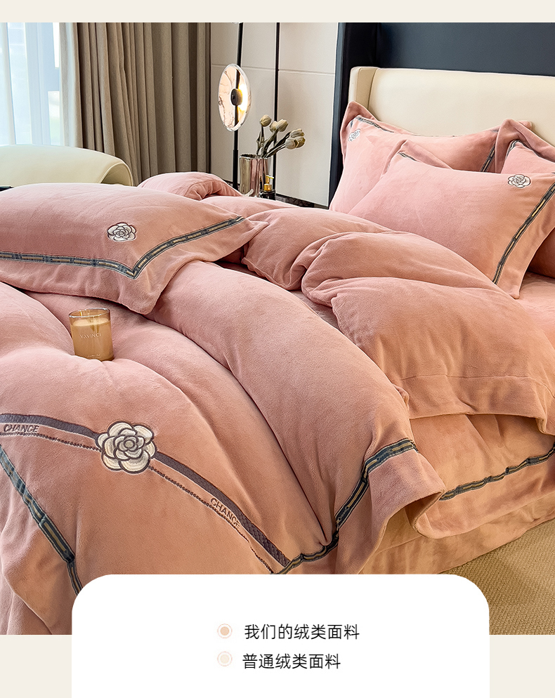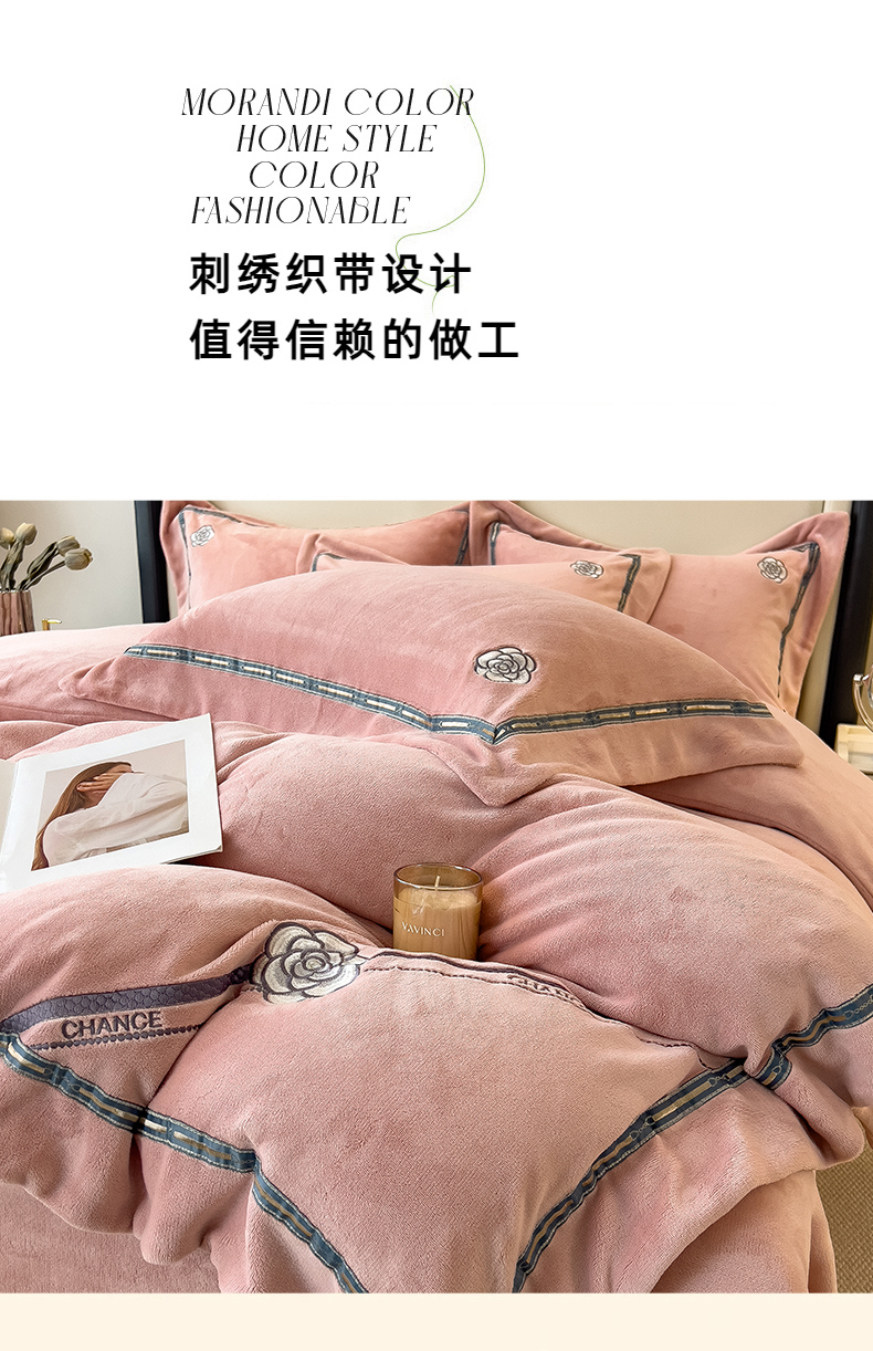 商品名称:金绣美居 2025新款全消光牛奶绒高克重加厚宽边绣花保暖四件套-梵星 豆沙