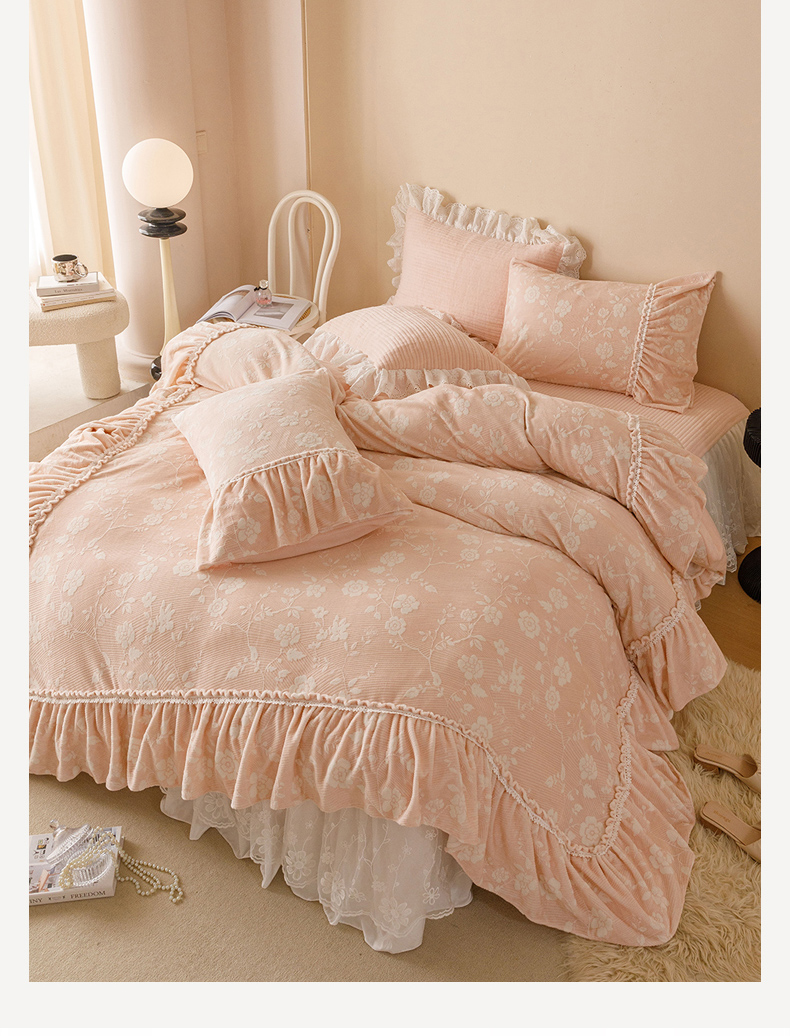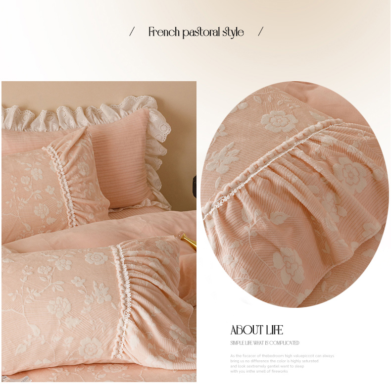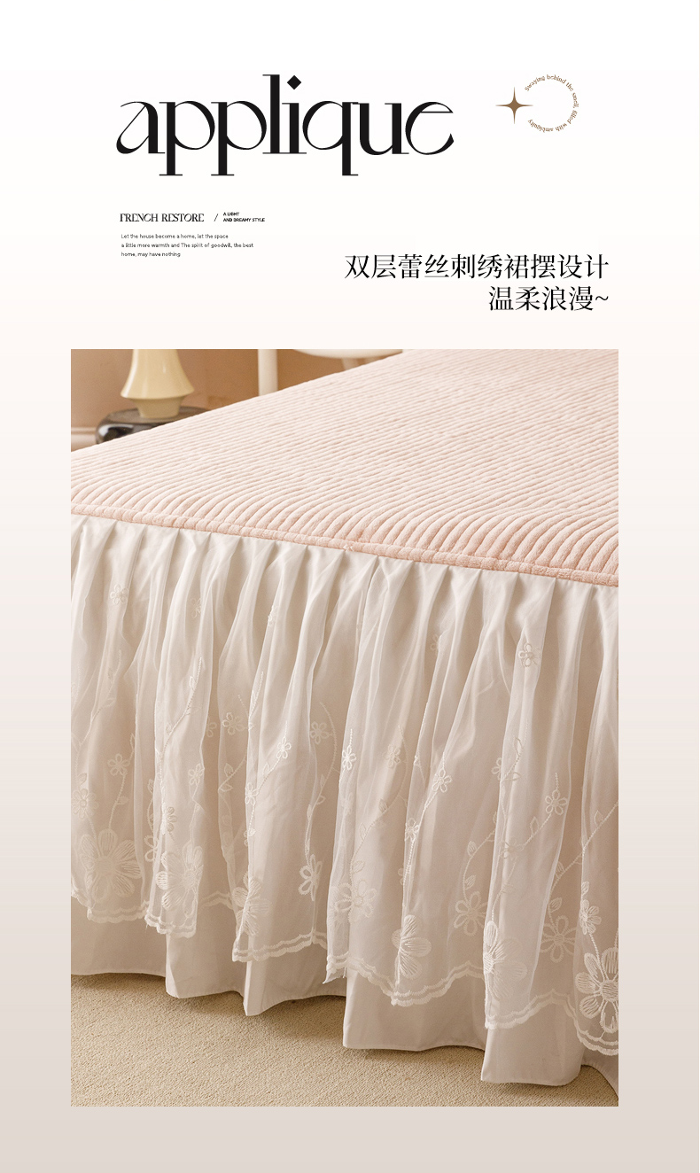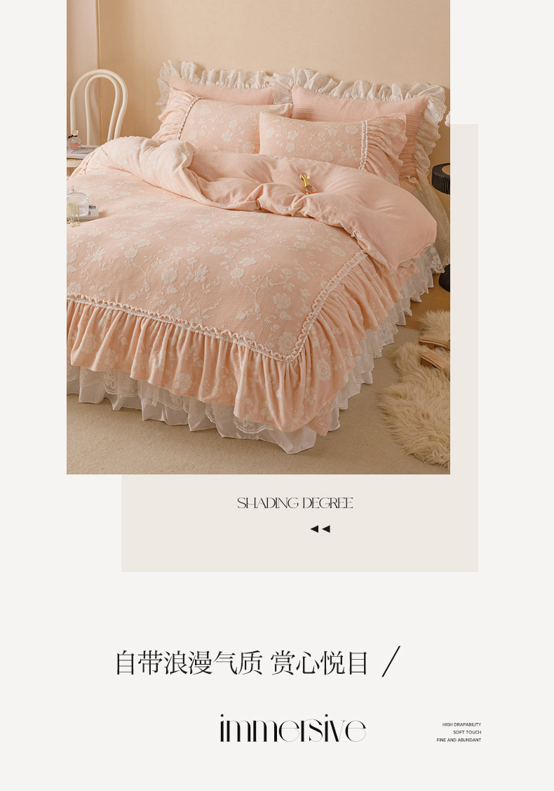 (总)胜权家纺 2024秋冬新款5D雕花着色牛奶绒法式奶油风夹棉床裙四件套
