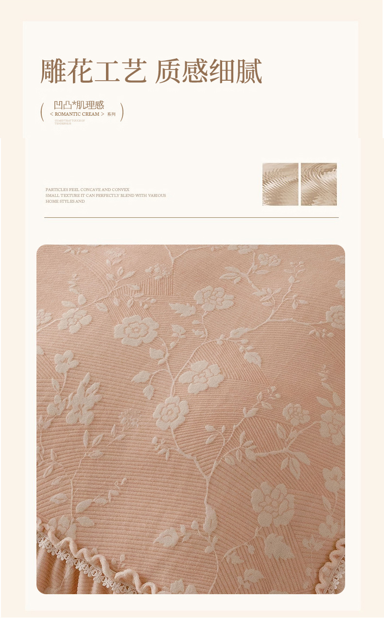 商品名称:(总)胜权家纺 2024秋冬新款5D雕花着色牛奶绒法式奶油风夹棉床裙四件套