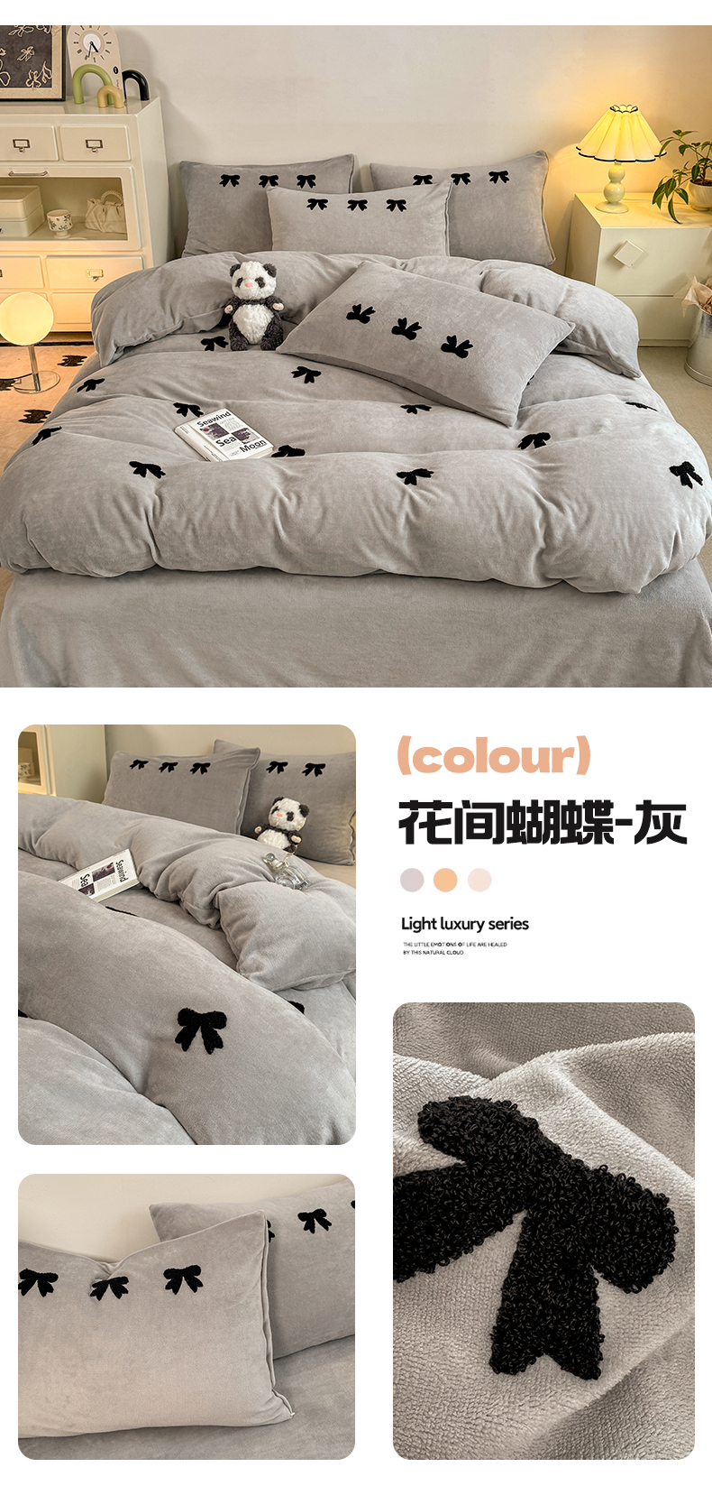 商品名称:首尔家纺 2024新款牛奶绒卡通毛巾绣蝴蝶结系列四件套 花间蝴蝶-灰
