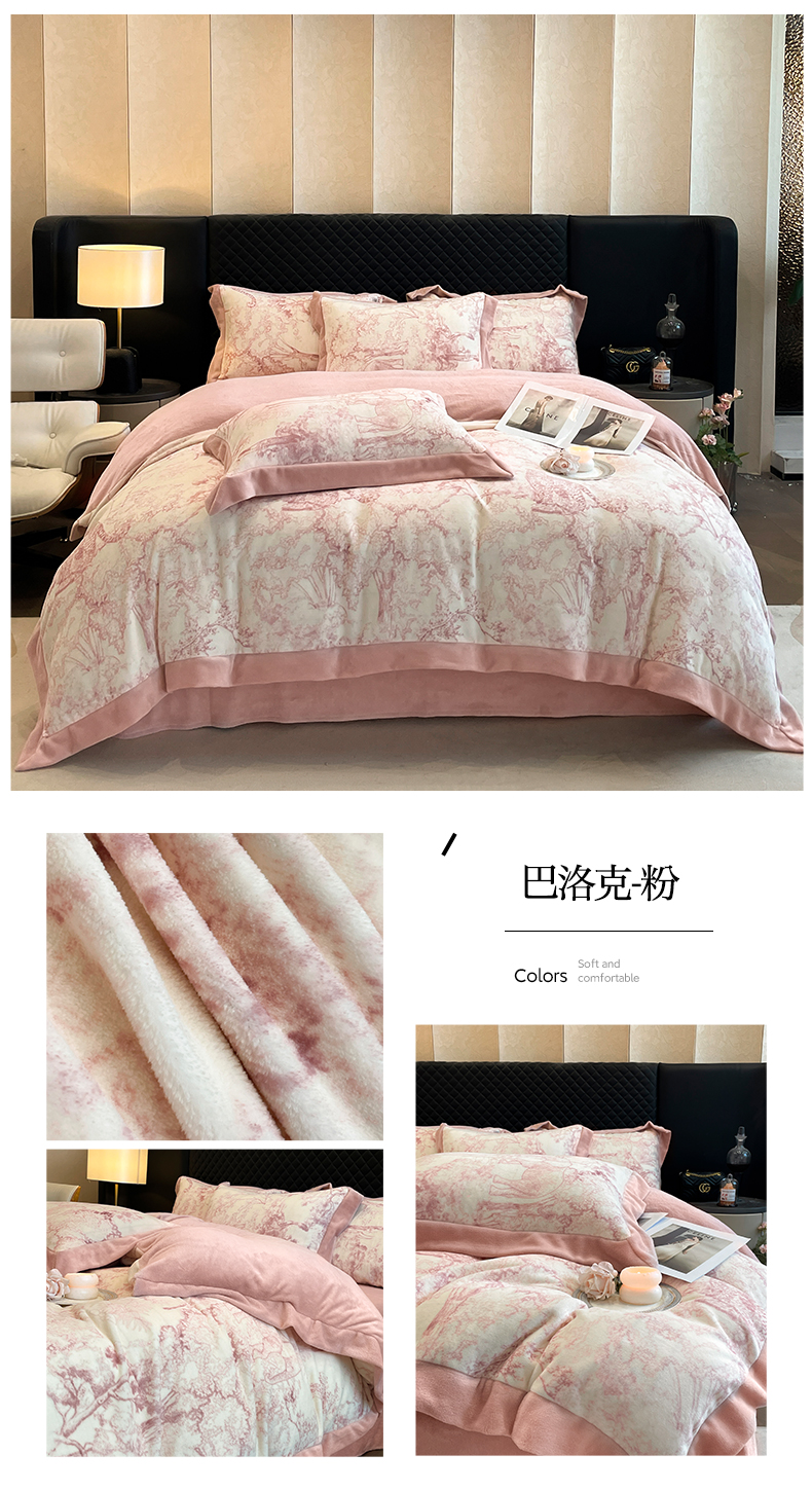 商品名称:首尔家纺 2024新款牛奶绒轻奢宽边法式印花四件套 巴洛克-粉
