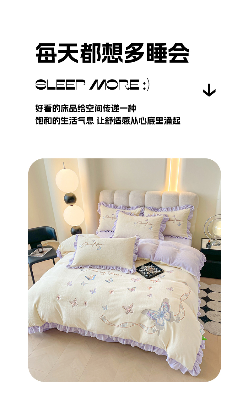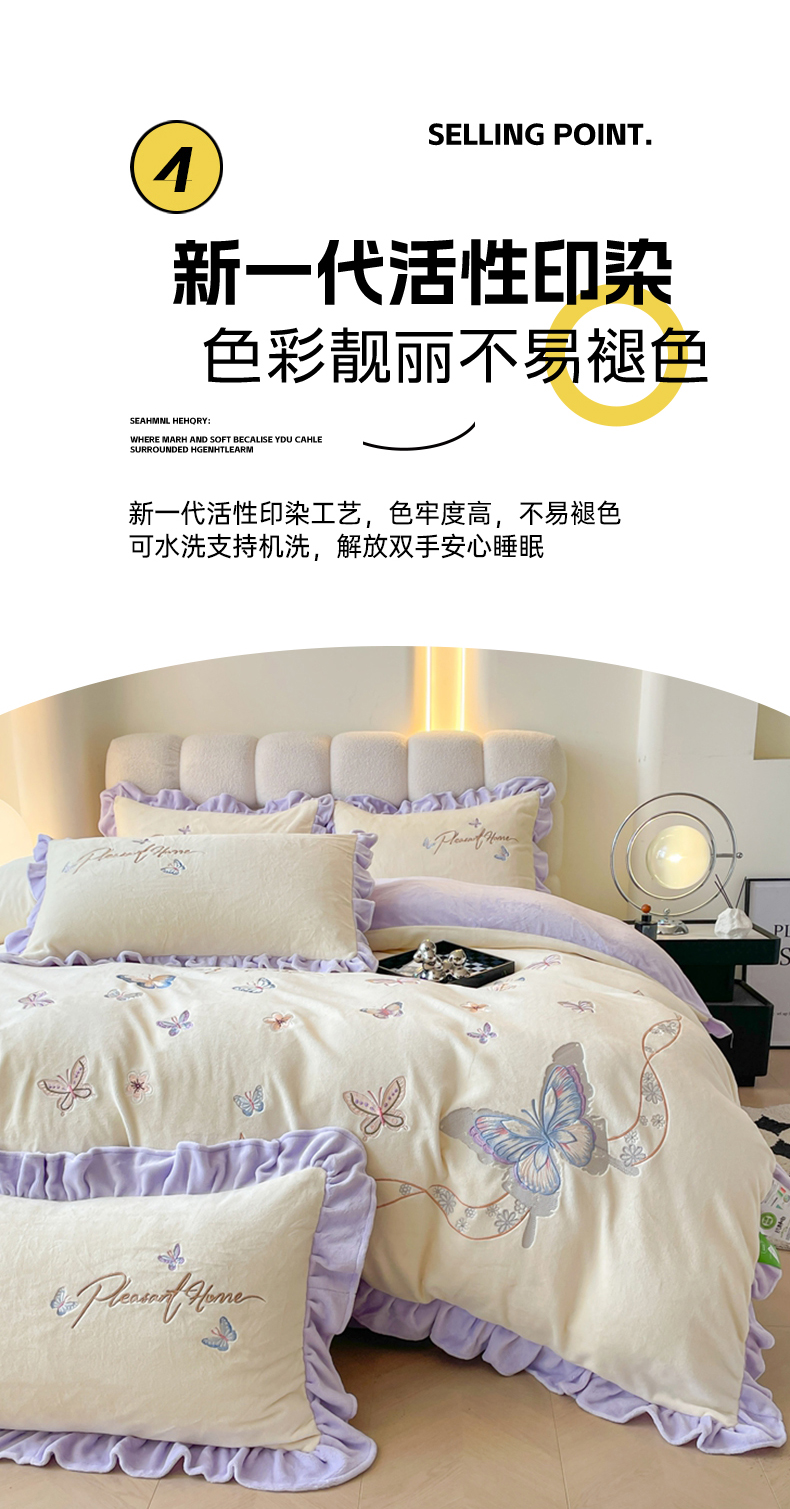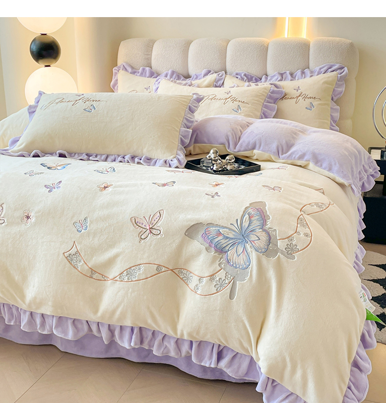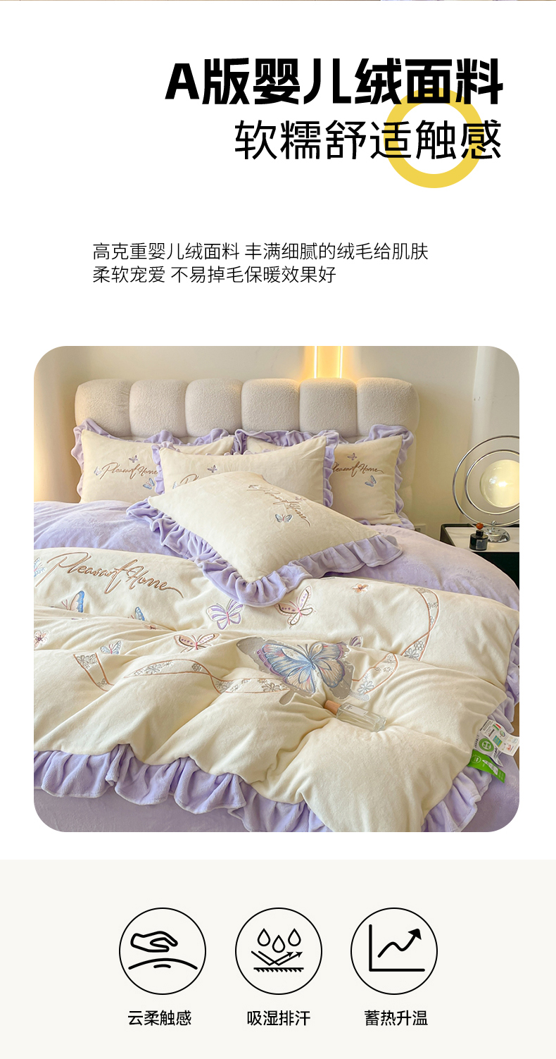 商品名称:金窝窝家纺 2024新款牛奶绒刺绣四件套-蝴蝶纷飞 蝴蝶纷飞-AB版紫