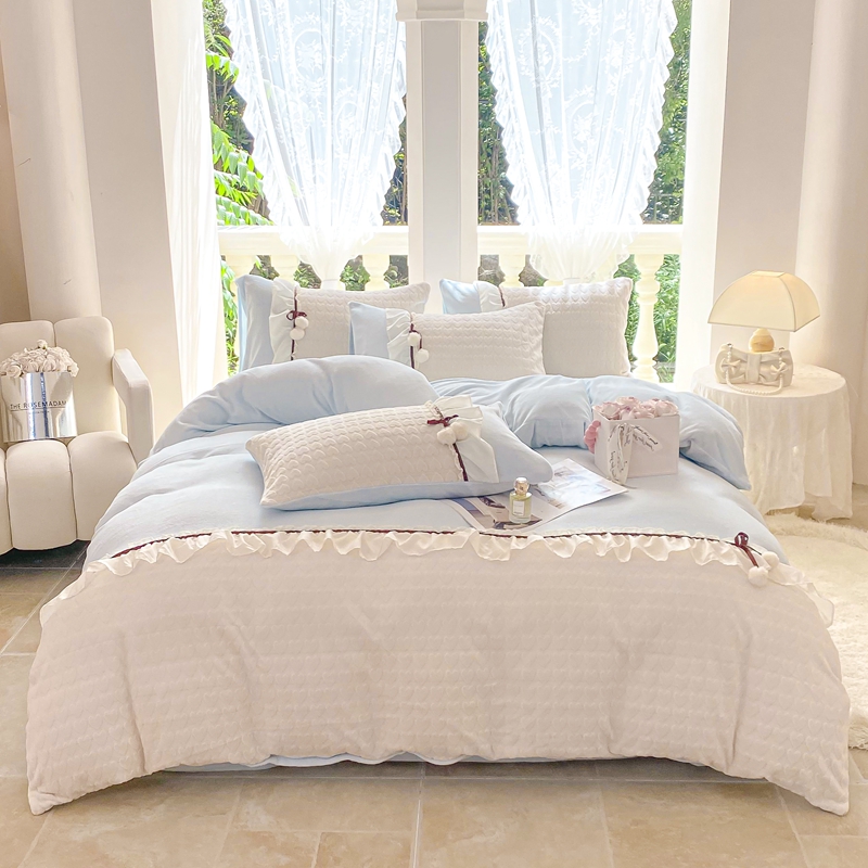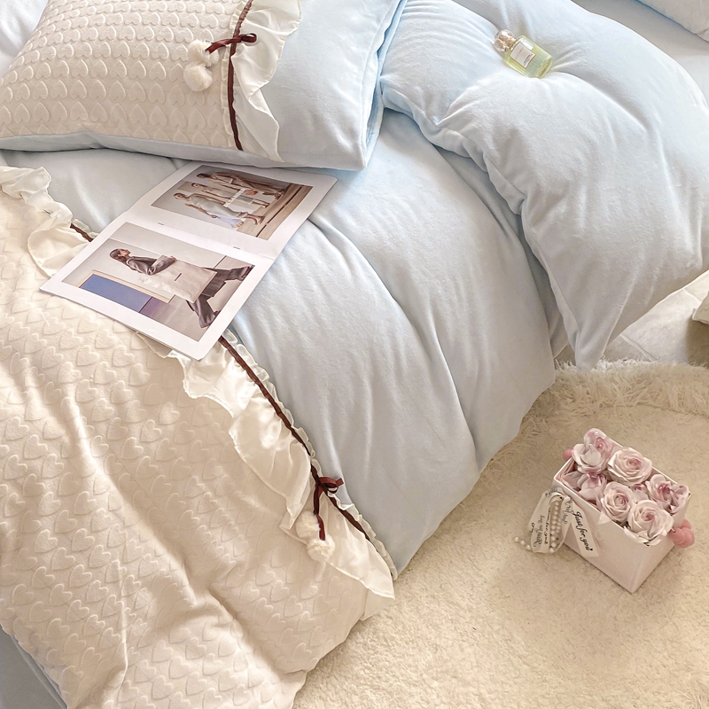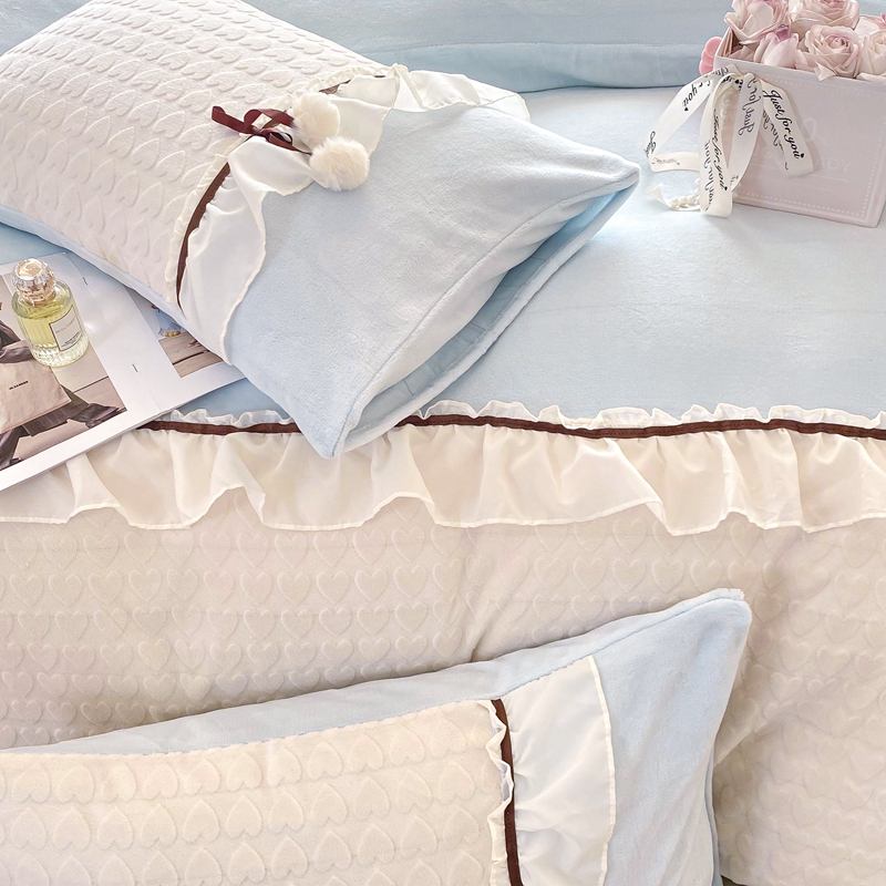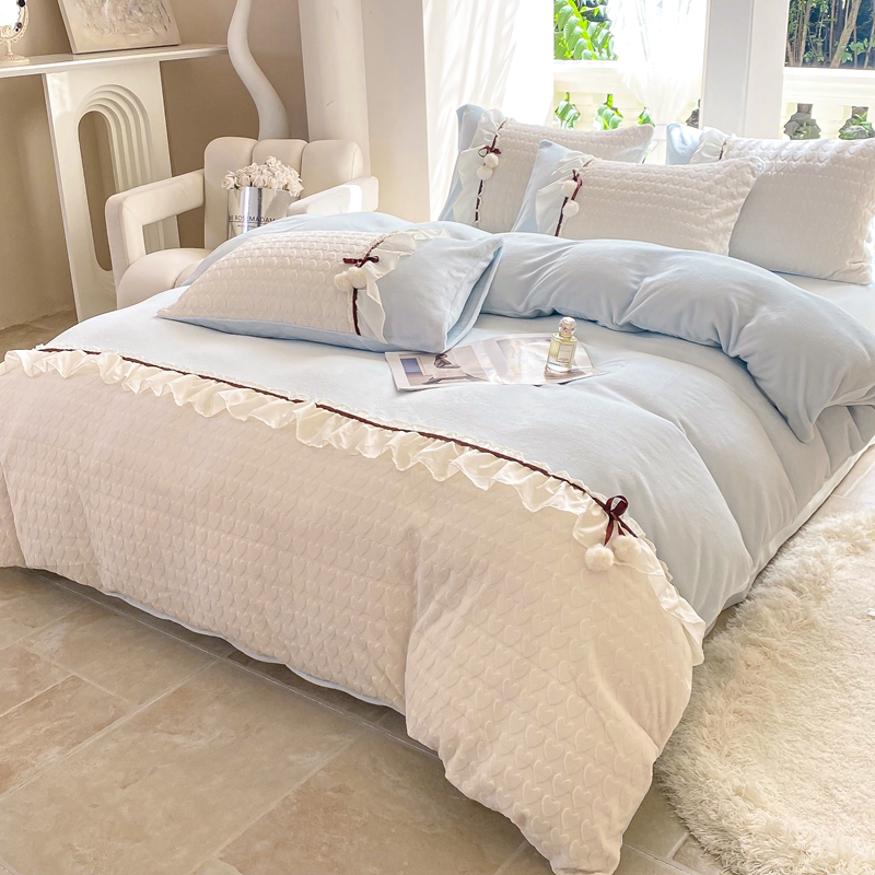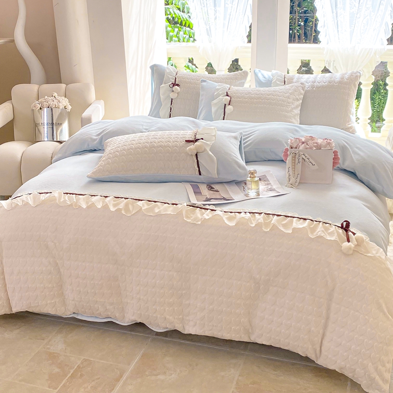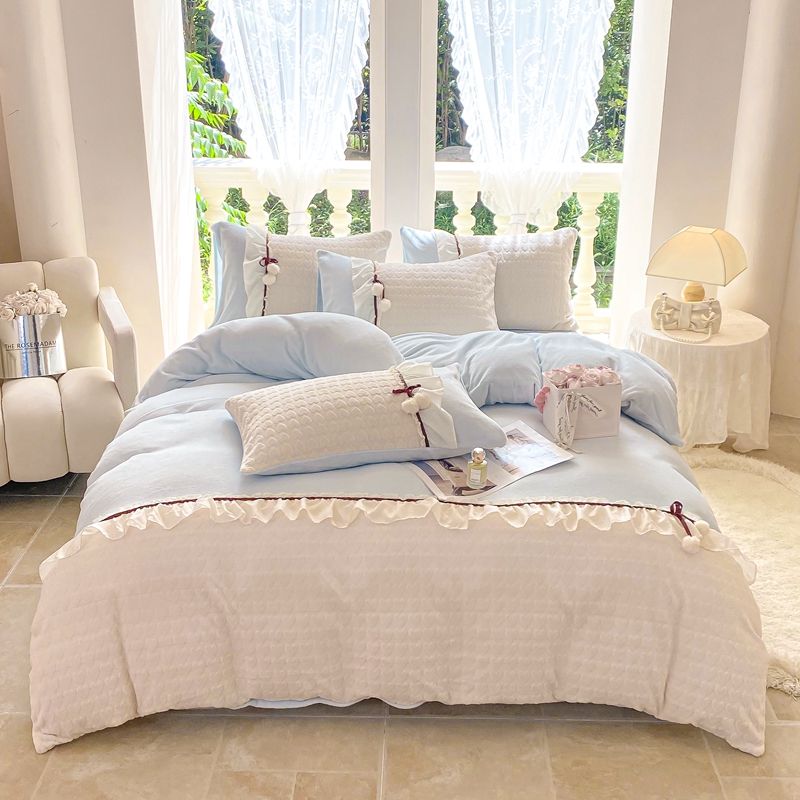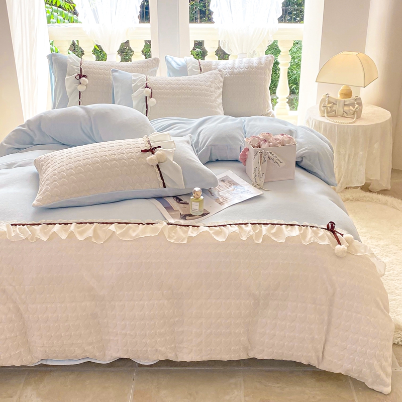 (总)二八年华 2025新款韩式花边款牛奶绒四件套,天蓝,豆沙,鹅黄,粉玉,水绿,鸢紫