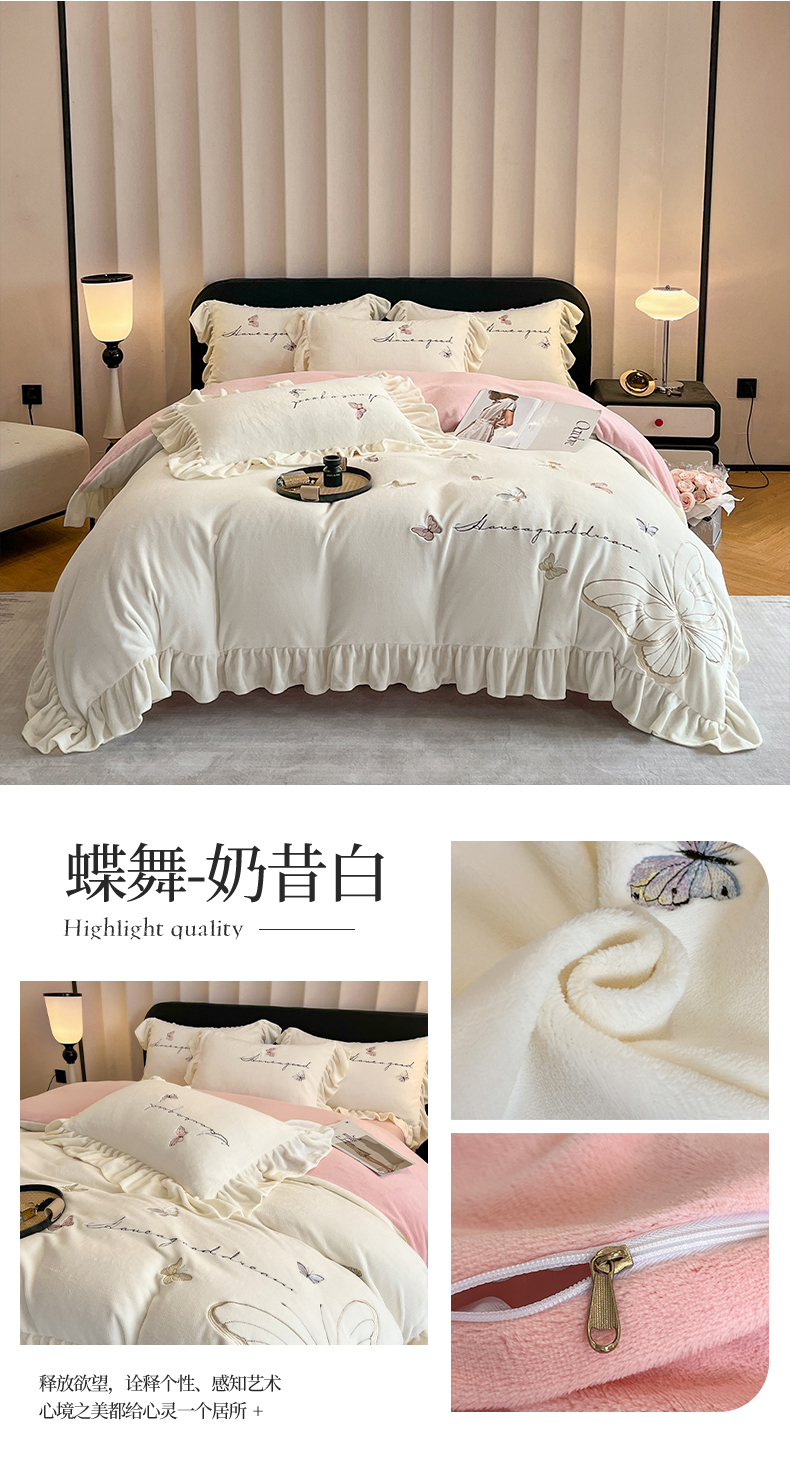 爱家(原缔乐家纺) 2024新款牛奶绒贴布绣四件套-蝶舞 蝶舞-奶昔白