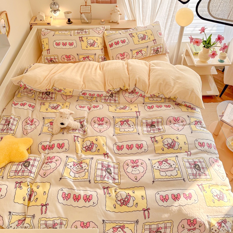 (总)呗旺鹿 2025新款卡通棉+绒牛奶绒棉绒四件套,心意满满,快乐魔法,闹钟麦田