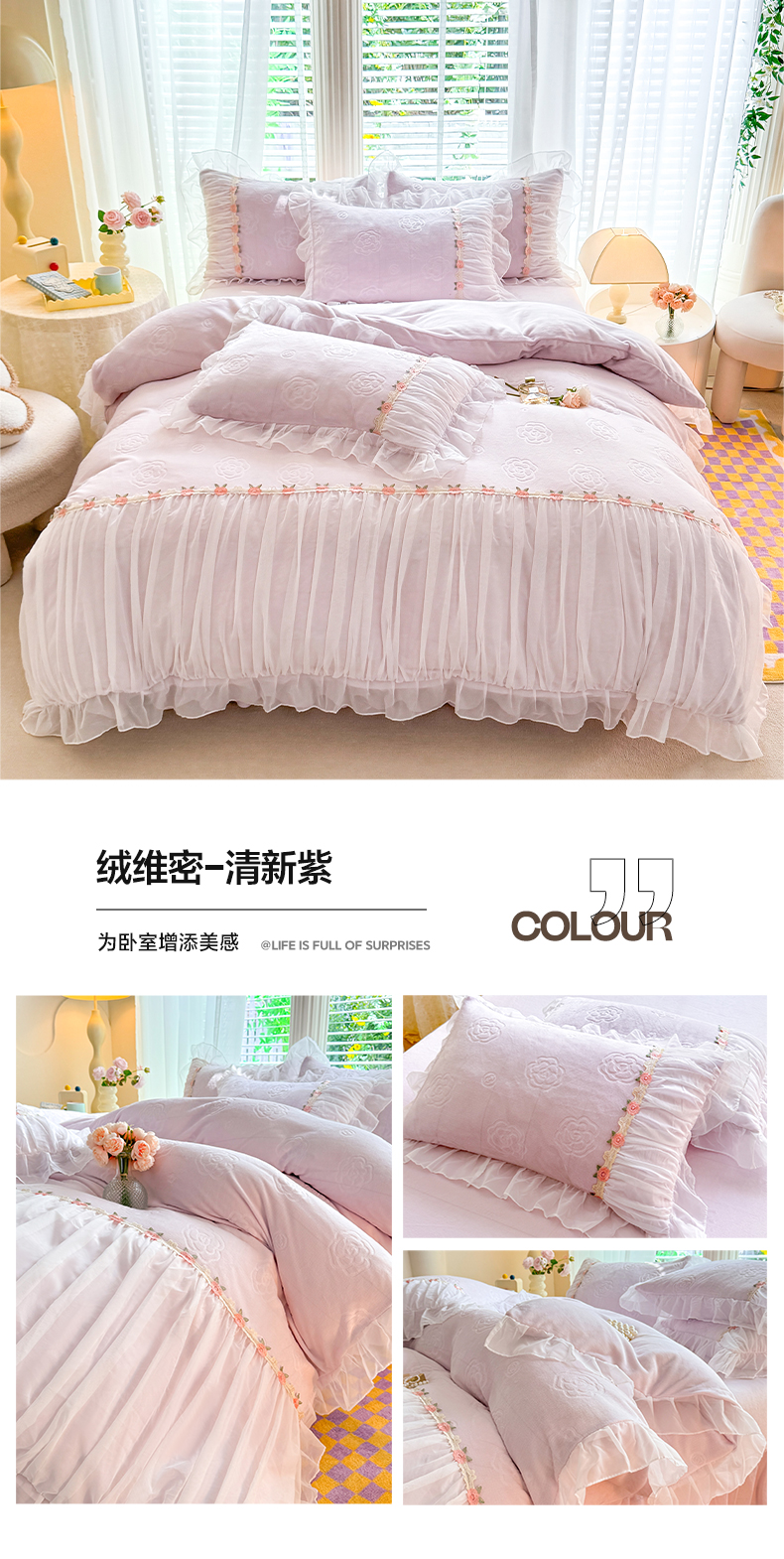 当前位置: 91家纺网 > 商品网购 > 床品套件 > 四件套 > 牛奶绒四件套 > 逸尚阁 2024新款雕花牛奶绒蕾丝花边四件套-维密 绒维密-清新紫
