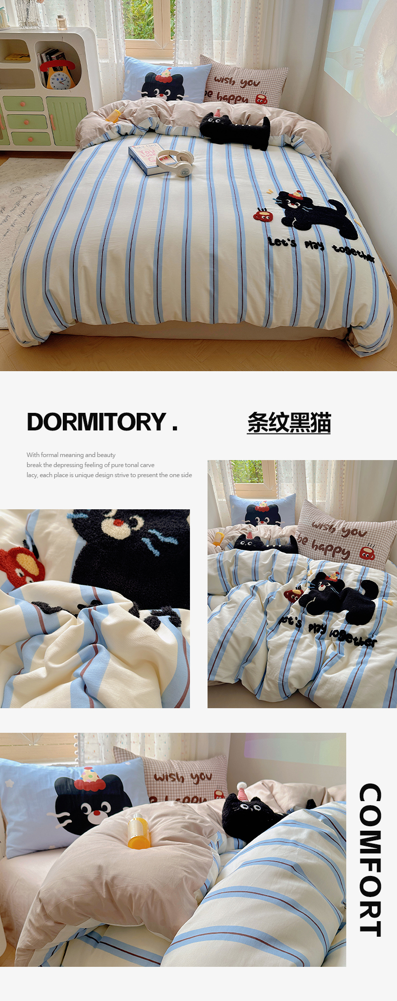 美乐迪家纺 2025新款全棉绣花毛巾绣四件套 条纹黑猫